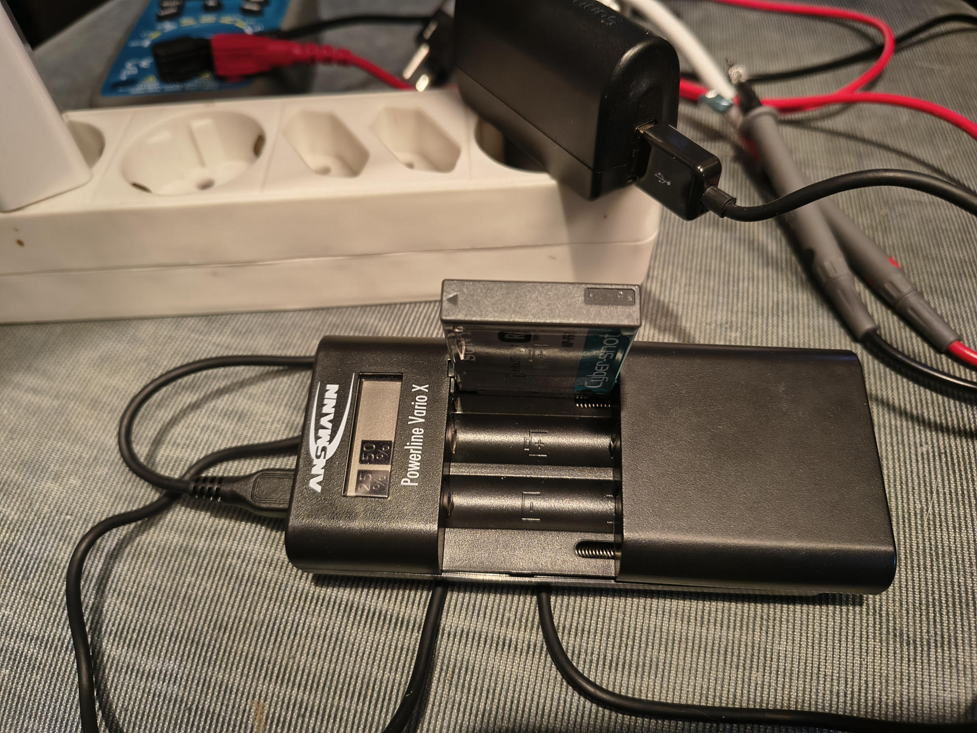 Man sieht: Ich vertraue dieser Technik nicht wirklich! Ich mein: Das Ding ist wirklich "universal" universal! Soll heißen: Polung und Spannung werden automatisch erkannt. Wie? Ich weiß es nicht. Ich habe es erstmal mit dem Messgerät überprüft. Scheinbar schickt es eine Wechselspannung in den Akku und überprüft dann, welche Welle wie stark zurück kommt? Keine Ahnung. Magie!