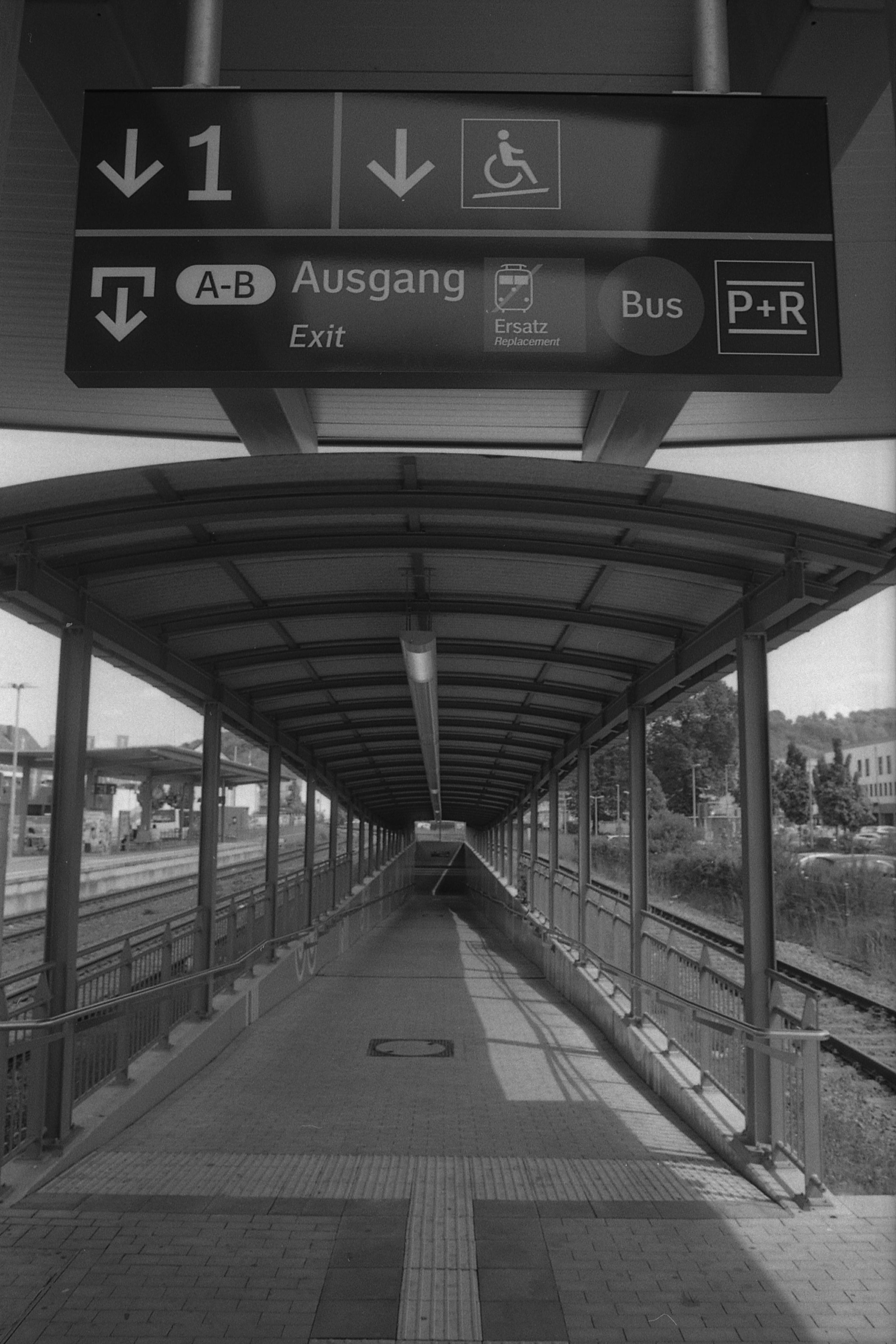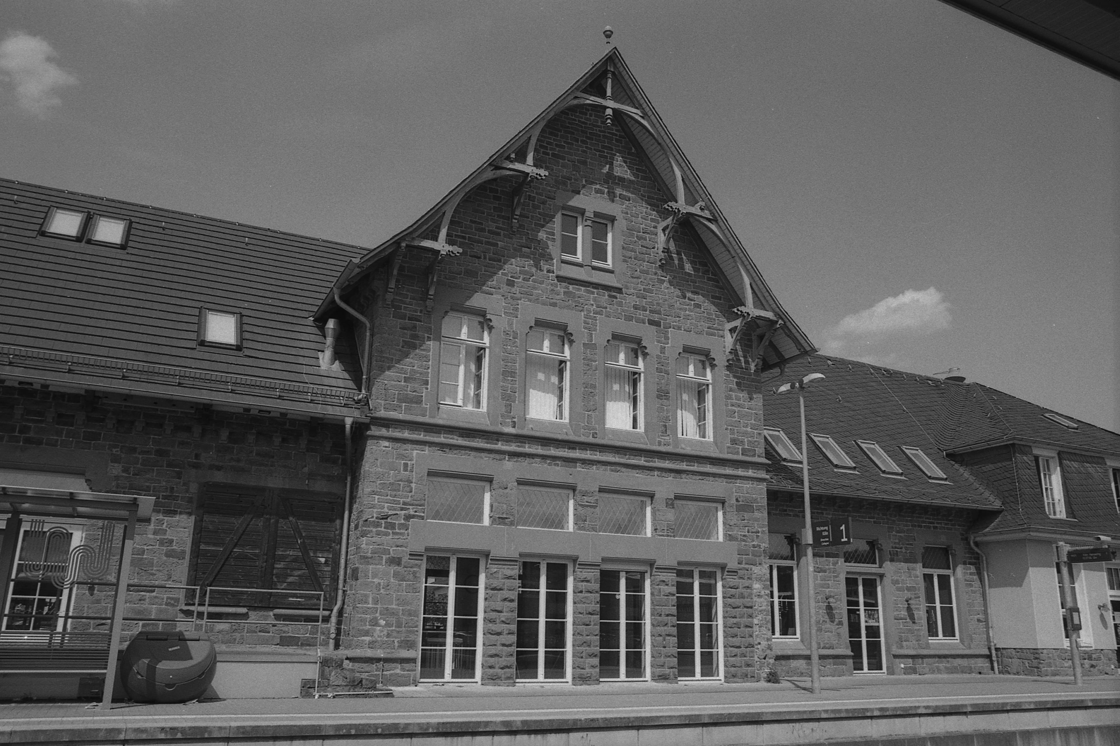 Da der Film dann auch schon bedenklich voll war und mir die Bilder schneller aus gingen als gedacht, habe ich nur noch diese beiden Kurzeindrücke vom Bahnhof: Einmal die Unterführung, die in s/w ganz gut rüber kommt, wenn auch schief, wie immer, und den Bahnhof, den ich beim besten Willen nicht mal mit dem 28er ganz drauf bekommen habe. Hier hätte das 20er für die Nikon vielleicht gerade so ausgereicht. Hm, das müsste ich auch mal ausgraben, das benutze ich viel zu selten!