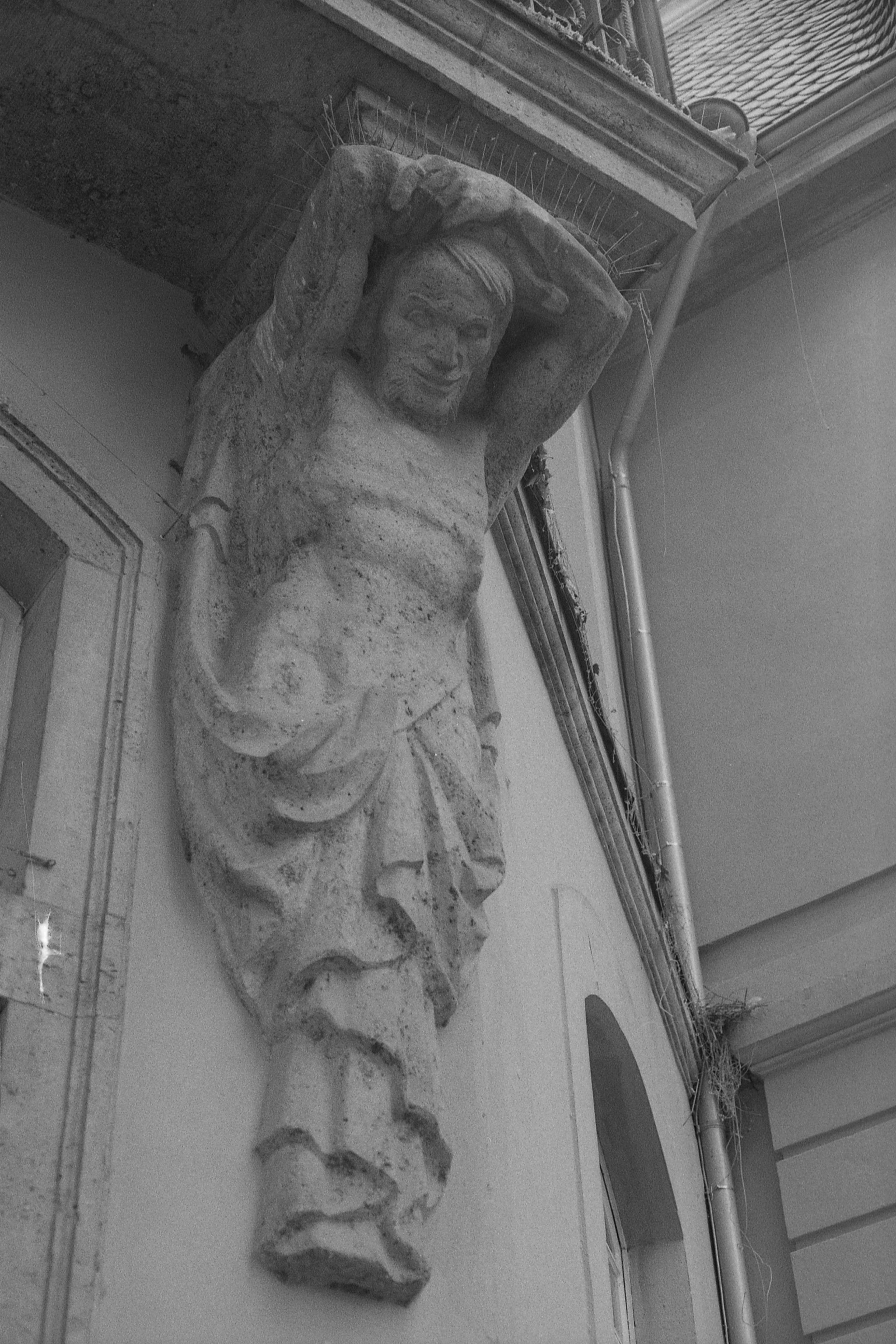 Über dem Einfang zum ehemaligen Studentenbüro (jetzt ist da glaube ich irgendwo die Zahlkasse) findet man diesen Atlanten, der den Balkon hoch hält. (50mm, 1/125s, f/4.) Ist mir früher nie aufgefallen, dass der dieses sanfte Lächeln im Gesicht hat, obwohl er eine eher schwere Last auf dem Rücken mit sich rum tragen muss.