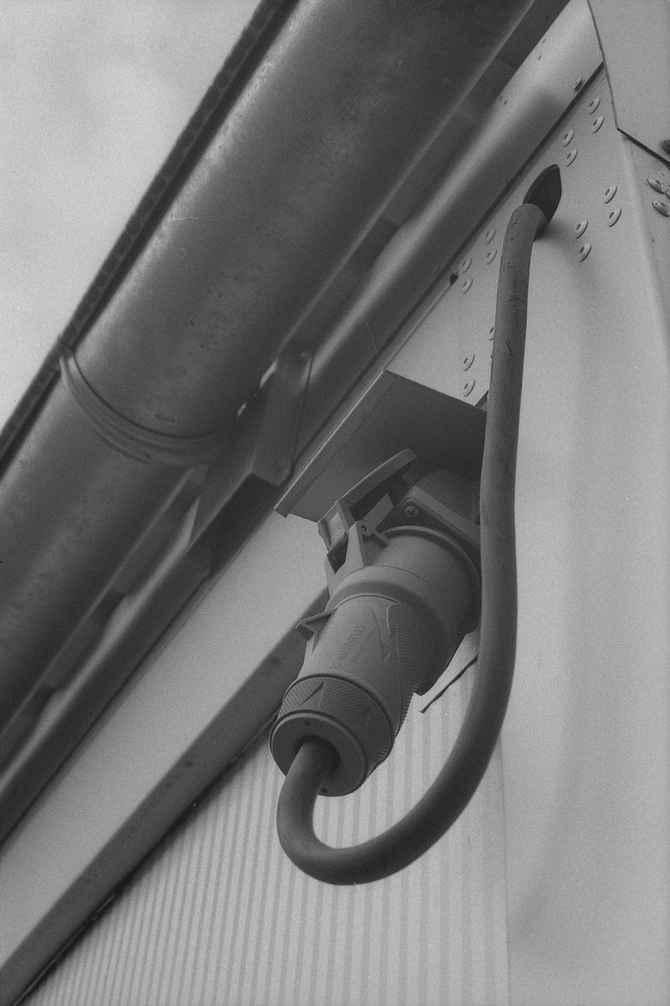 Immer auf der Suche nach dem ungewöhnlichen Winkel und dem seltsamen Subjekt, habe ich dann diesen Starkstromstecker mit genommen, der die Mensaküche mit Energie versorgt, nehme ich an, zumindest. (50mm, 1/250s, f/9,5.) Da waren sie wieder, die f/9,5, die die Halbautomatik so gerne nimmt. Passt aber hier auch ganz gut. Hätte vielleicht sogar noch ein bisschen mehr sein können, denn das unscharfe Kabel stört mich tatsächlich ein kleines bisschen. Aber: Wenn die Auflösung des Films ein bisschen höher wäre, könnte man auch noch lesen, was auf dem Stecker drauf steht, wer den hergestellt hat.