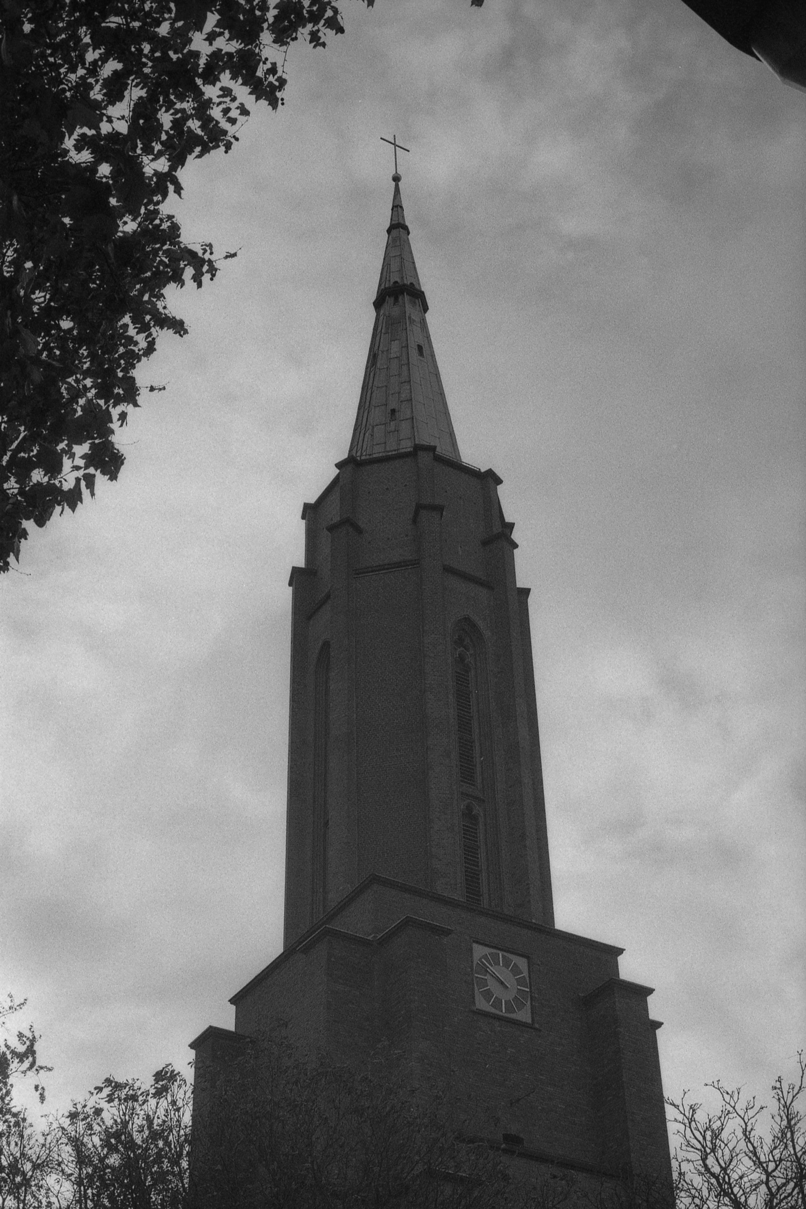 Noch mal der Kirchturm, dieses Mal mit direkter Sonne im Bild und trotzdem nur mit minimalem Lens Flare. (50mm, 1/1000s, f/16.) Ganz schick so. Erstaunlich, dass das kein Loch in den Film gebrannt hat.