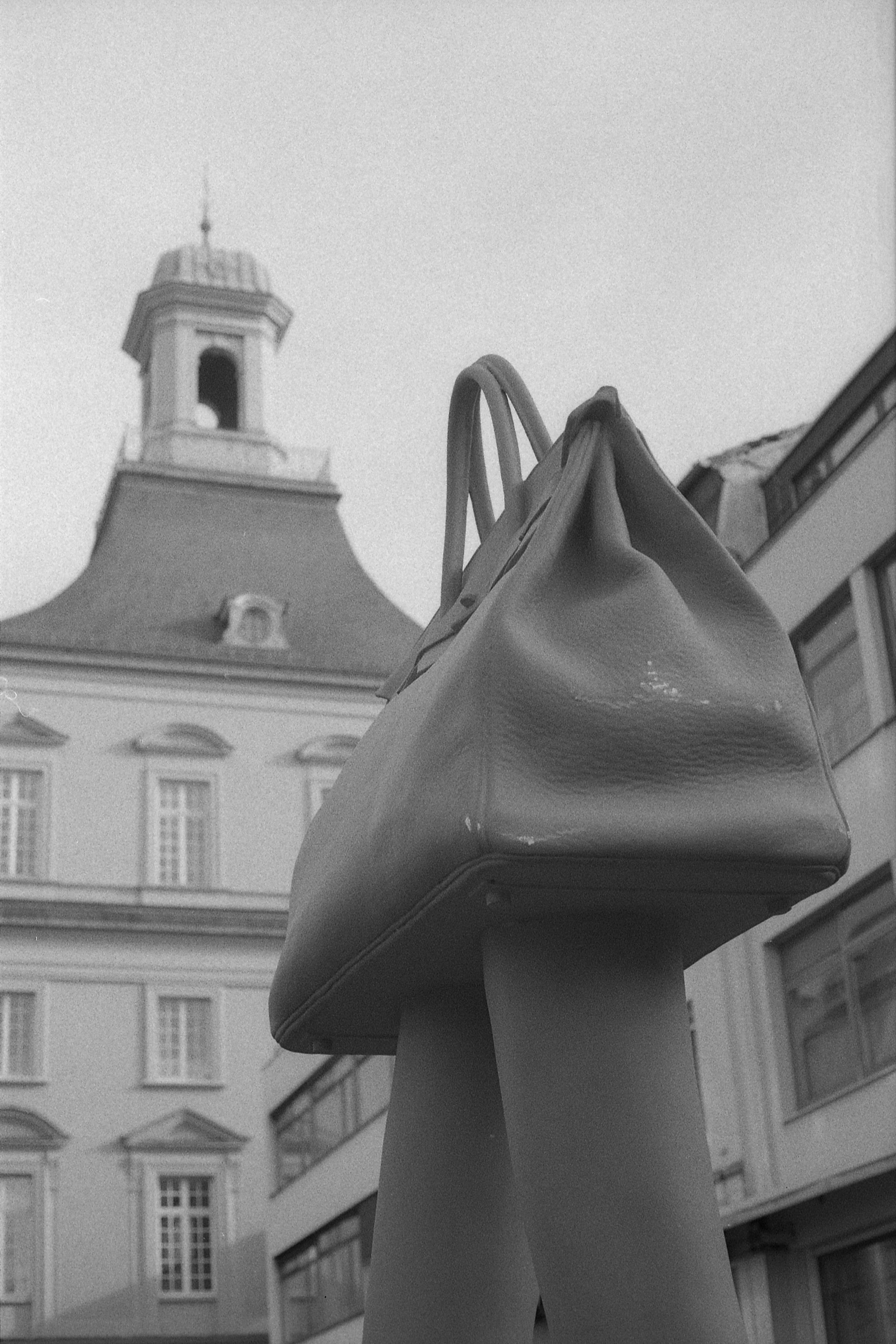 Ich mein, welche anders Spezies käme auch auf die Idee, eine überdimensionierte, wandelnde Handtasche mitten in die Stadt zu stellen? (Kunst!) (50mm, 1/1000s, f/4.) Immer, wenn ich an dem Ding vorbei komme, muss ich einfach ein Foto machen, weil das so surreal ist. Ich mein, in s/w kommt auch diese knallorange Farbe gar nicht rüber! Ich weiß nicht, ob wir hier ein Konsumkritik haben oder nur einfach einen Künstler mit einem seltsamen Sinn für Humor, aber ich bin dabei!