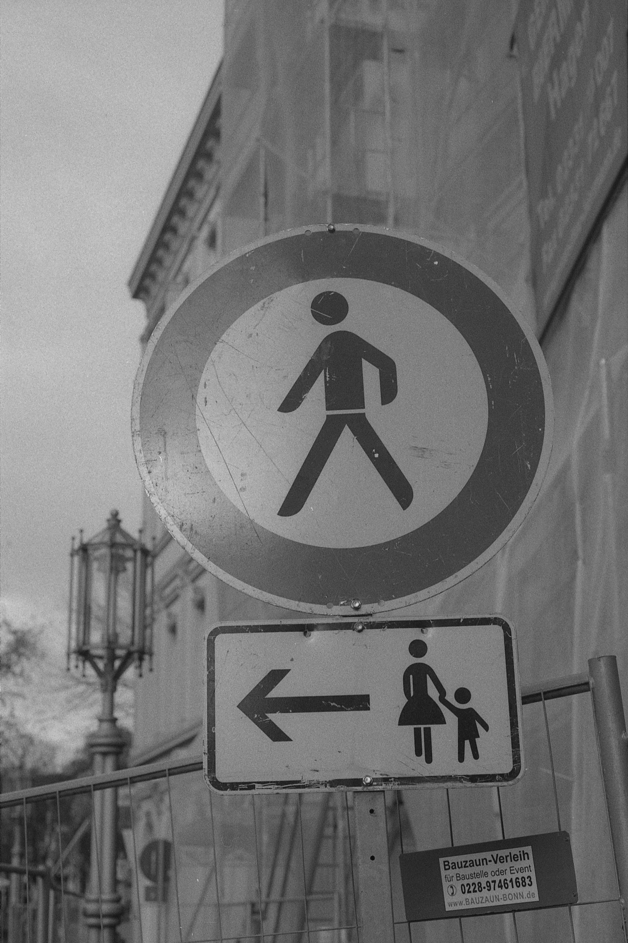 (50mm, 1/1000s, f/6,7.) Ich weiß ja auch nicht, was ich mit Schildern habe. Ist so ein Ding. Dieses hier ist aber besonders gelungen, finde ich: Schicke Halb-Unschärfe im Hintergrund. Und das Licht der trüben Sonne spiegelt sich im Fußgänger-Verboten. Gut.