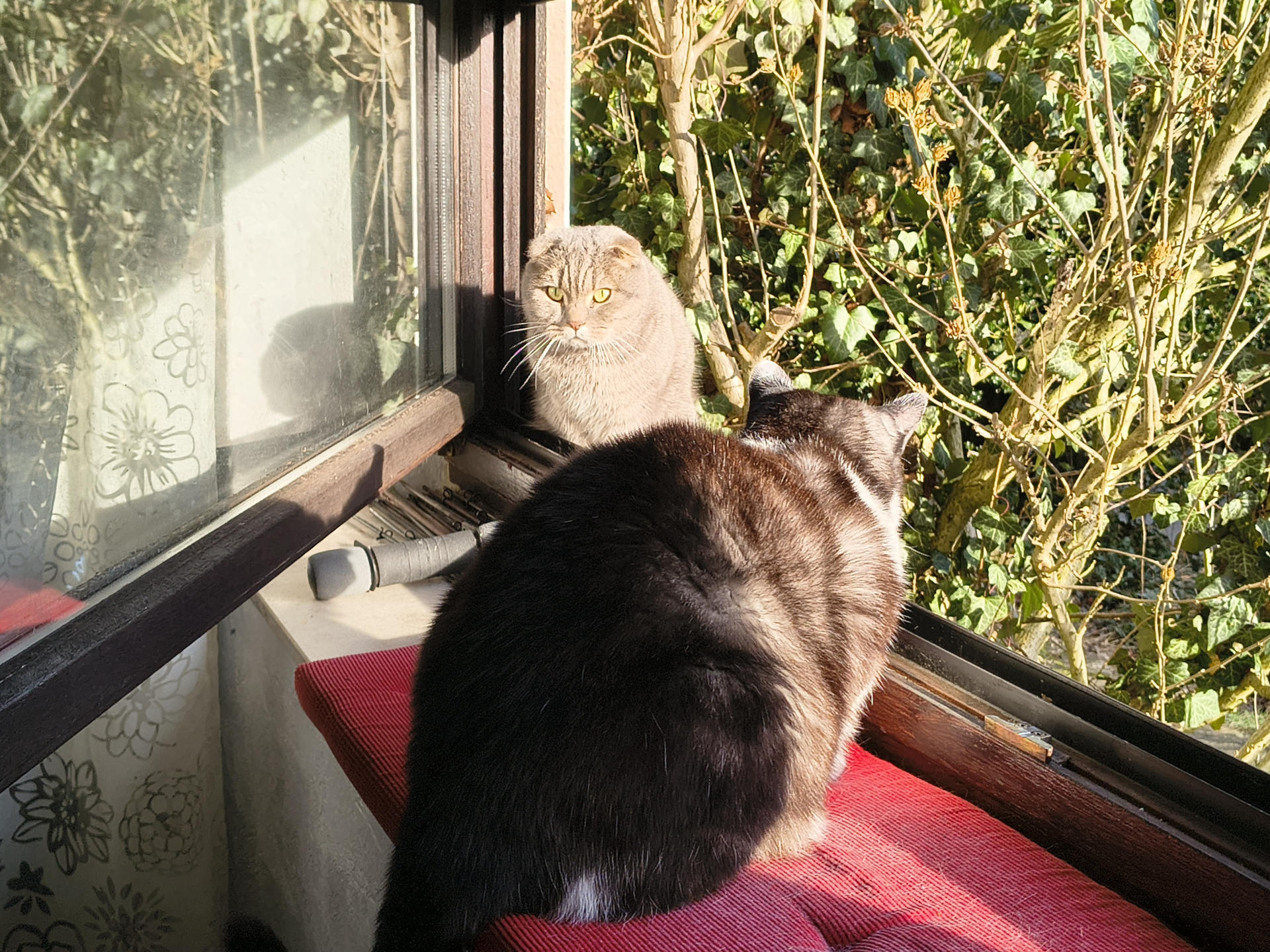 Ich muss mal kurz dazwischen schieben, dass der Sockenkater in letzter Zeit immer seinen Kollegen mit den Knickohren anschleppt! Wir können aber echt keine zweite Katze aufnehmen, schon gar nicht von den selben Nachbarn, da kriegen wir dann endgültig Streit!