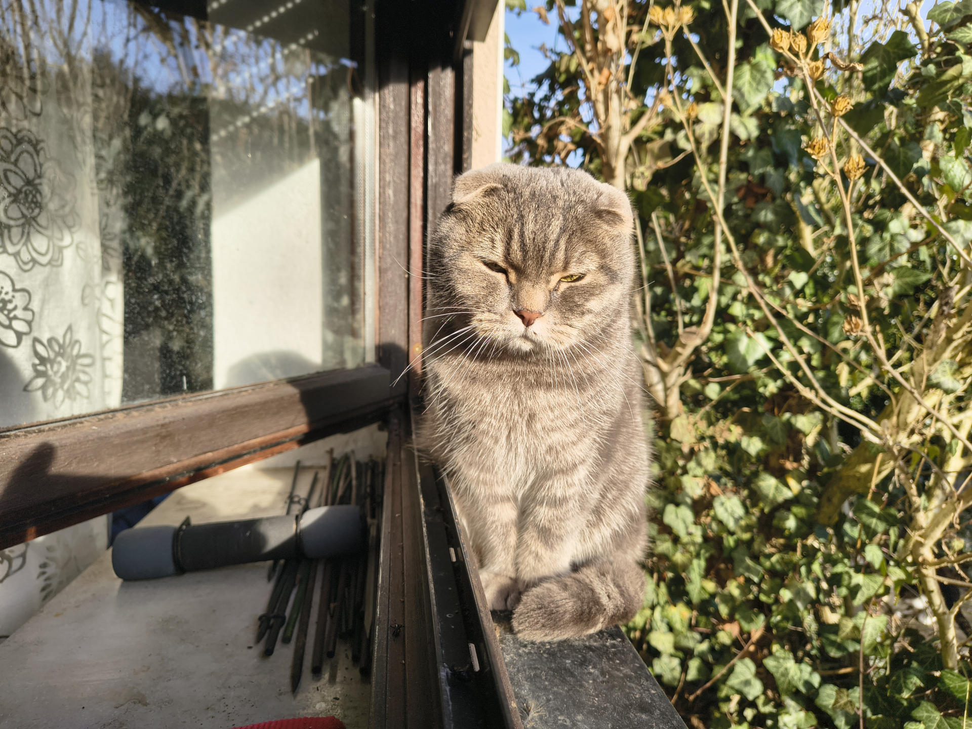 Sieht ja schon ein bisschen seltsam aus, mit den eingeknickten Ohren. Aber ansonsten ein ganz hübsches Tier, das auch gar nicht mehr so schreckhaft ist wie früher. Nachdem die zwei sich nicht mehr ständig begegnen, scheinen auch beide einander nicht mehr ganz so abgeneigt zu sein. Am Anfang habe ich die Socke ja öfter dabei gesehen, wie sie ihn (und andere Katzen) verdroschen hat, was man dem Schmusekater ja gar nicht zutraut. Andererseits traut man dem auch nicht zu, dass er ständig Mäuse und Vögel anschleppt, tut er aber trotzdem!