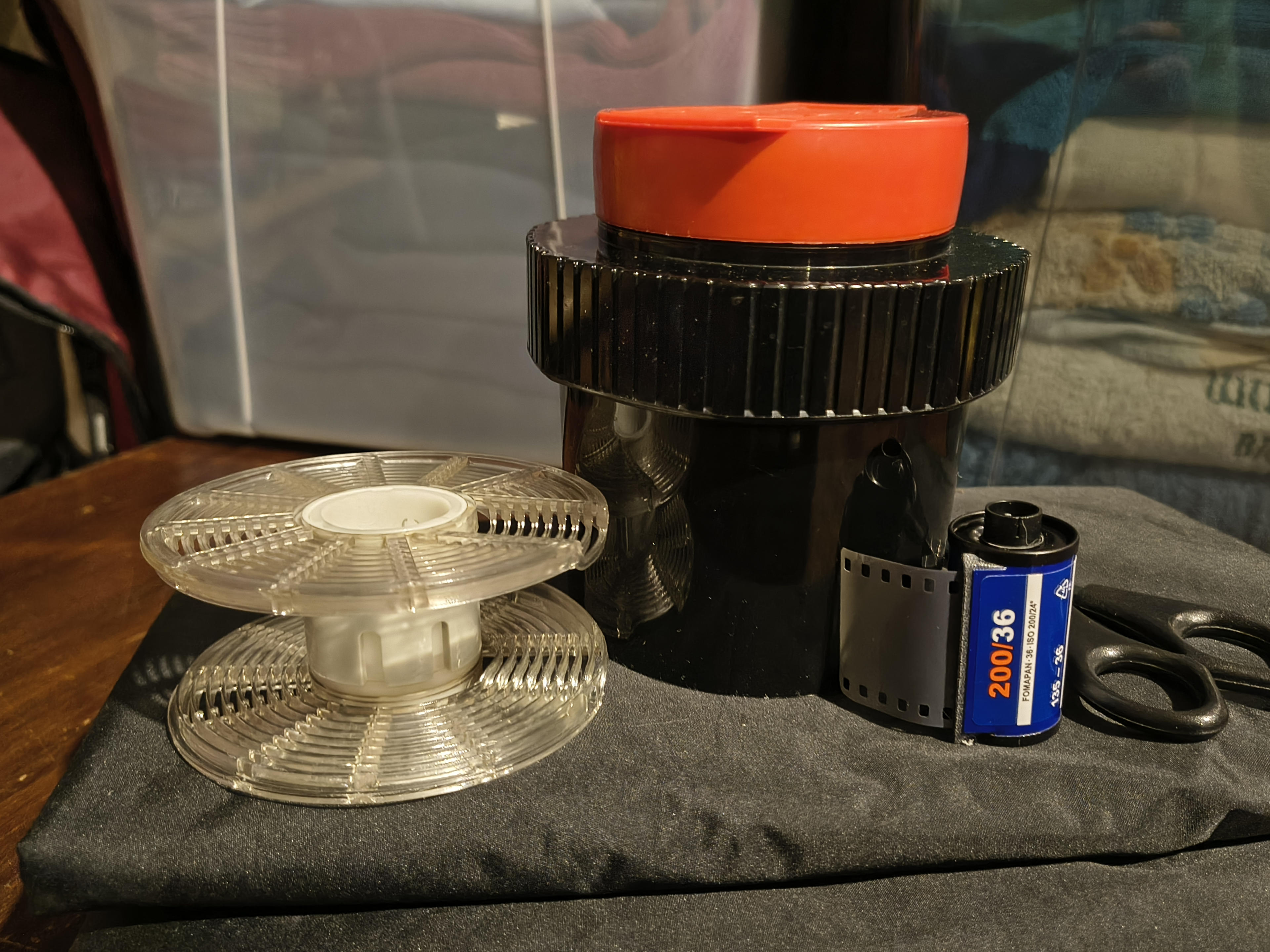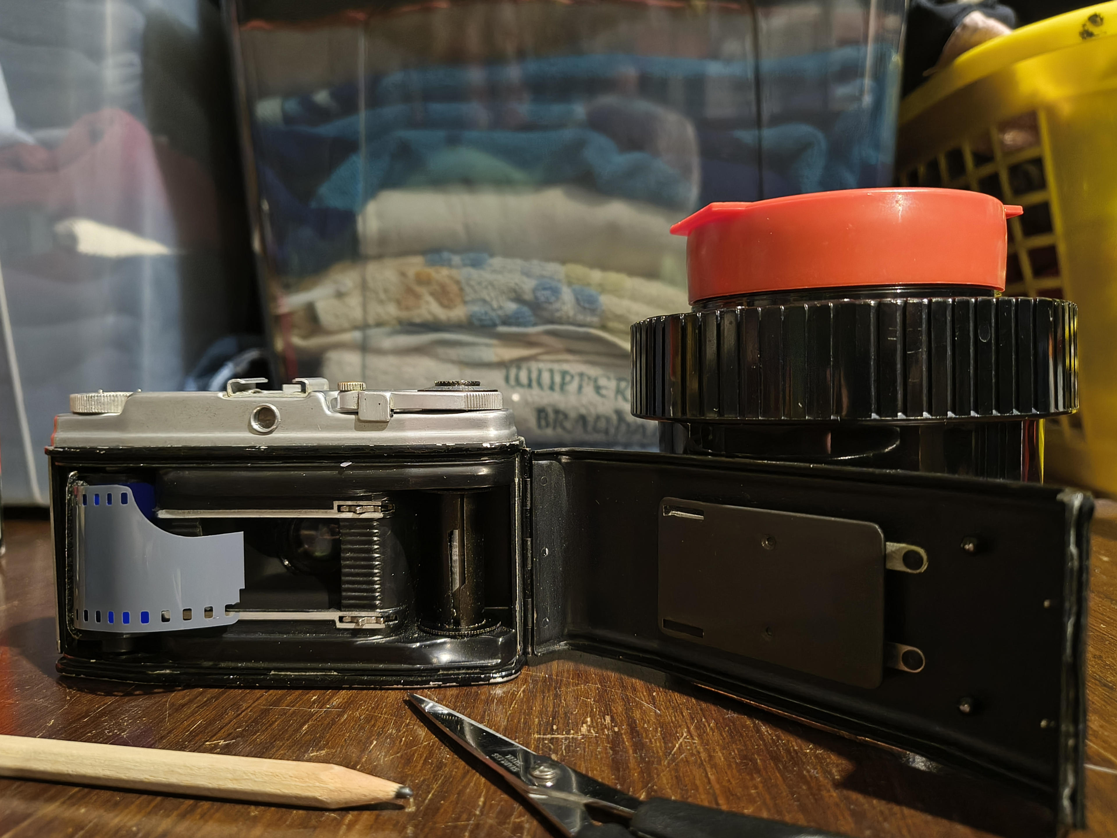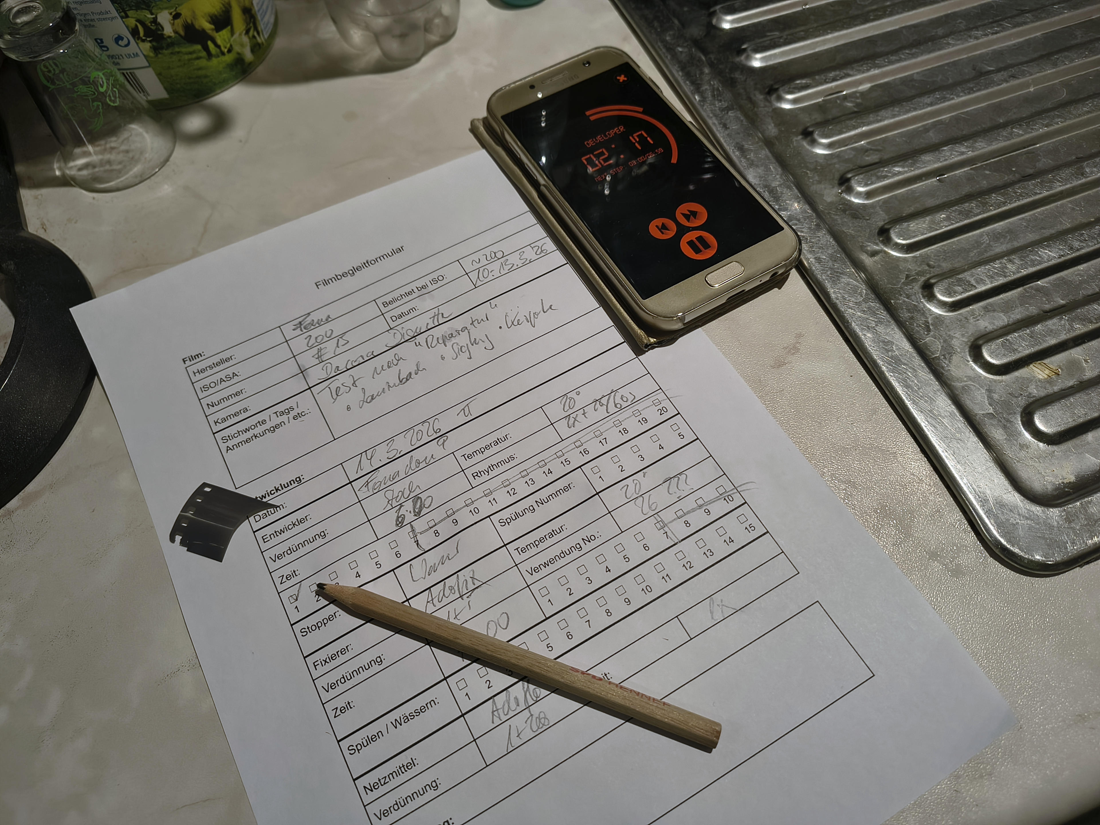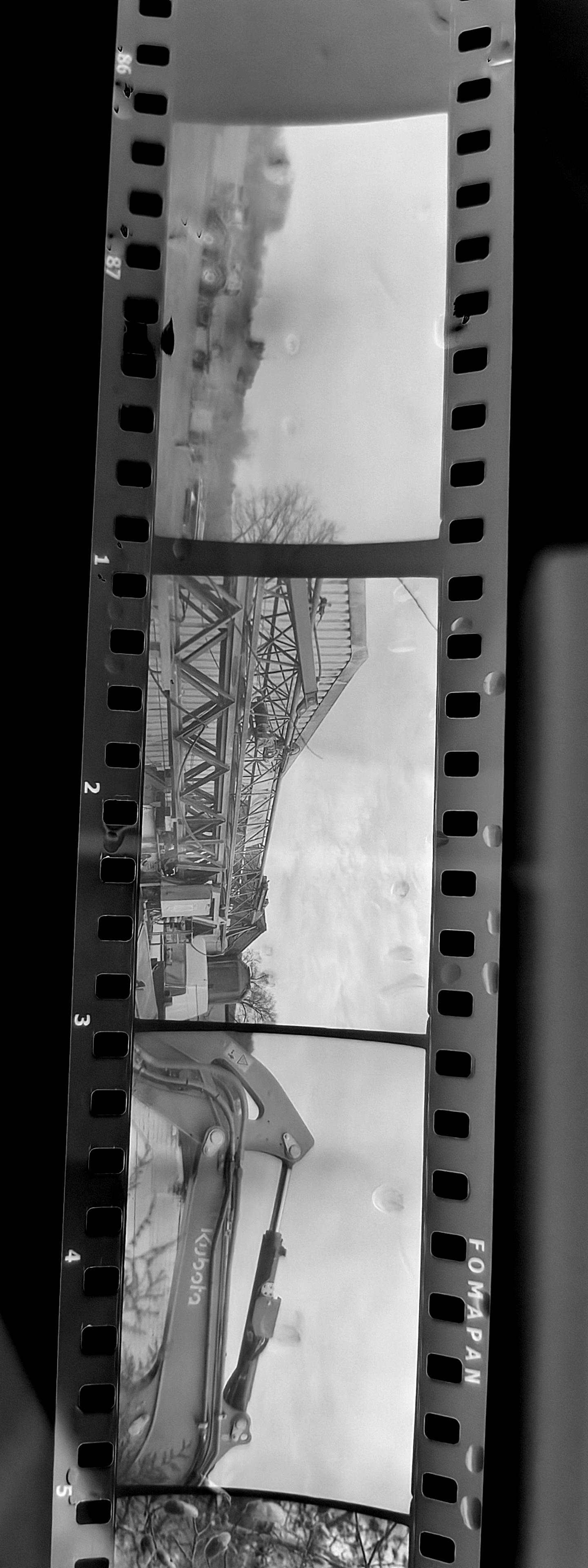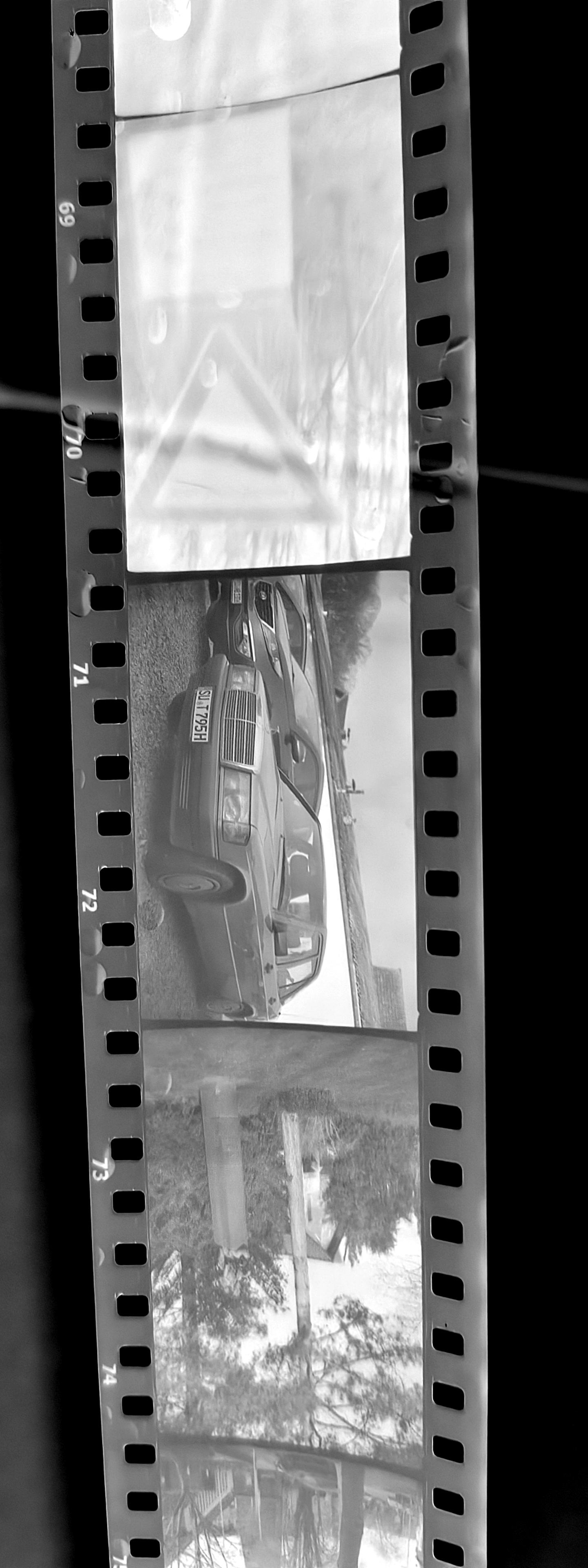 Primär ging es mir auch hauptsächlich darum, die Schärfe zu testen: Das Frontelement dreht ja komplett frei, weil der Vorbesitzer die Schrauben nicht wieder rein gemacht hat, von denen ich annehme, dass sie den Anschlag justieren würden, weshalb ich nur raten konnte, wo Unendlich und all die anderen Entfernungen auf der Skala wirklich sind. Dass ich jetzt so einen eher empfindlichen Film genommen habe, macht diese Arbeit nicht einfacher, denn ab f/8 ist bei 45mm ja nun kaum noch zu sehen, wo die Schärfeebene tatsächlich wäre. Vor allem, wenn man den Film erst mal nur nass unter der Dusche mit dem Handy ableuchtet. Aber es scheint so, als könnte ich evtl. tatsächlich ein paar brauchbar scharfe Fotos gemacht haben, was mich ehrlich gesagt schon fast ein bisschen überrascht. Die Kamera ist schließlich so runter genudelt, dass es an ein Wunder grenzt, dass sie überhaupt noch Bilder produziert.