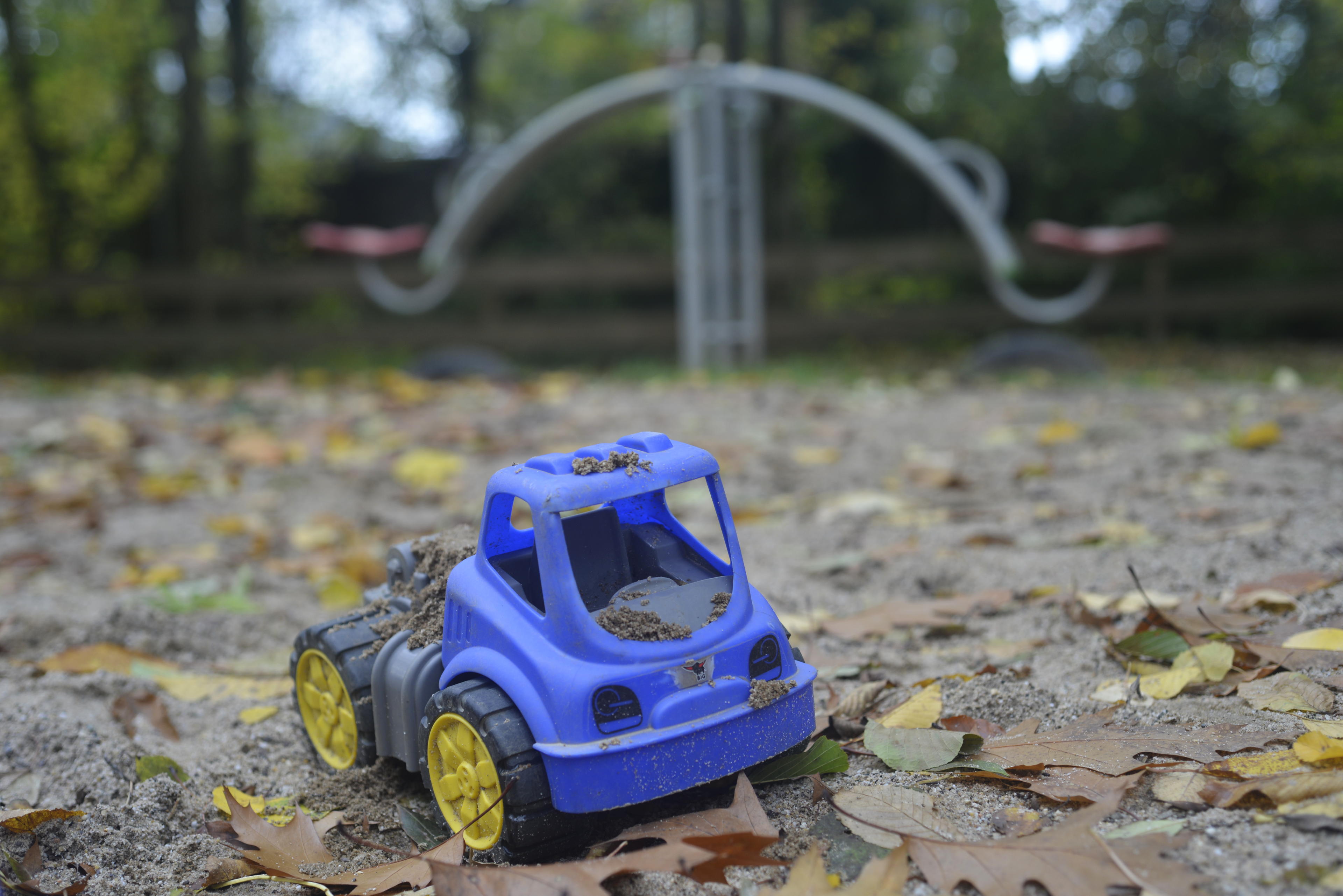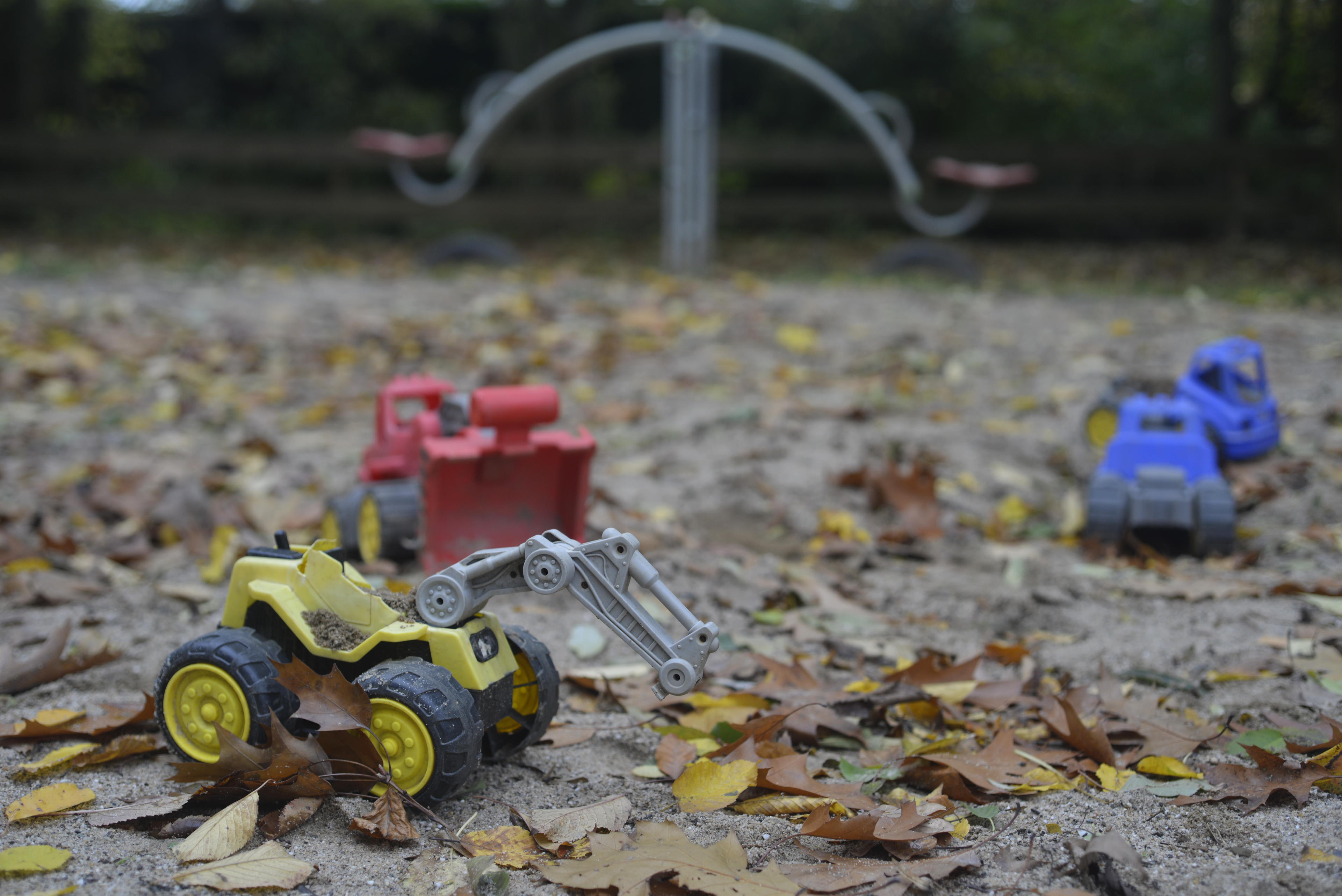 OK, egal, genug real life Satire. (Ha, das habt ihr doch jetzt nicht wirklich geglaubt? Ich rede mich gerade erst warm! ;-)) Nachdem Kind und Familie abgezogen waren, habe ich mal die Brumm-Brumms im Sandkasten mitgenommen. Denn: Wenn es eine Sache gibt, der man in Deutschland nicht entgehen kann, dann ist es die frühkindliche Indoktrinierung bezüglich detailgetreuer, bunter Großbaustellenfahrzeugen. Das gehört zum Sandkasten wie das Amen in der Kirche. Damit sind wir schon aufgewachsen. Wer kann sich nicht den lebensechten Bagger im Sandkasten erinnern, mit dem man stupide Sand von A nach B befördern konnte?! Ich habe es geliebt! Aber hier leider nur diese Auswahl an KFZ. Kein Bagger. Muss mal dringend mit dem Bürgermeister reden, das geht so ja gar nicht! Da wird unsere Jugend noch total verweichlicht! :-D