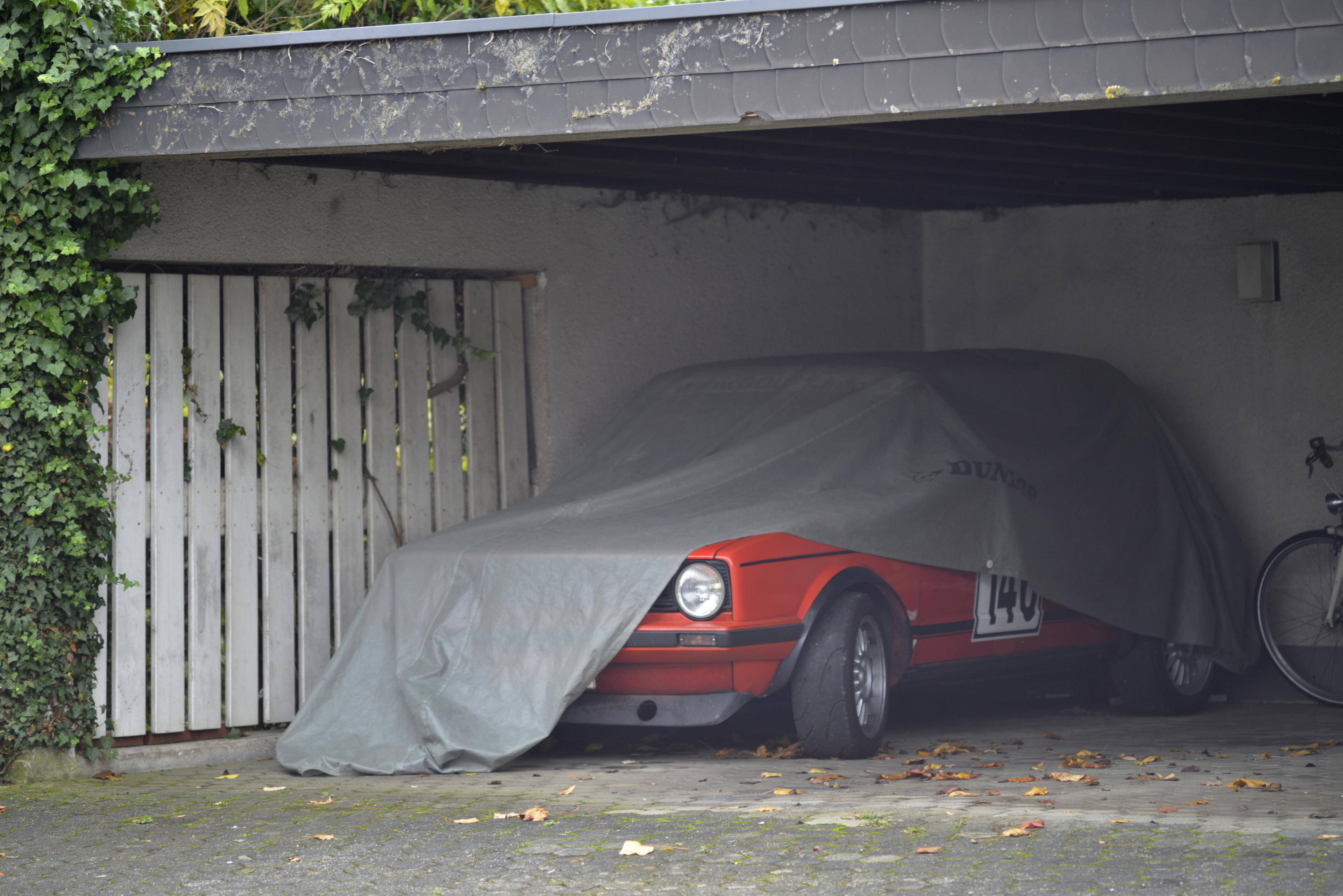 Ich weiß nicht, ob es der Wind war oder die Waschbären, jedenfalls war der Rally-Golf nur halb unter seiner Plane. Da hab ich dann auch mal einen Schnappschuss gemacht. Der ist mit den Reifen aber nicht street legal, oder? Finde den jedenfalls immer sehr cool, wenn ich hier in meinem schimmeligen alten Civic um die Ecke gerappelt komme. (Frühkindliche Indoktrination, wie gesagt. Immerhin steht da auch ein Fahrrad in der Garage, aber irgendwie lässt das mein Herz nur mäßig höher schlagen. ;-))