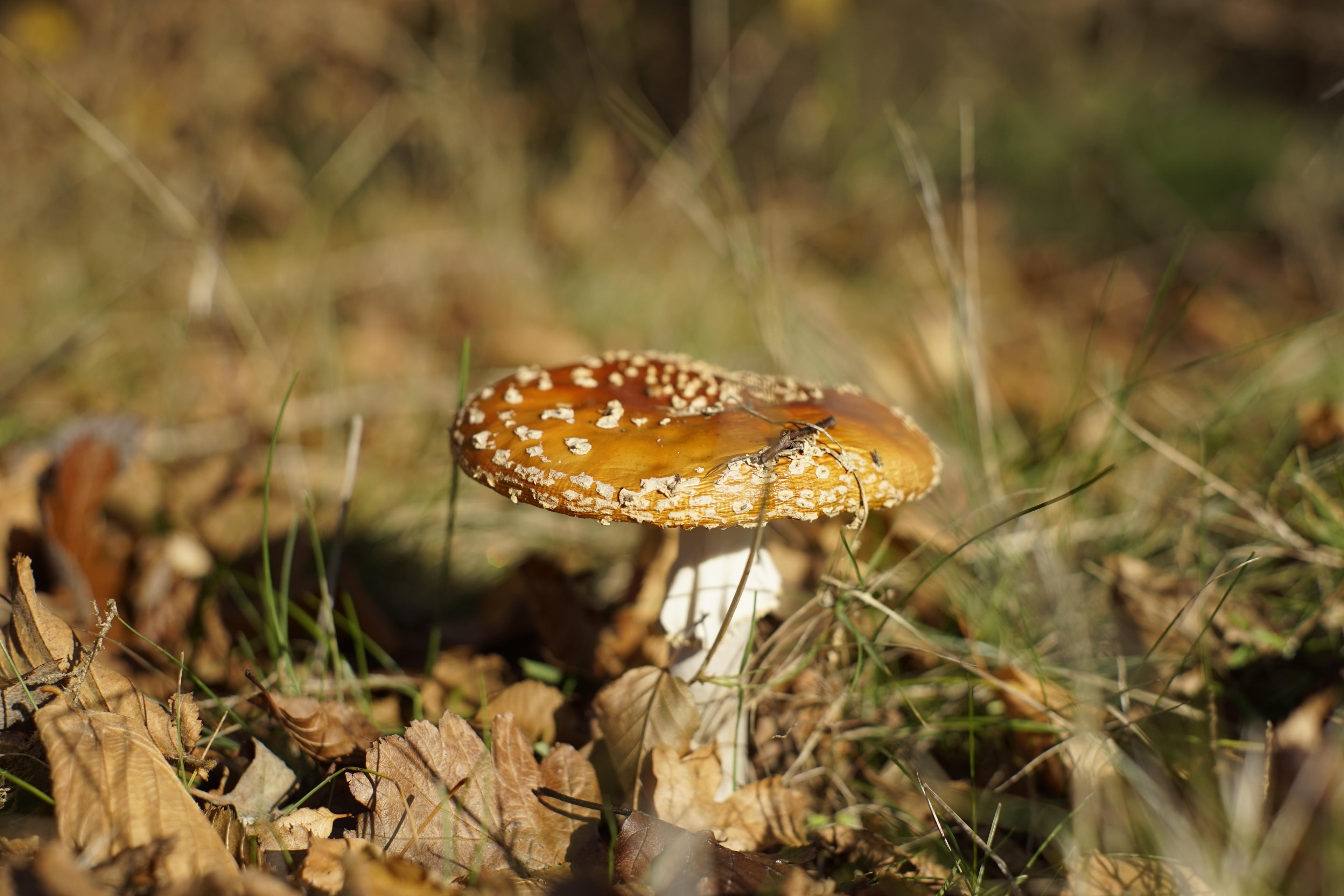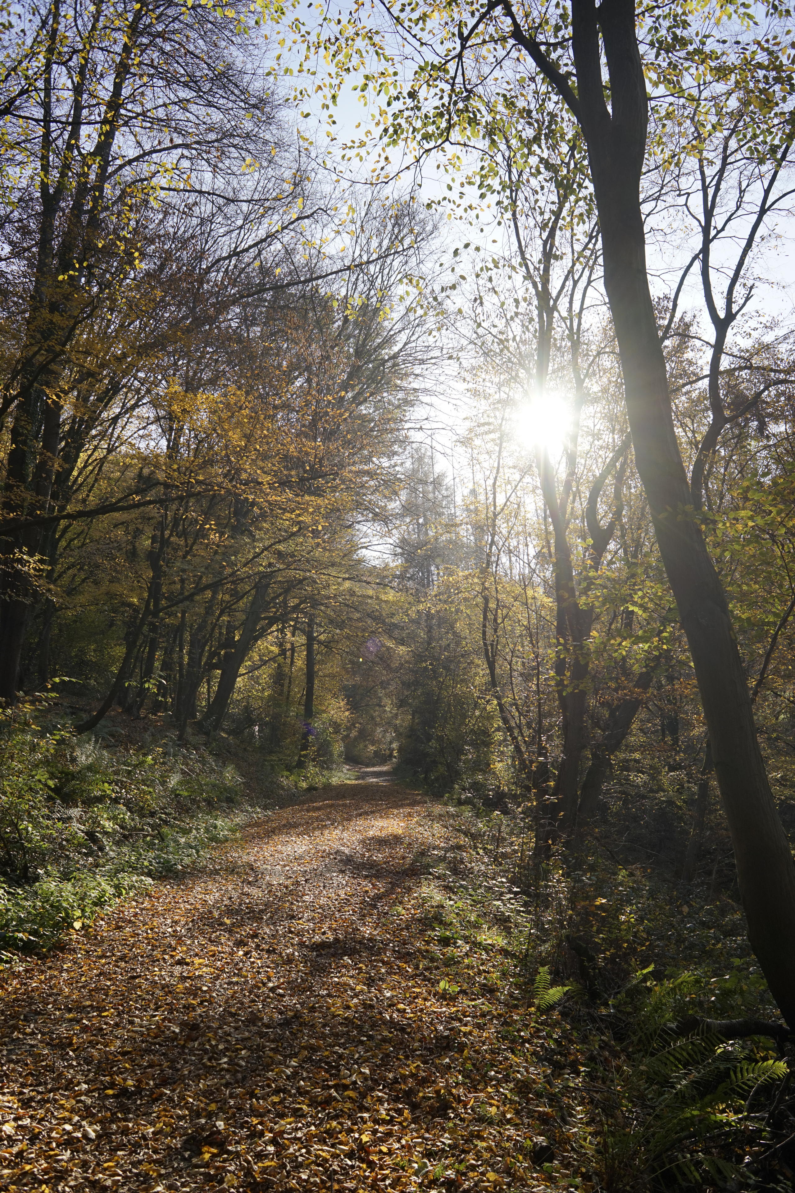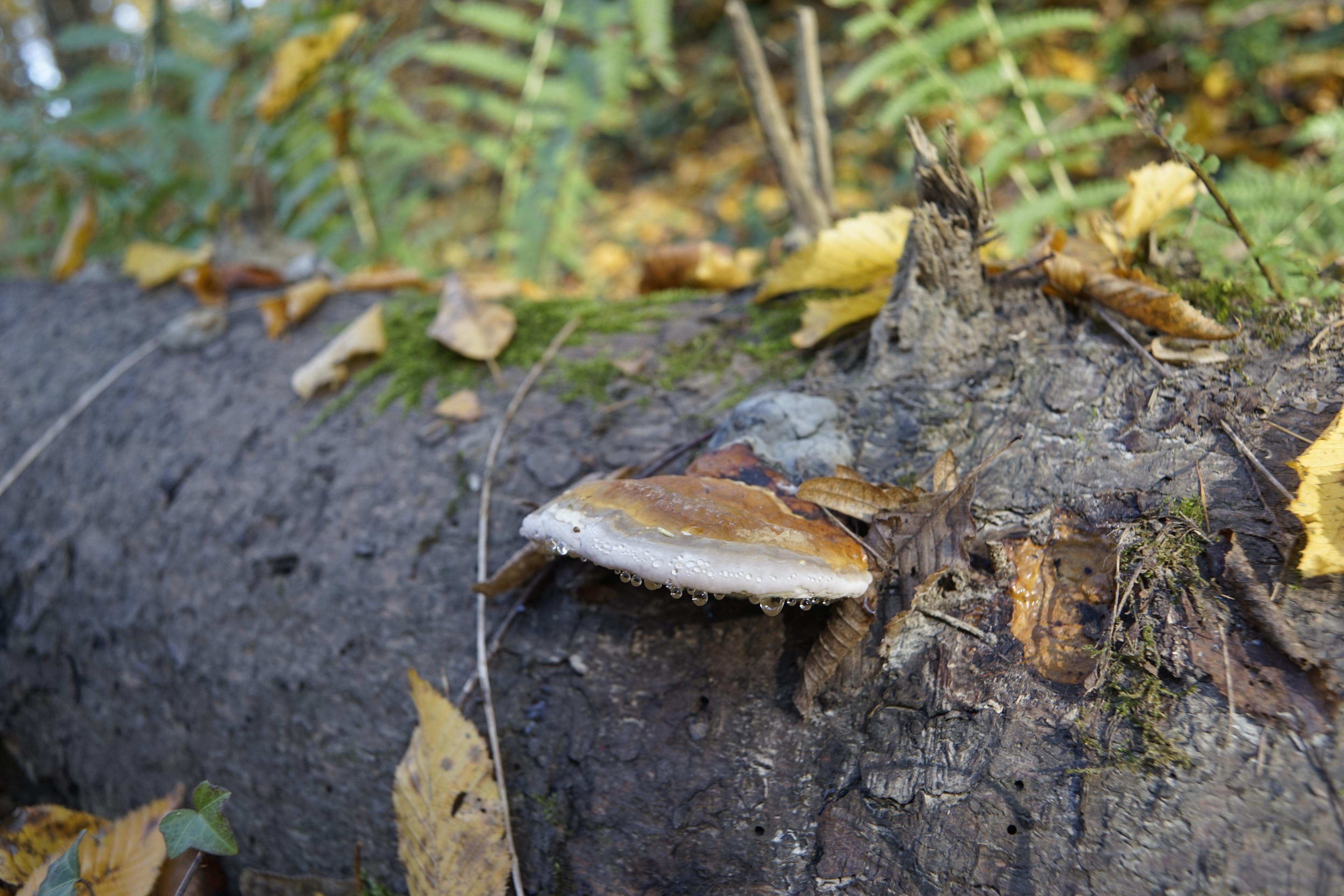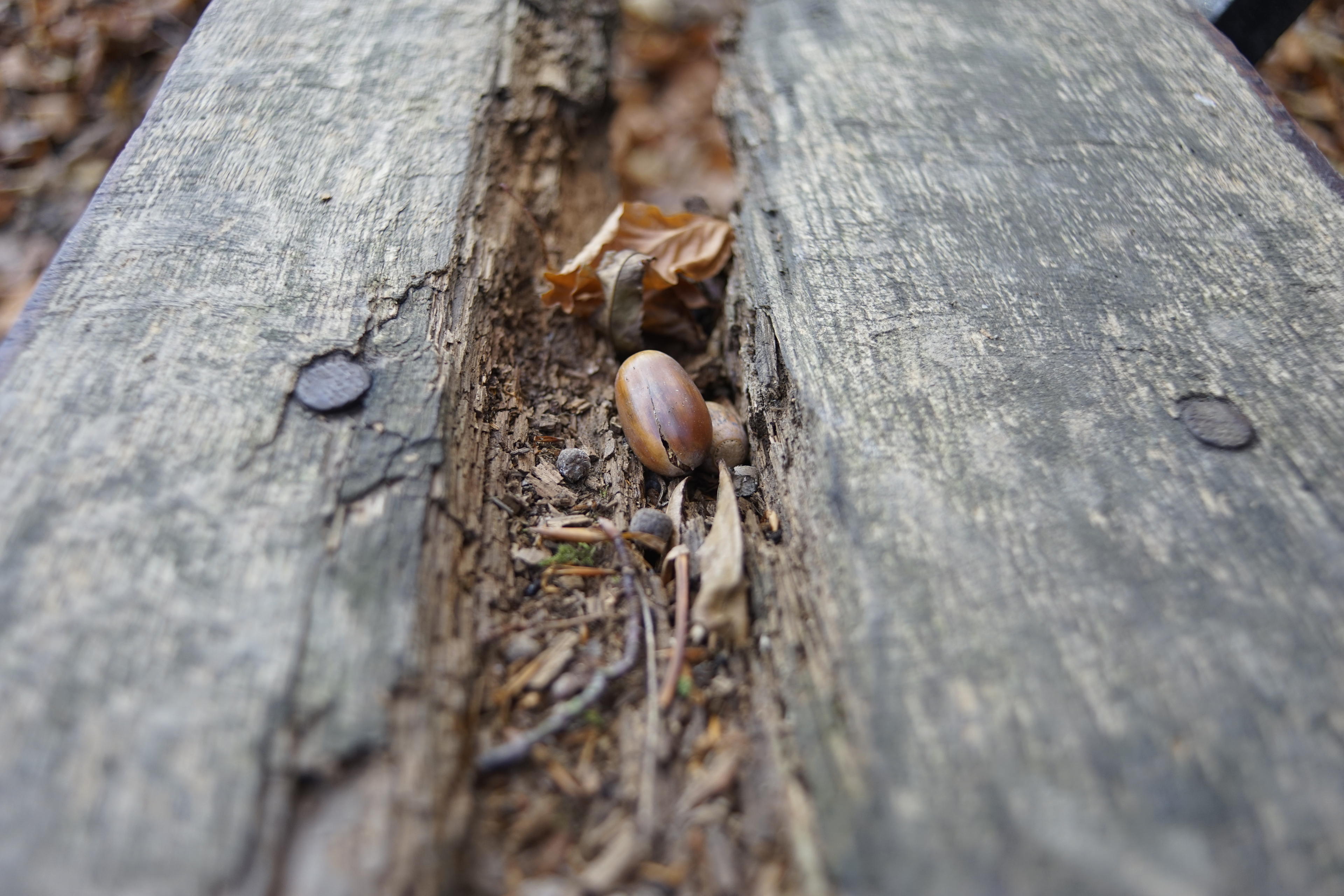 Beim waldigen Abstieg habe ich mich dann erst mal auf die Bank gesetzt, die da ist, denn das Zwielicht der schillernden Herbstfarben genießen hat auch was. Habe die Gelegenheit genutzt, mal die AF-Justage des 50er und des 28er anzupassen. Die stehen jetzt beide auf +15. Ich muss mal eine andere Methode finden, den Adapter fest auf der Kamera zu montieren, statt da diese drei Flecken dickes Tesa-Paketband drauf zu pappen. Eigentlich müssten die auf die Flügelchen des Bajonetts. Aber da hab ich Angst, dass die sich ablösen und irgendwann auf dem Sensor landen.