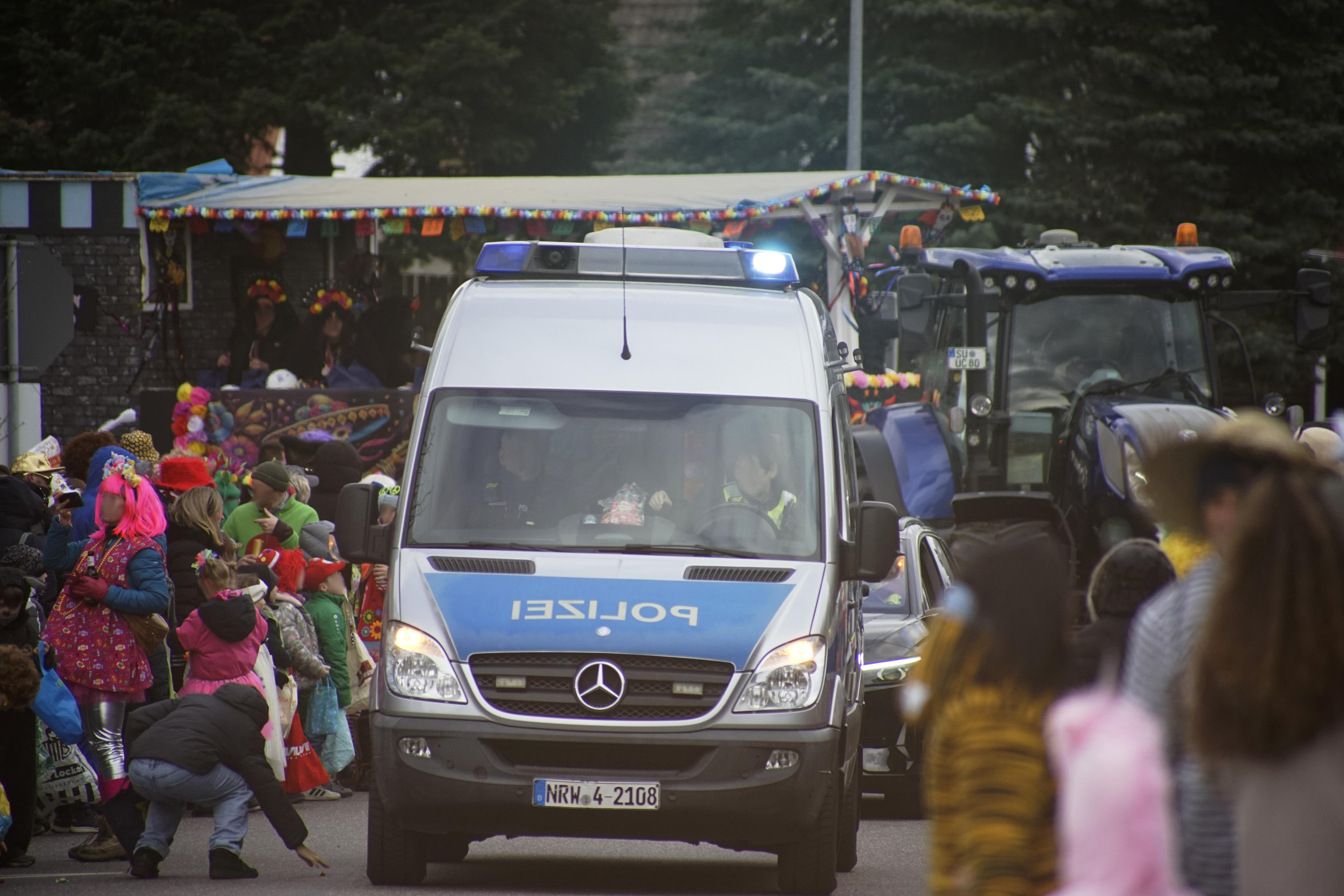 Und auf einem der Wagen fuhr dann tatsächlich noch der Chef vom Dorf mit, unser Bürgermeister, der Herr Dahm. Den hab ich gar nicht erkannt, in dem "Day of the Dead"-Outfit. Erst, als ich mir nachher die Fotos angeschaut habe, da ist er da drauf, neben dem Mädel mit dem Victory-Zeichen. Verfolgt vom Tiger. Karneval ist schon eine sehr verrückte Zeit hier im Rheinland! (Ach?)