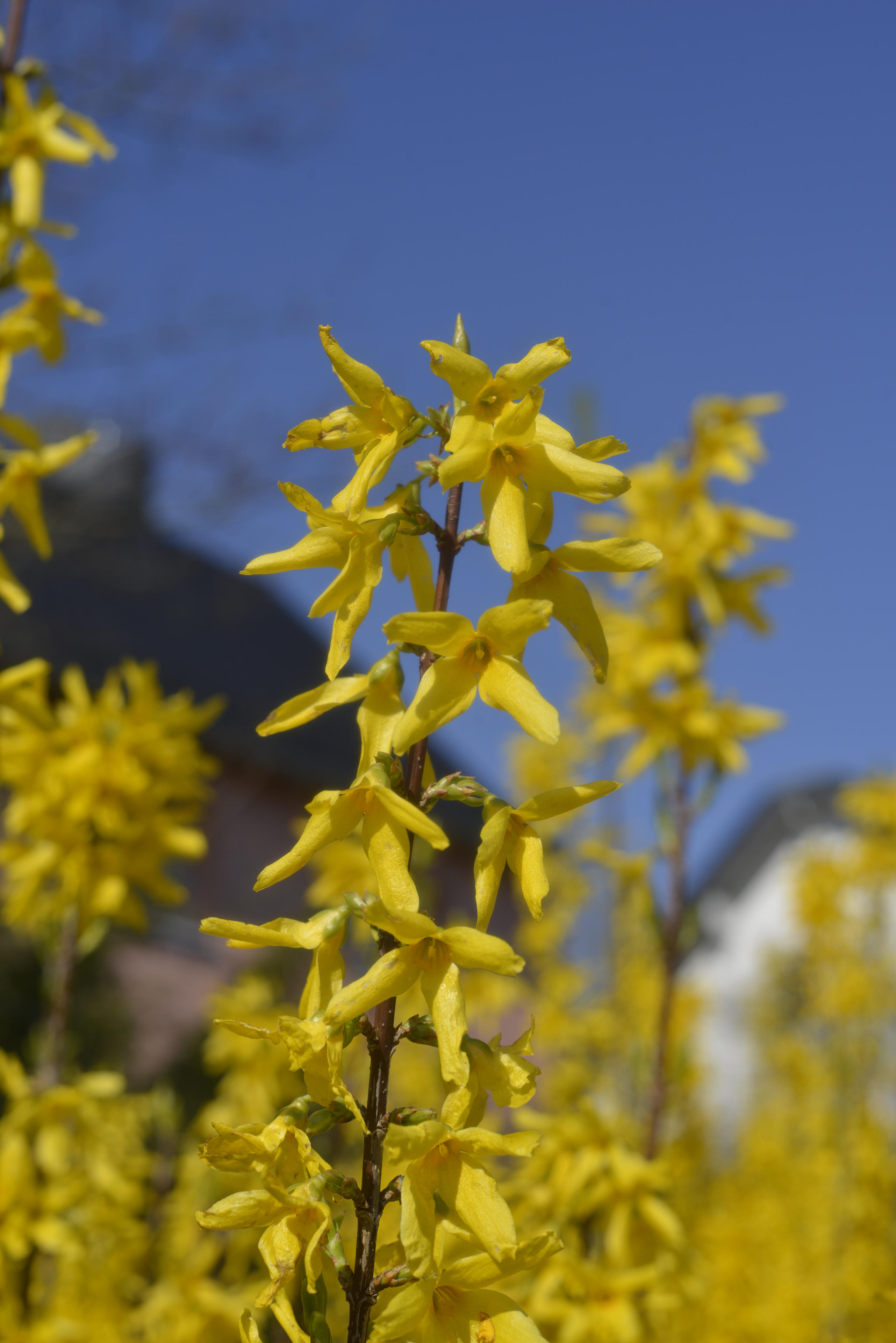 Auch die anderen Sträucher scheinen eher hart im Nehmen zu sein und sich nicht so leicht von Efeu und verwilderten Rosen überwuchern zu lassen. Da es eher hell und sonnig war, habe ich mich hier auf mittlere bis weiter geschlossene Blenden konzentriert, was bei Nahaufnahmen am unteren Ende der Entfernungsskala ja auch Sinn macht: Die Blüten sollen schon eine gewisse Tiefe haben, der Hintergrund-Blur kommt auf diese Entfernungen von ganz alleine. Dann noch kurz einen Abstecher in den hinteren Garten gemacht, bevor ich mich auf den Weg durchs Dorf gemacht habe.