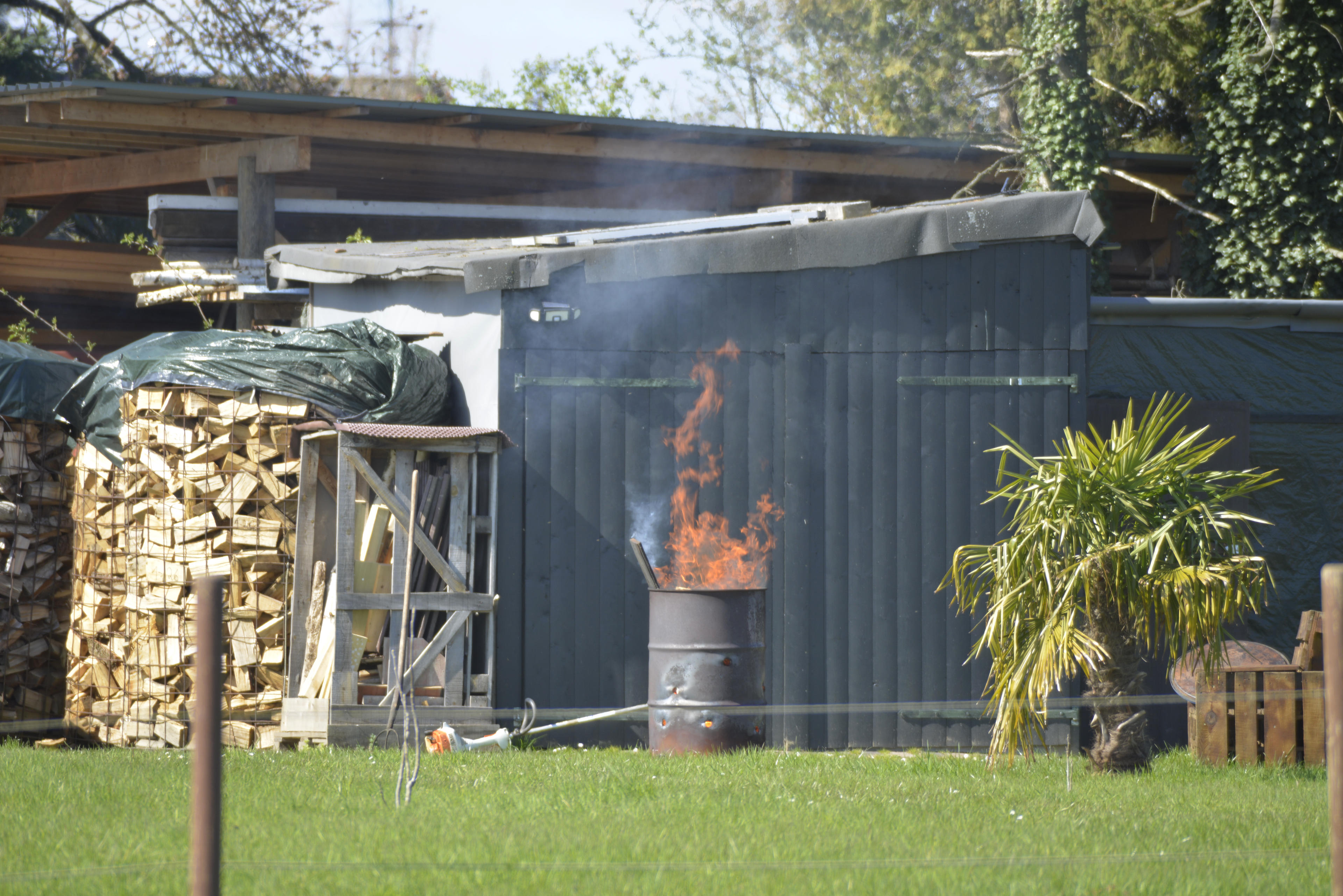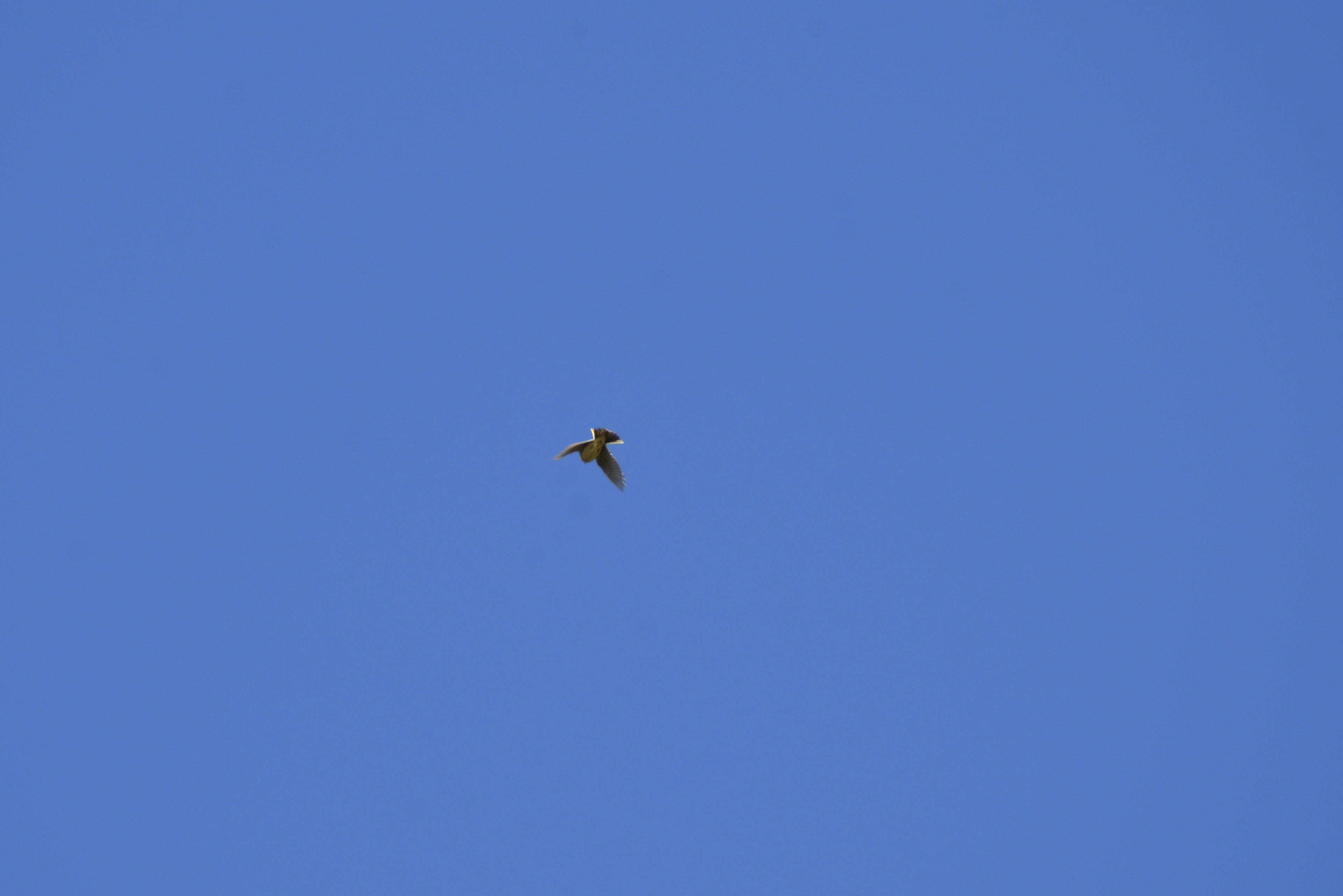Lerchen sind schwer zu fotografieren. Erst mal stehen die immer so ziemlich genau in der Sonne, wenn sie ihr Frühlingslied singen. Zum anderen bewegen die sich so schnell und rudern so heftig mit den Ärmchen, dass sie selbst bei 1/400s noch verwackeln. OK, ist ja auch ein 400mm Objektiv, wundert mich jetzt eigentlich nicht. Nachdem ich das ISO höher gestellt hatte, war das Vögelchen allerdings nicht mehr zu sehen. Also, gehört habe ich sie noch, aber gesehen halt nicht. Wahrscheinlich, wie gesagt, mal wieder direkt in Richtung Sonne entschwunden. Aber niedlich trotzdem. (Im Gegensatz zum brennenden Ölfass, in dem da wer seine Reste vom Winter verheizt hat.)