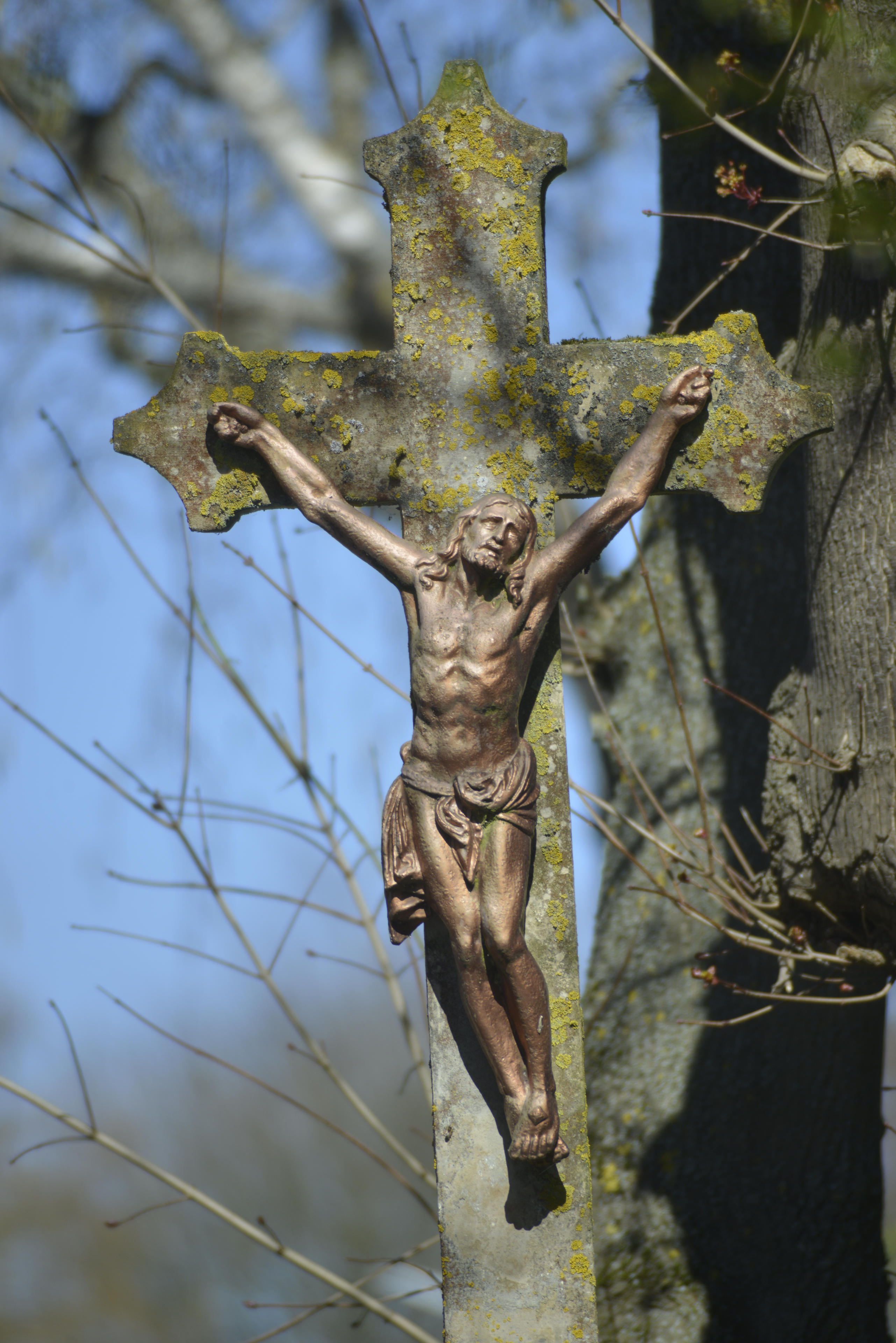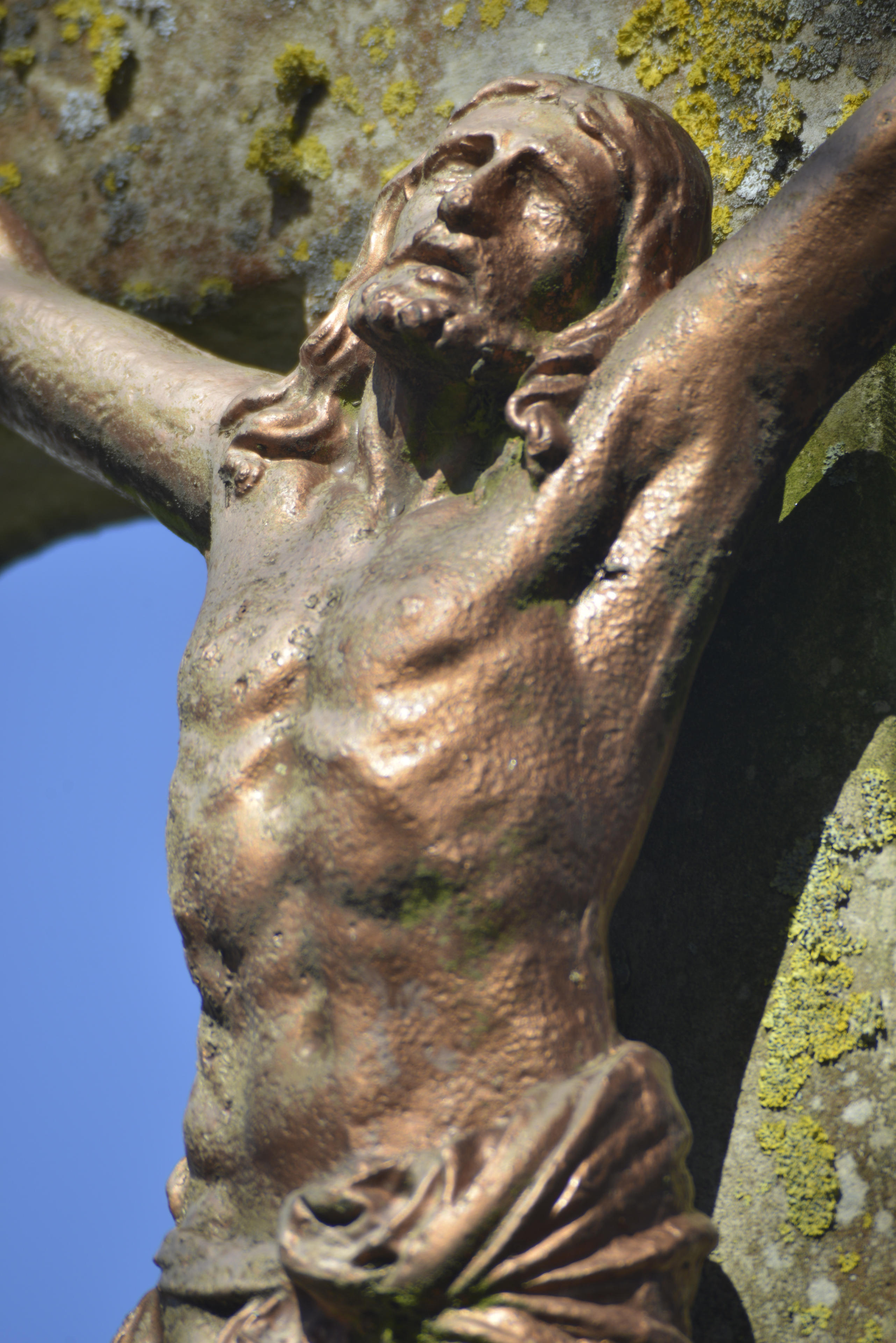 Aber auch egal. In der langen Brennweite kann man den Bronze-Anstrich ganz genau inspizieren. Sieht noch ganz gut aus. Frage mich nur, warum der Jesus unter seinem Arm so eine Naht hat: Ist das Massenfertigung? Ist der in einer Form gegossen worden? Ich mein, möglich ist alles! Ist das vielleicht am Ende sogar tatsächlich Bronze? Dann würde ich den aber mal rein holen, nachdem sie bei der Bahn schon Kabel klauen, da gibt es sicher ein paar Interessenten Bekloppte!