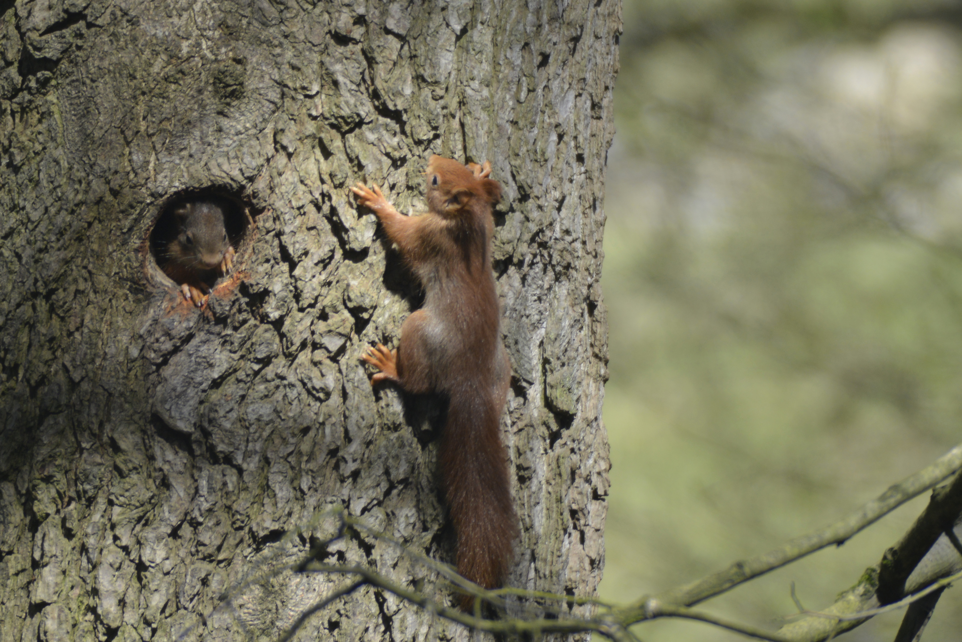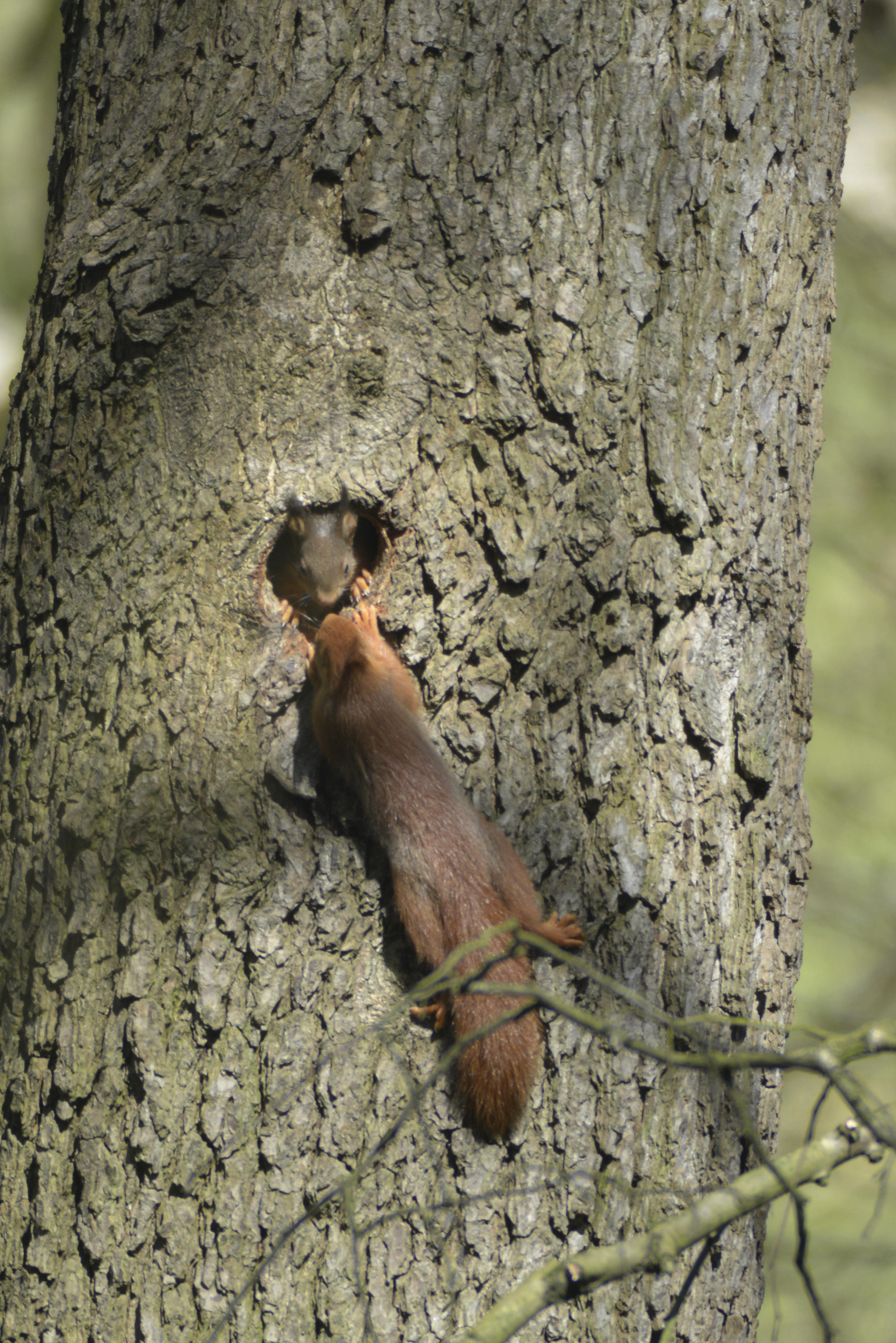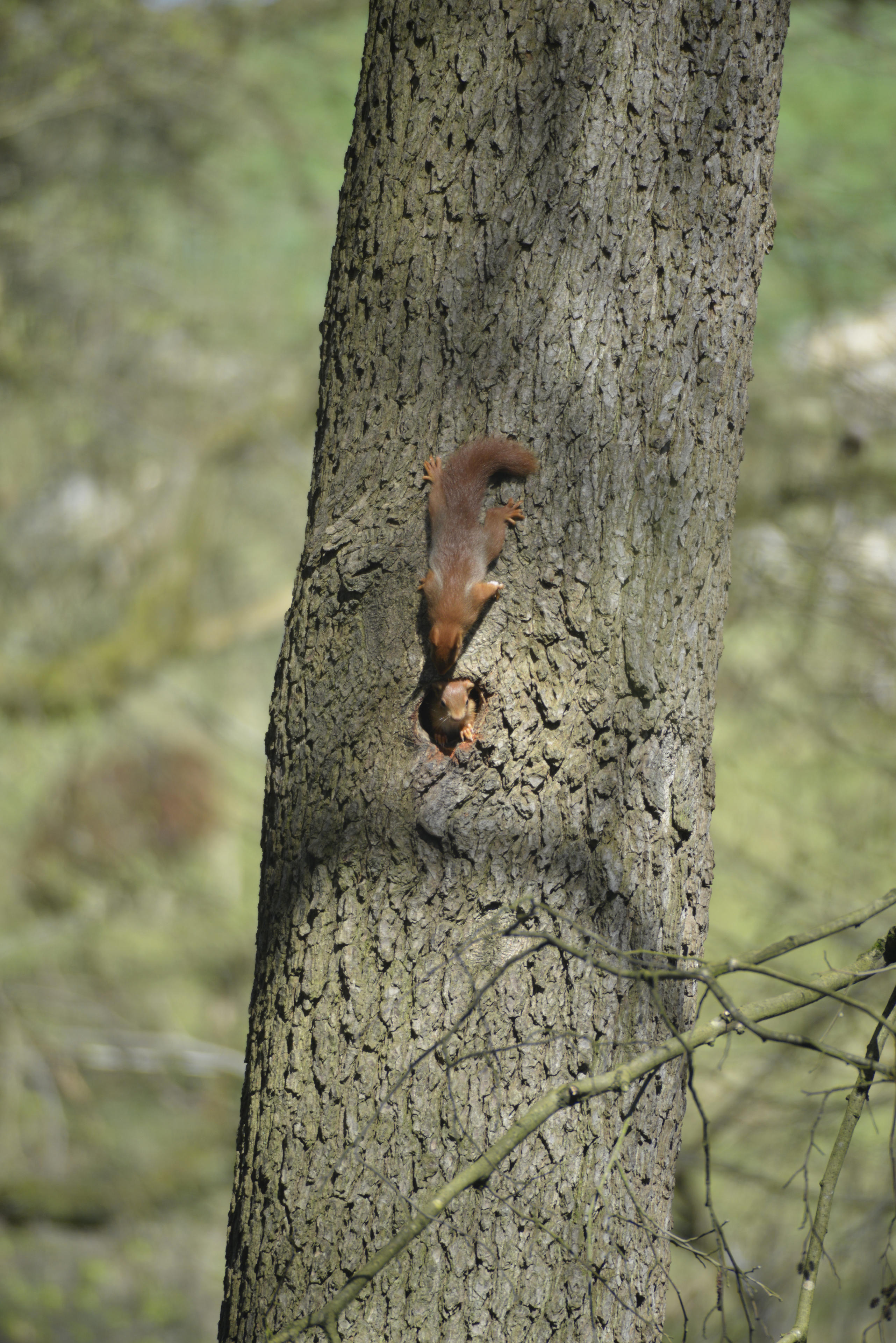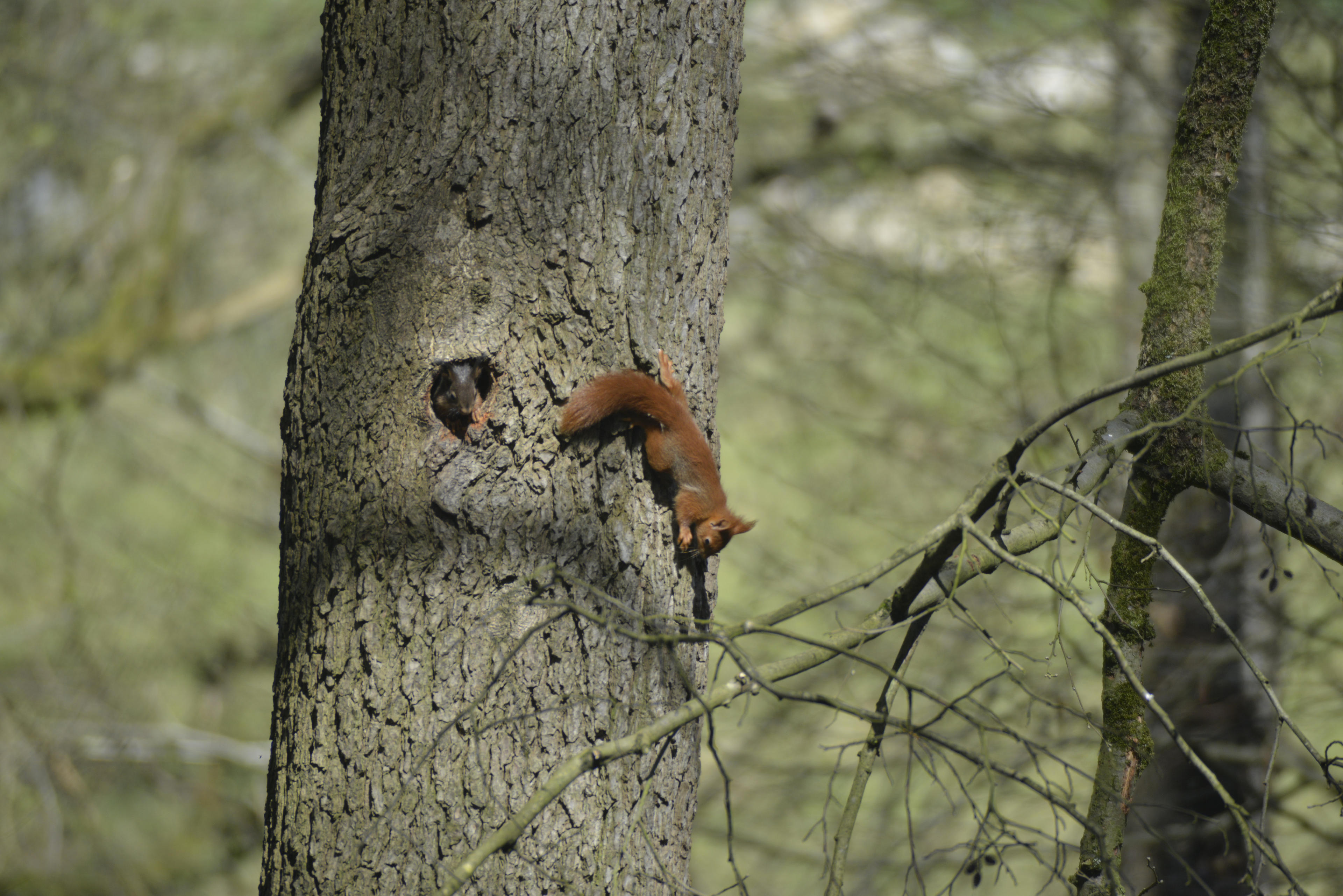 Und wieder ein paar Meter weiter, wir kamen aus dem Anhalten gar nicht mehr heraus, saß ein Eichhörnchen am Beum und lockte ein anderes Eichhörnchen in seiner Höhle. War das ein Junges? Ist das seine Auserwählte? Man weiß es nicht, aber ich bin ja fast dahin gescholzen. Ich fürchte, das toppt sogar noch die Lämmer. Keine Ahnung, warum Eichhörnchen bei den meisten Menschen so einen Effekt haben. Das sind ja eigentlich recht kratzbürstige Tiere. Also, zumindest in der freien Wildbahn. In der Stadt jetzt vielleicht nicht so, da fressen sie einem aus der Hand, wenn man Glück hat. Aber so im Wald? Besser nicht anfassen.
