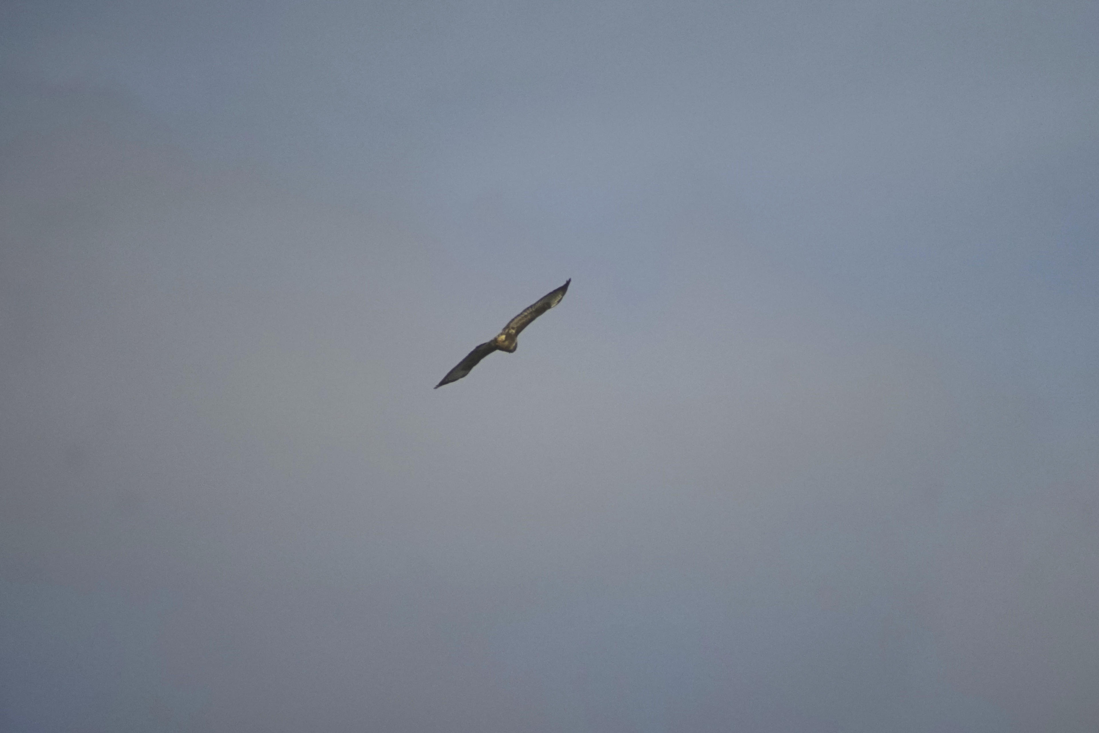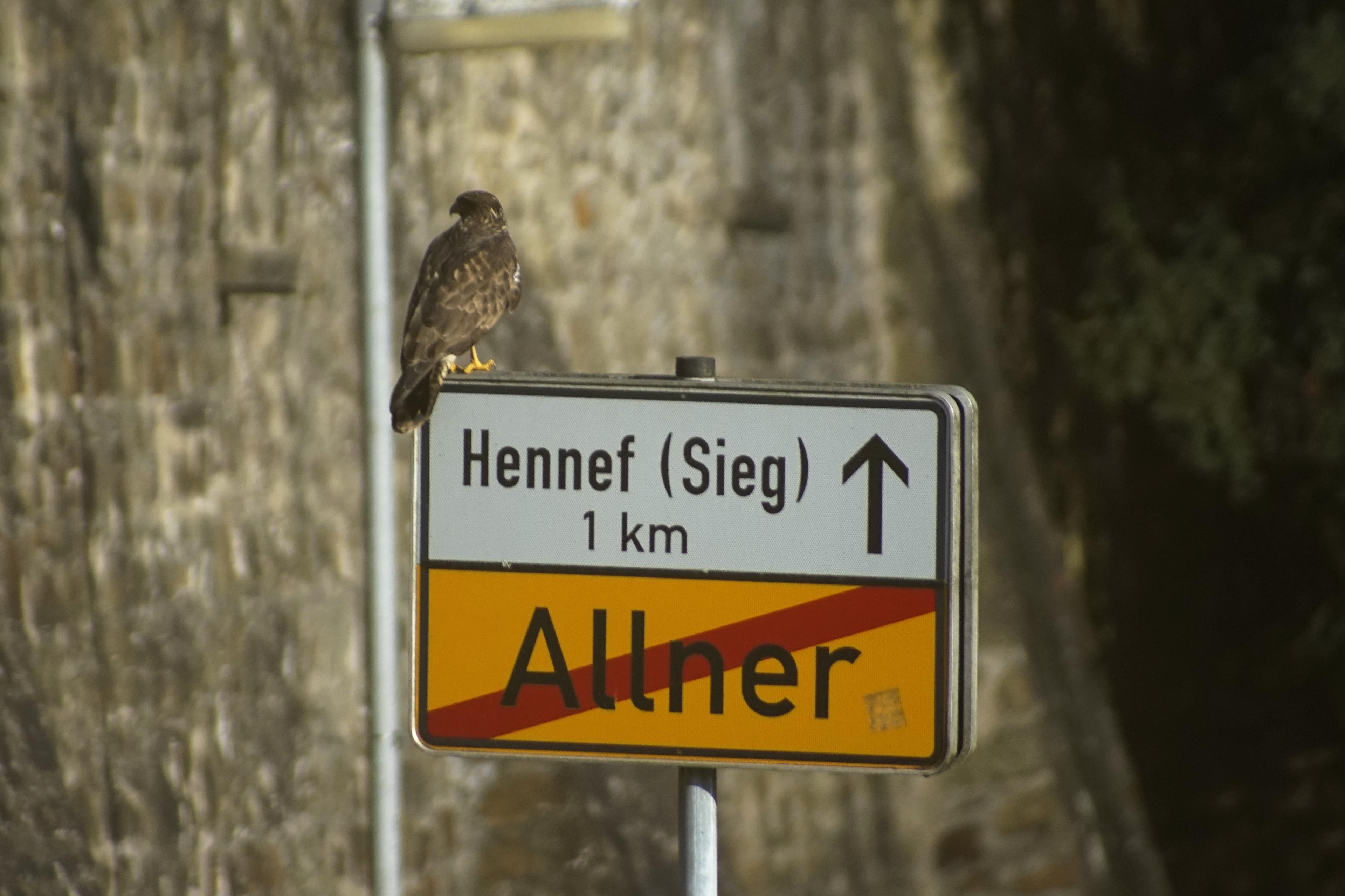 Außer dem einen, der da unten sehr fotogen auf dem Ortsausgangsschild saß und zugeguckt hat, was die anderen da oben in der Luft so treiben. Der ist zwar regungslos sitzen geblieben, wenn der Verkehr an ihm vorbei gerauscht ist, aber als ich dann mit dem 80-400mm auch nur einen halben Schritt zu nah gekommen bin: Schwupps, war er weg! Deswegen musste ich trotz der sehr langen Brennweite ein bisschen croppen. Was erstaunlich gut geht, auch wenn das alte Objektiv durchaus schärfer sein könnte. Aber ich gebe auch der Kälte ein bisschen die Schuld, da verzieht sich das Gehäuse und die Linsen schrumpfen.