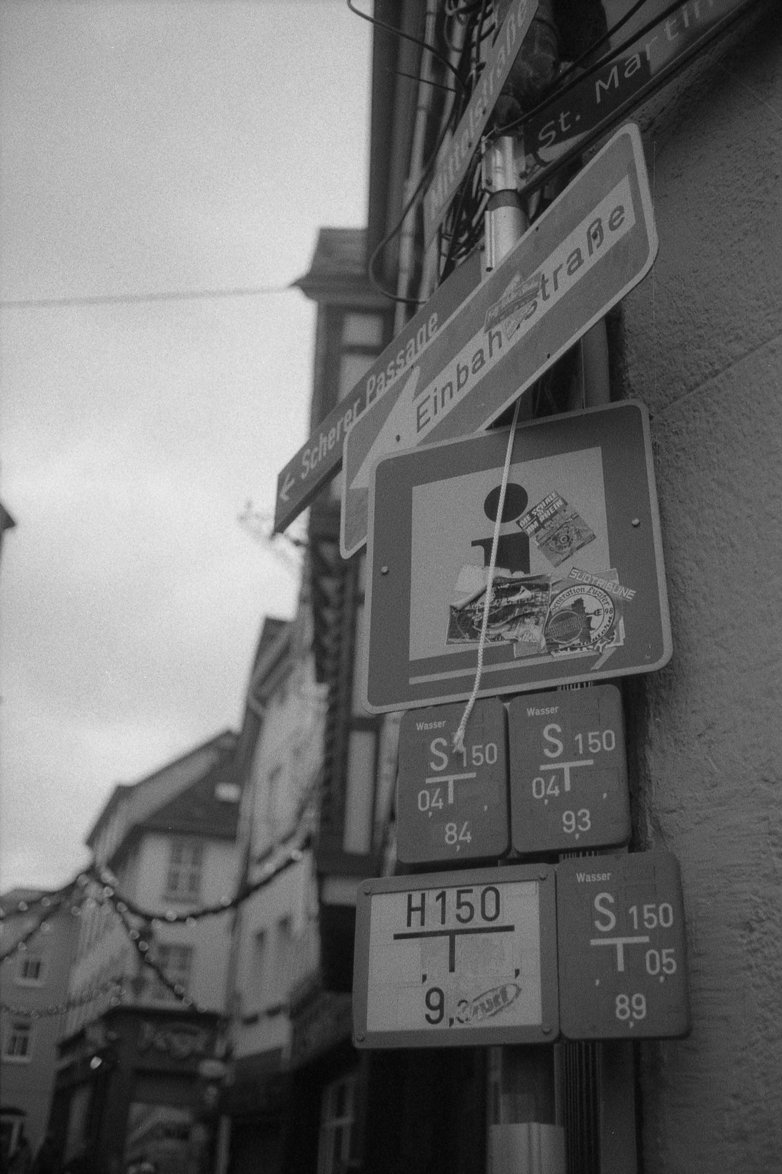Auch in historischen Altstädten wimmelt es von deutscher Schilderwut, hier pressefrisch dokumentiert. ;-) (1/2000s, f/2.) Auch hier: Weit offen für den Hintergrund. Kann man machen, den Schildern hat es jedenfalls nicht geschadet.