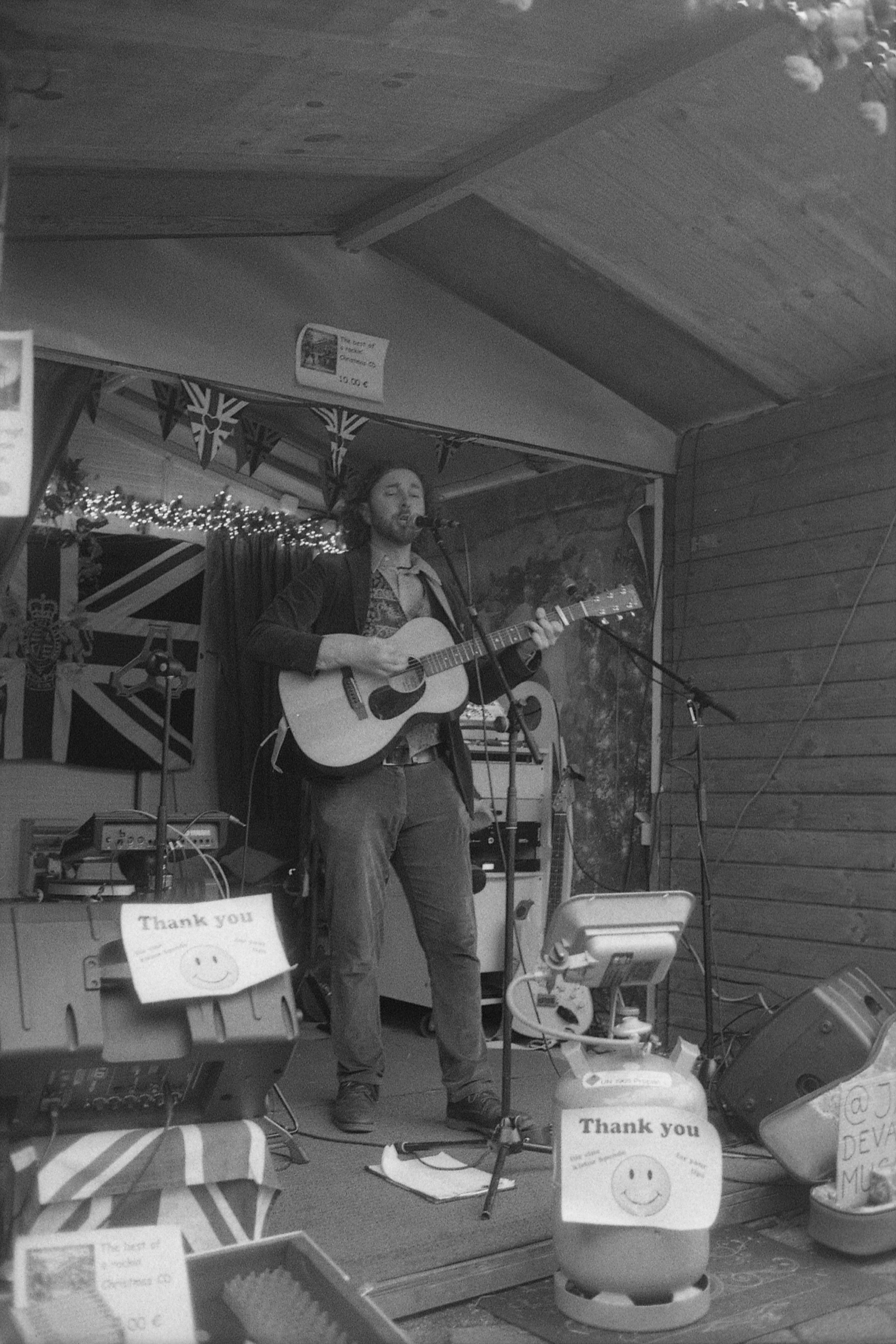 Letztes Bild: Der Musiker, der da für Unterhaltung gesorgt hat. (1/30s, f/2,8.) Der hatte seine Anlage wenigstens richtig ausgepegelt, im Gegensatz zu den beiden, die danach dran waren, das war total kratzig-übersteuert und eigentlich ungenießbar, Musik war in beiden Fällen aber OK. Beides sehr britisch auf seine Art und Weise.