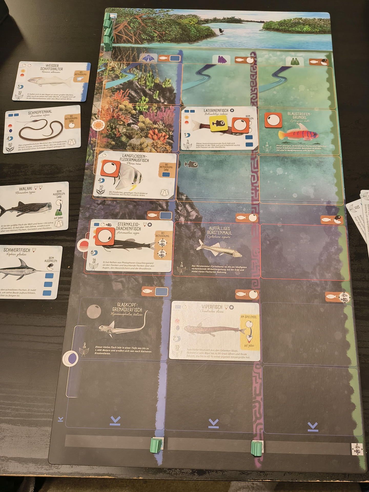 Dann spielt man ähnlich dem bekannten Spielprinzip Fische in diese jeweiligen Zonen, wobei kleinere Fische von größeren überdeckt werden können, wenn einem der Platz ausgeht bzw. man einfach einen viel viel besseren Fisch auf der Hand hat, den man unbedingt los werden möchte. Manchen brauche Eier, manche manche fressen Jungfische, wenn man sie ausspielt, manche können nur in ein bestimmtes Habitat gelegt werden - was wir beim ersten Playtrough mal wieder nicht geschnallt haben, siehe Bild drei, wo ein auf der rechten Seite blau berandeter Freiwasserfisch im Kelpwald liegt. Viele kann man aber auch einfach überall hin spielen. Um Fische zu spielen, Eier zu legen und diese schlüpfen zu lassen, führt man Tauchgänge in den entsprechenden Habitaten durch. Möchte man zB einen neuen Fisch auslegen, taucht man im Riff und für jedes bereits von einem Fisch belegte Habitat in dieser Zone darf man einen Fisch spielen, unter Beachtung der entsprechenden Karten-Voraussetzungen. Ebenso kann man in der Freiwasserzone Eier legen lassen und im Kelpwald vorhandene Eier schlüpfen lassen. Dabei ist zu beachten, dass - sobald sich drei Jungfische auf einem Feld treffen - sich diese zu einem Schwarm vereinen. Schwärme bringen zusätzliche Punkte oder sind ebenfalls für seltene, große Räuber eine Vorbedingung (Futter).