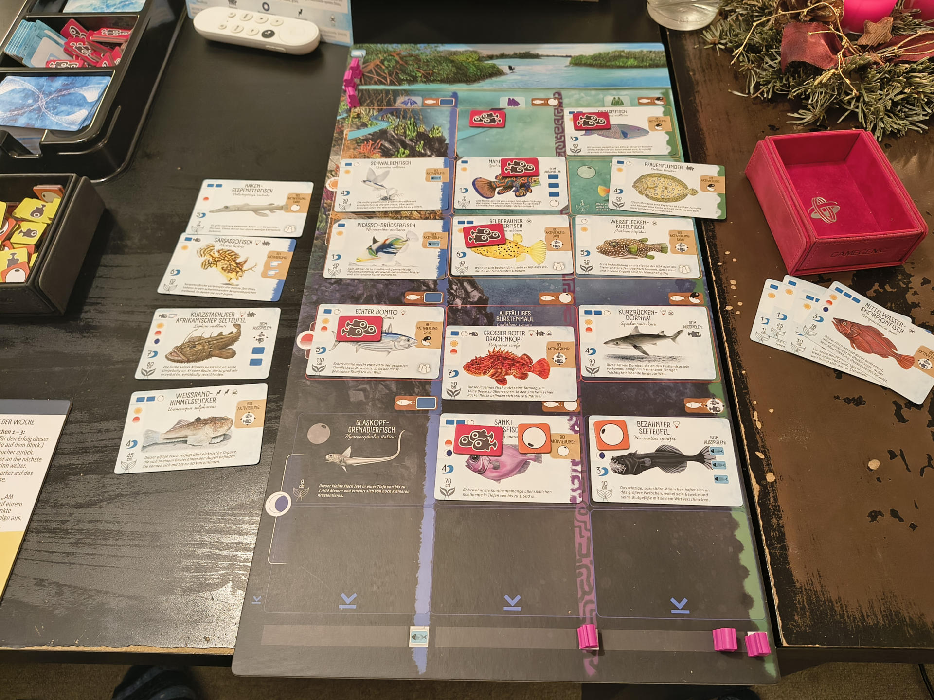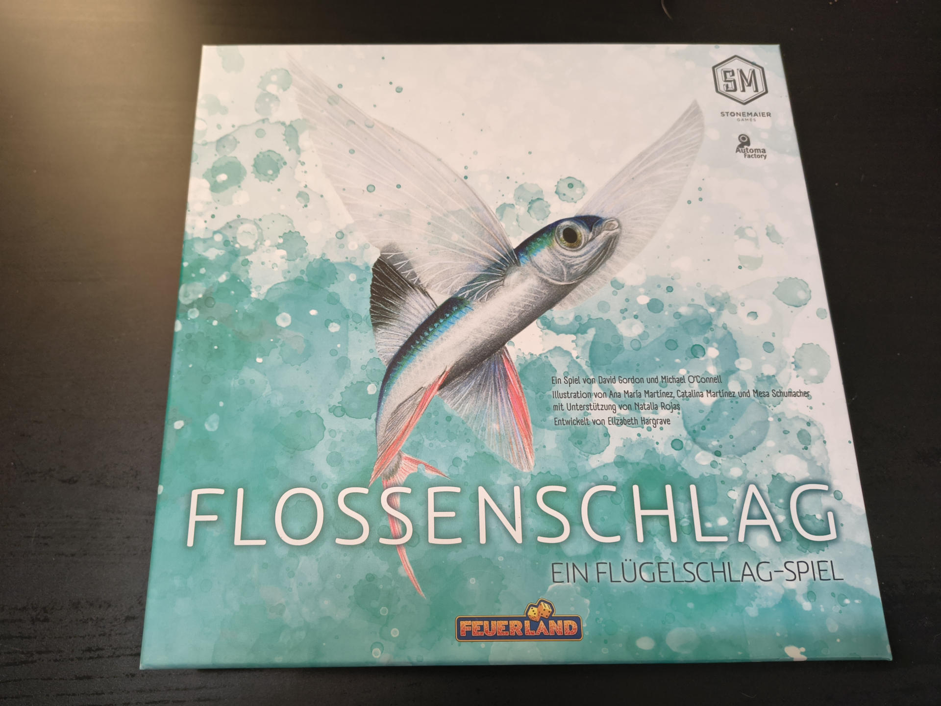 Da ich ja ein absoluter Fan von Flügelschlag bin ("VÖGELCHEN!") und wir auf der Spiel in Essen sämtliche Zusatzkarten mitgenommen haben und damit dieses Spiel mittlerweile wohl das teuerste ist, das wir im Haus haben, wenn man die ganzen Upgrades und DLCs dazu rechnet, ist das wohl, sagen wir mal vorsichtig: vorerst komplett. ;-) Deshalb habe ich zu Weihnachten dann tatsächlich einen der Nachfolger unterm Weihnachtsbaum gehabt: Flossenschlag. (Es gibt ja noch das andere mit den Drachen, aber das spricht mich weniger an; ich mag meine Tiere gerne realexistierend.)