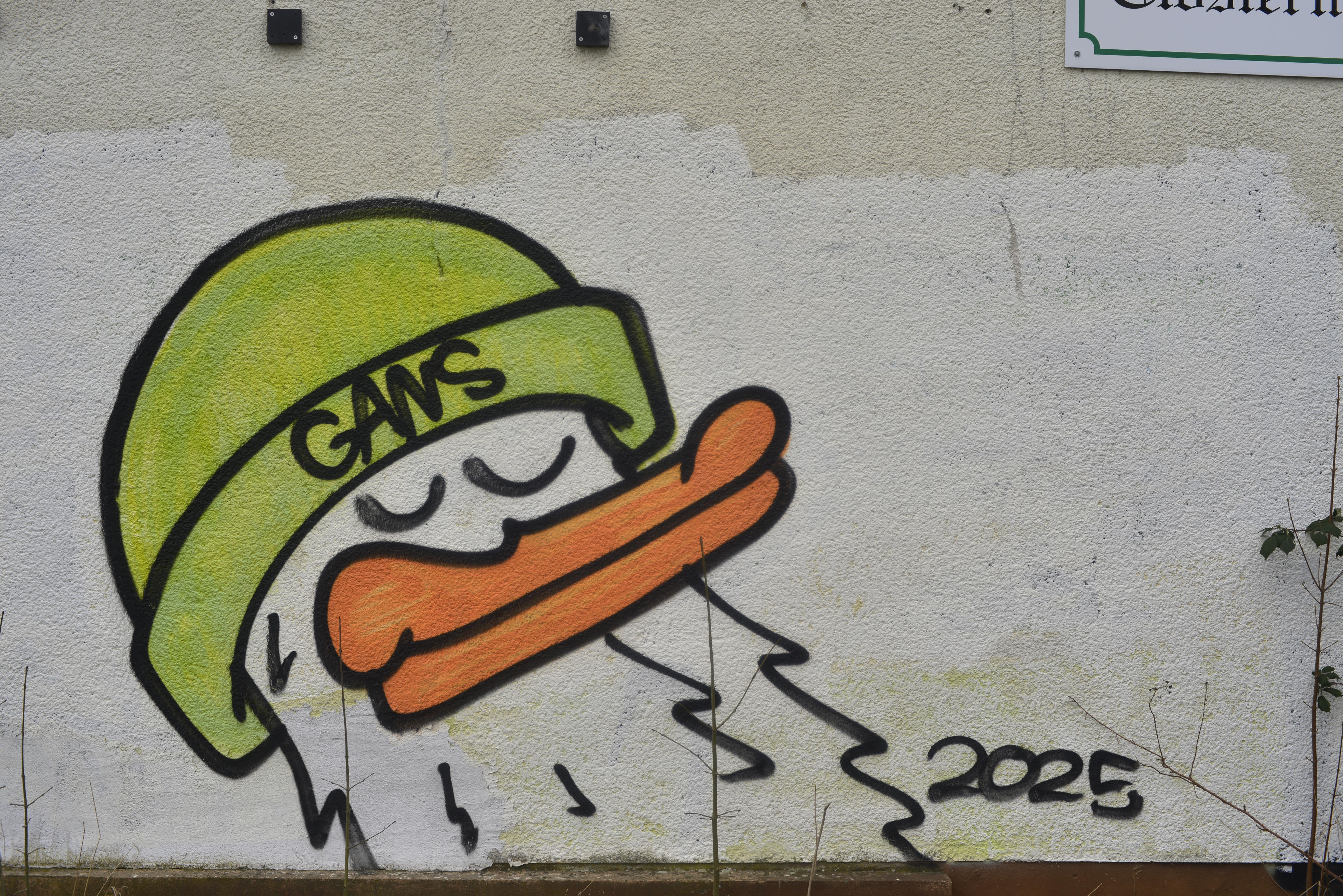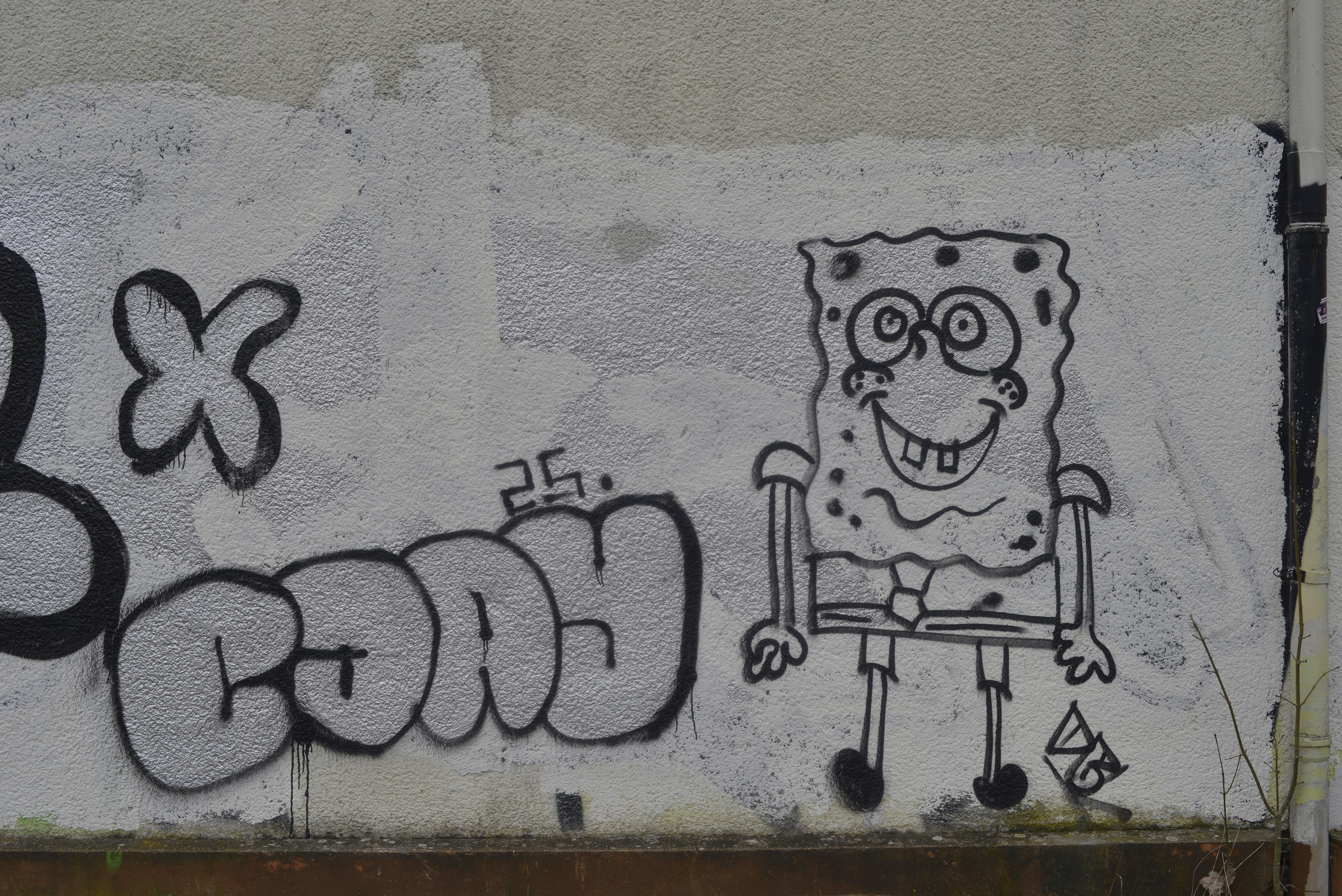 17.3.: Wo war ich stehen geblieben mit meinem AI-S 50/1.4 auf der D800? Irgendwo unten an der Warth. Was gab es da zu sehen? Spongebob, der mit einer Gans auf einer Wand am alten Schützenhaus aufgesprüht wurde. Beides auf jeden Fall schon mal Motive, für die sich ein Foto lohnt. Die Gänse würde ich ja eh gerne mal alle dokumentieren, die machen ja die ganze nähere Umgebung von Hennef unsicher.