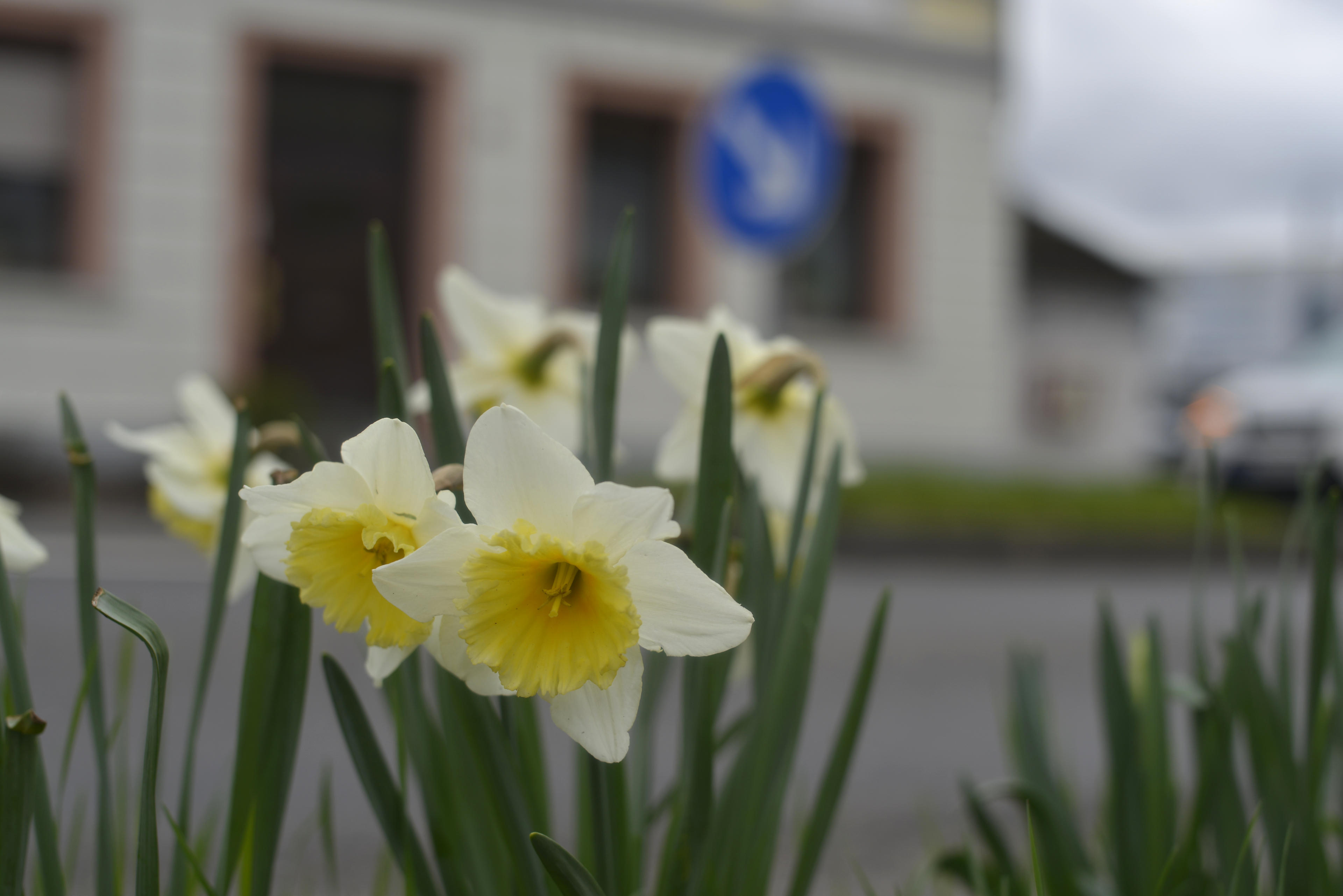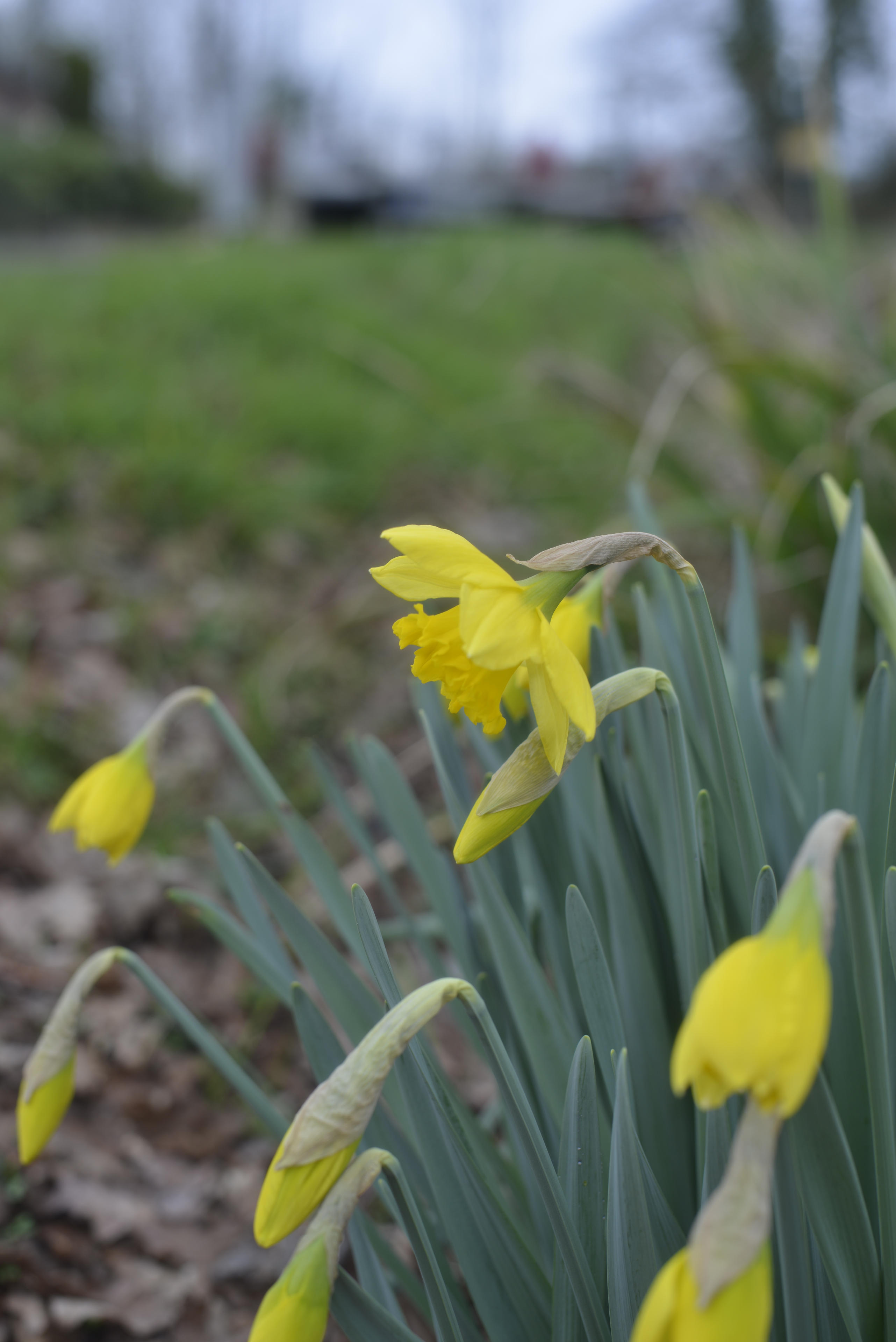 Danach aber erst wieder im Dorf. Bei dem Licht und der Kälte hat es sich irgendwie nicht gelohnt, die Kamera da draußen auf den Feldern noch öfter zu zücken. War mir ganz ehrlich ein bisschen zu ekelig, da habe ich mich lieber ein wenig beeilt, nach Hause zu kommen. Aber die Osterglocken im Straßengraben haben mich dann doch überzeugt. War nicht ganz einfach, die aus diesem Winkel drauf zu bekommen. Bei einem AF-Objektiv kann man ja auch einfach mal drauf halten, aber hier ist ein Blick durch den Sucher ja praktisch unumgänglich. Zum Glück hilft in solchen Situationen das Live View wenigstens etwas, wenn auch nicht so wie an der Canon oder Sony, bei denen man den Bildschirm drehen und wenden und klappen kann. Die D800 ist in der Beziehung schon noch ein bisschen altmodisch.