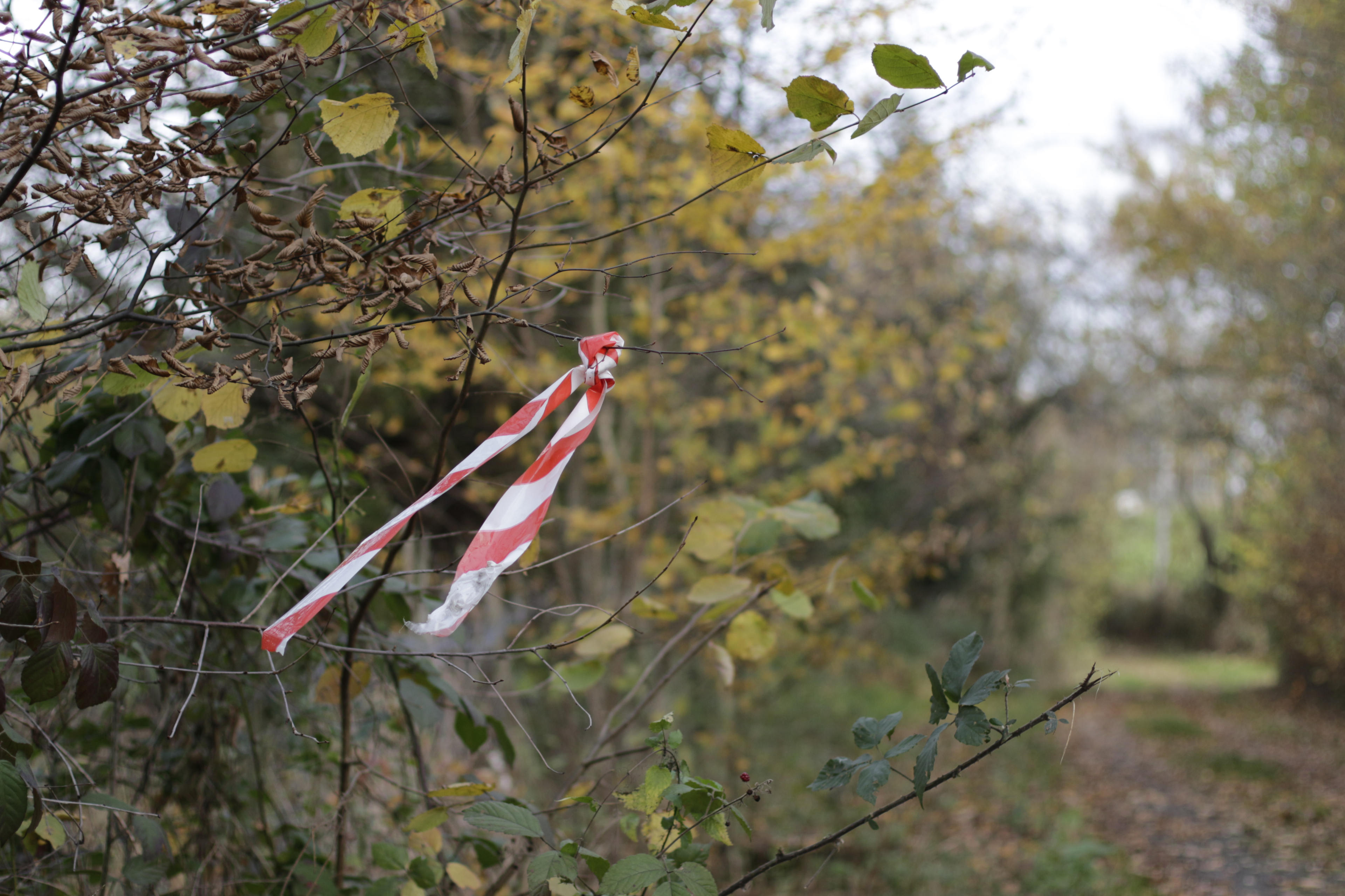 Ich meine mich dunkel zu erinnern, dass ich das gleiche Absperrband bereits schon mal fotografiert habe. Warum das da hängt, ist mir allerdings genau so schleierhaft wie die Begrenzungspfosten weiter oben. Ich nehme an, die haben was mit dem Gedöns zu tun, das hier hinter der Hecke steht. Sieht aus wie Baumaschinen. Gegenüber jedenfalls eine weitere Bank der faulen Liegesorte. ;-)