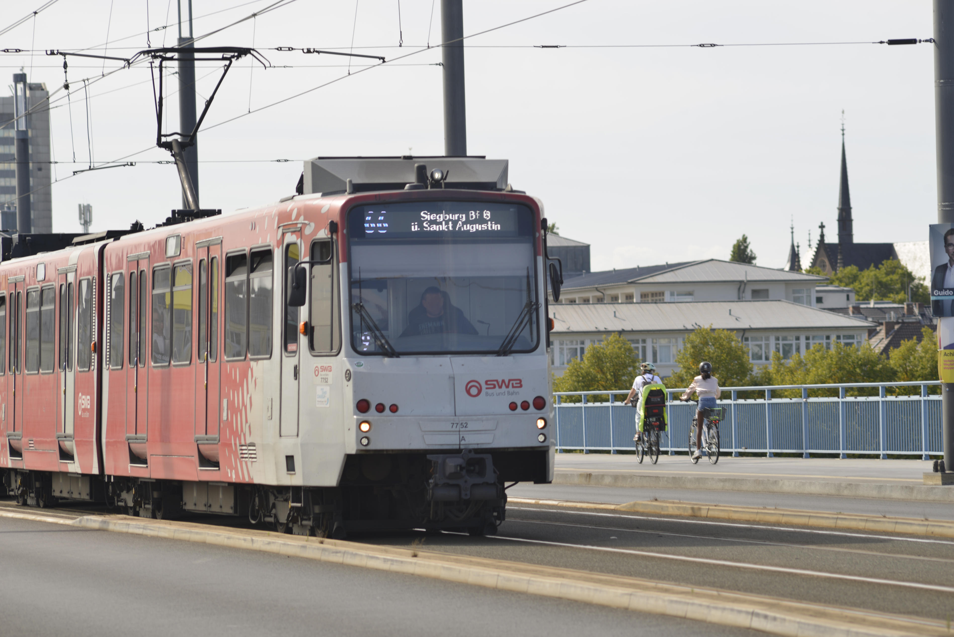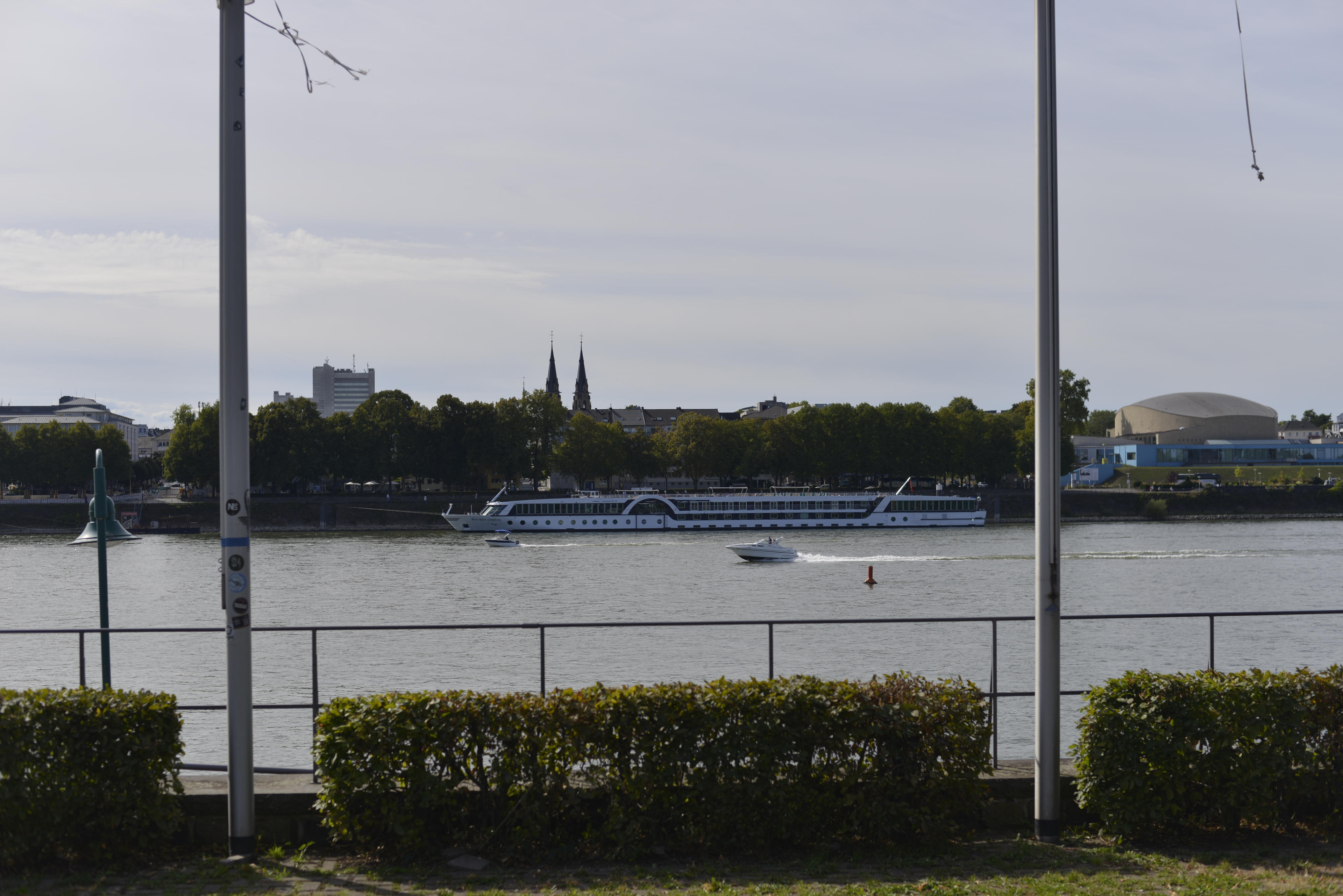 Neben Luft- gab es auch normalen Schiffsverkehr auf dem Rhein, den ich wie immer ebenfalls dokumentiert habe. Und die üblichen Kirchen auf der Bonner und der Beueler Seite des Flusses. Bei der Linie 66 kann man gut sehen, wie die LED-Anzeige flimmert und wie viel sich so eine Straßenbahn innerhalb einer zwehundertfünfzigstel Sekunde bewegt, selbst wenn die auf der Brücke nur 50 oder so fährt. Erstaunlich, dass man das an der Bahn selber gar nicht sehen kann.