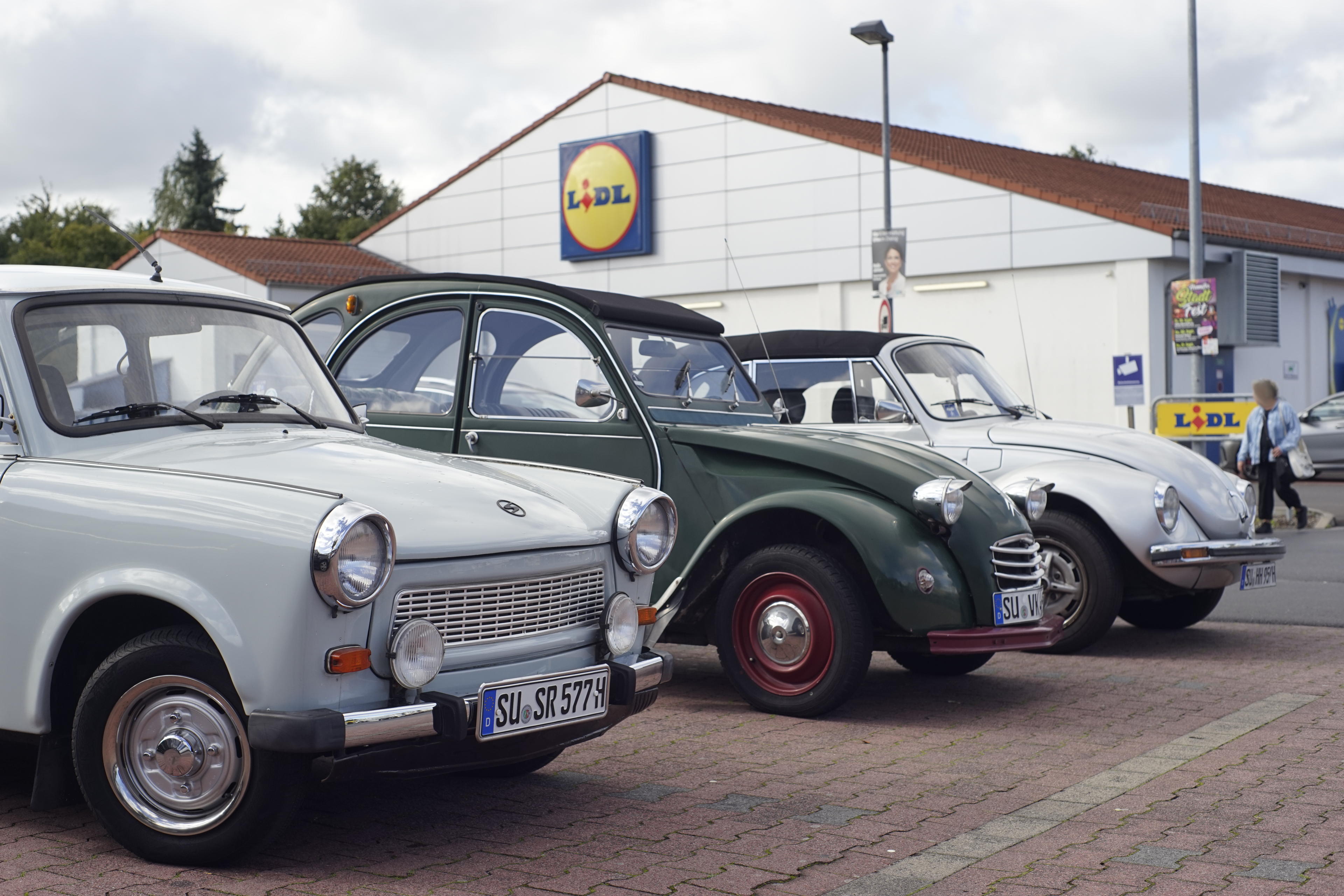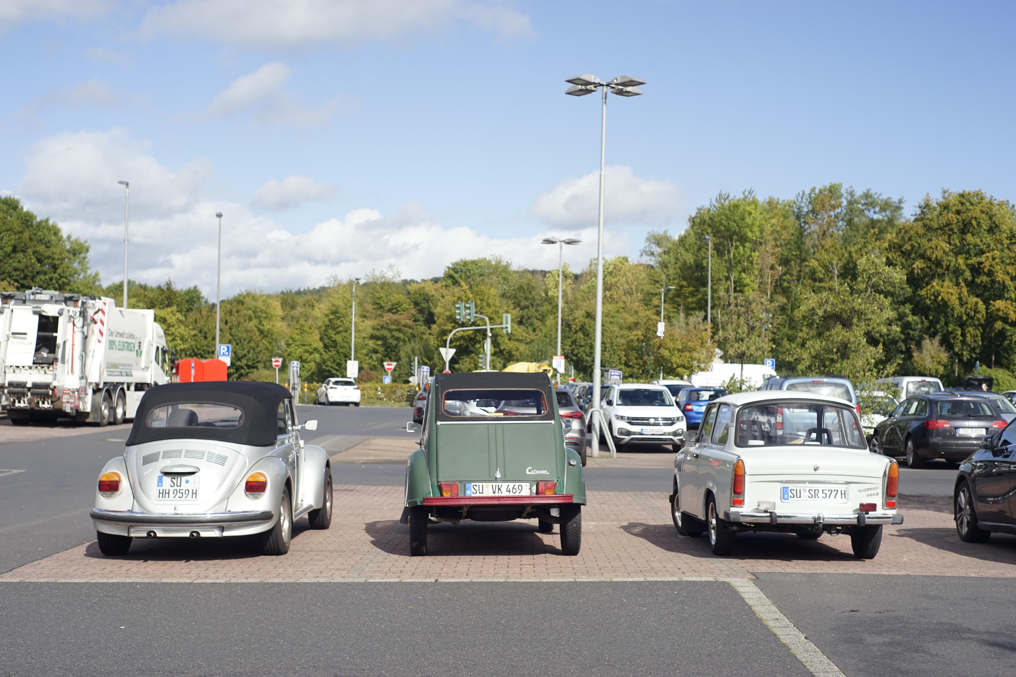 Jedenfalls war ich gerade auf dem Heimweg von Kunde #1, da dachte ich, so ein leckeres Frühstücksbrötchen, das wärs jetzt. Also beim Supermarkt in die Bäckerei rein und Brötchen besorgt und als ich raus kam, standen da diese drei Oldtimer aufgereiht wie für mich gemacht. Da konnte ich nicht anders als die Kamera zücken und ein paar Bilder schießen.