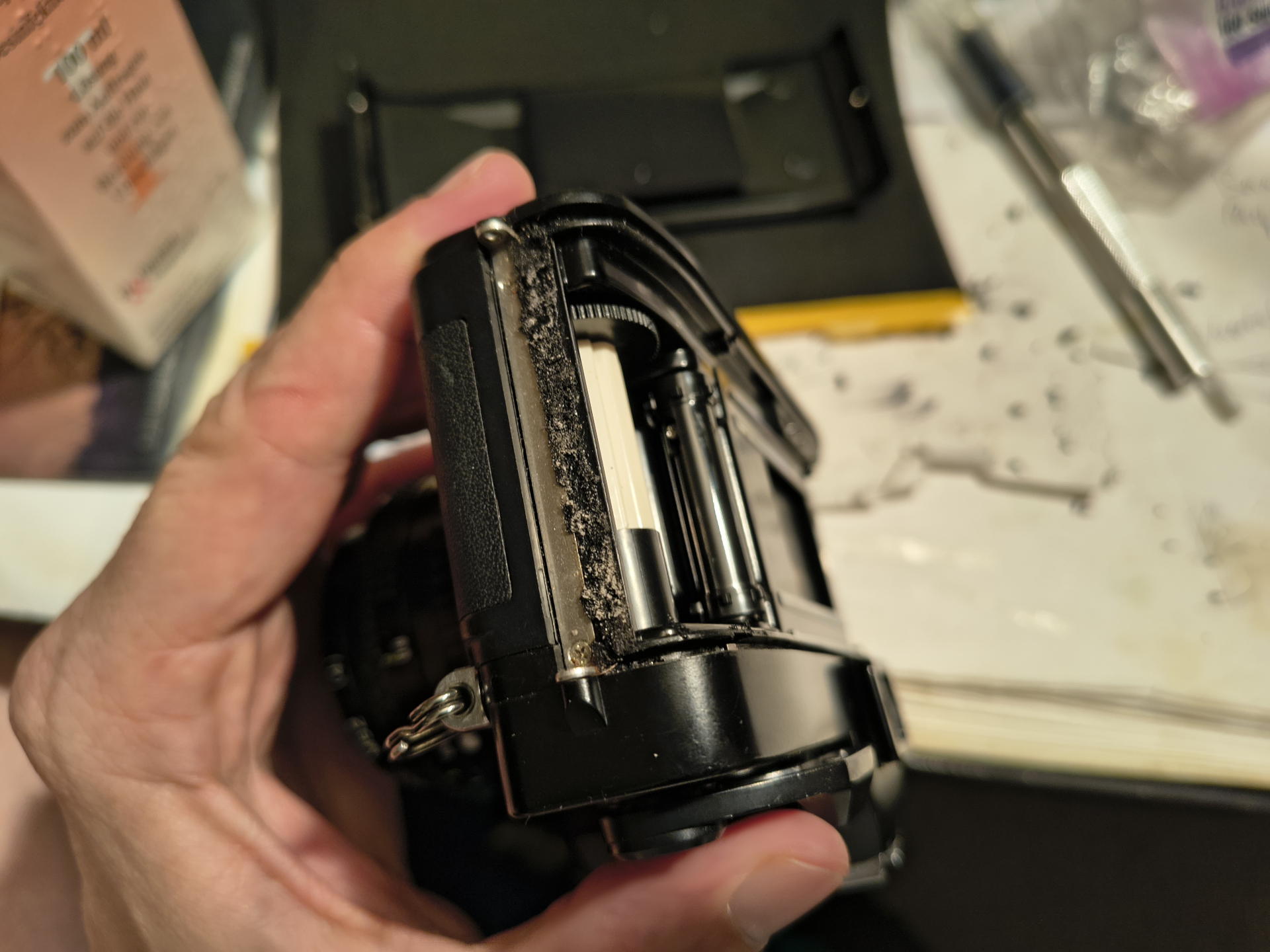 Mittlerweile bin ich recht effizient darin, die Lichtdichtungen in alten Kameras zu erneuern. Das hat mich bei der Ricoh KR-10x, die ich vom Flohmarkt mit gebracht hatte und deren Dichtungen ziemlich getoastet aussahen, vielleicht gerade noch so eine halbe Stunde gekostet. Dabei musste ich die alte erst mal aus den Ritzen kratzen und putzen, die hatten sich nämlich in diese übliche Mischung aus Schlamm und Krümel verwandelt.
