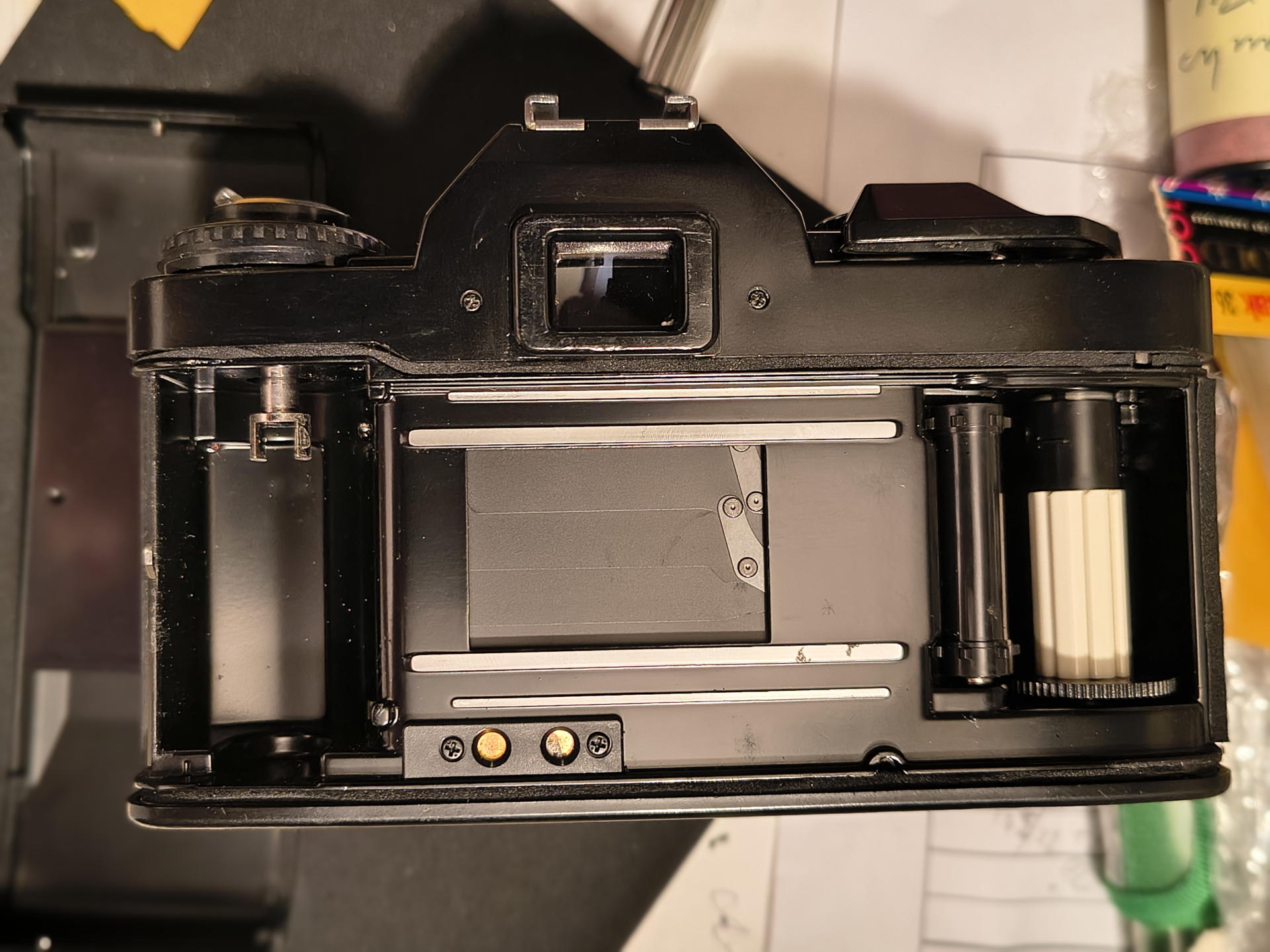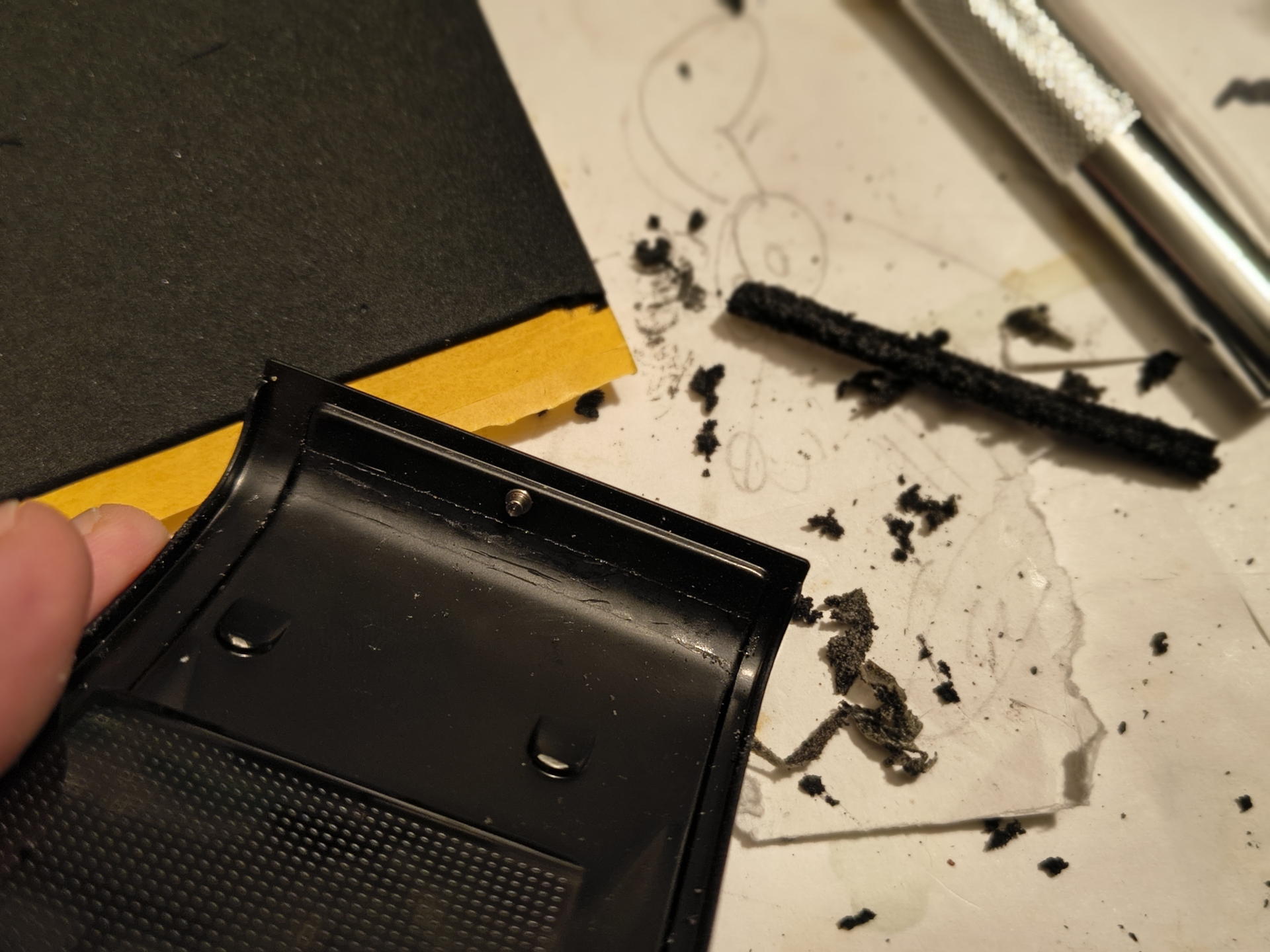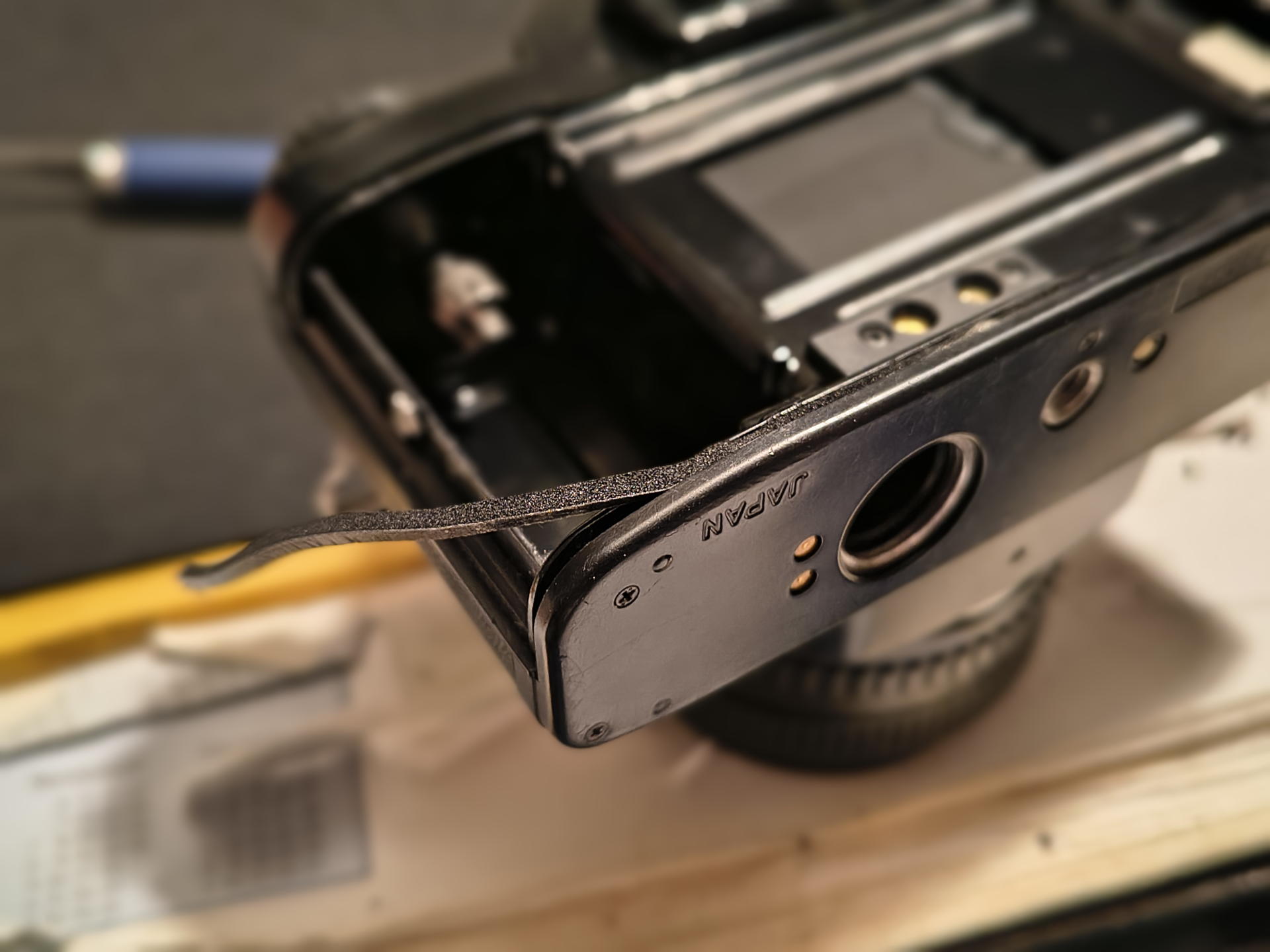 Aber da man die Rückwand glücklicherweise aushängen kann - was bei den alten Kameras der 1970er und 80er ja meist noch der Fall ist -, kam ich auch an die schweren Stellen gut dran. Der Schaumstoff hatte sich glücklicherweise noch nicht komplett in Schlodder zerlegt, sodass ich auch sehen konnte, wo original mal was aufgeklebt gewesen war. Diese Kamera braucht einiges an Dichtmaterial, scheints. Vor allem an der Rückwand sind noch an der Verschluss-Seite oben und unten zusätzliche Streifen eingeklebt gewesen. Ich weiß nicht, ob die tatsächlich nötig sind, aber ich habe sie alle 1:1 ersetzt. Better safe than sorry!