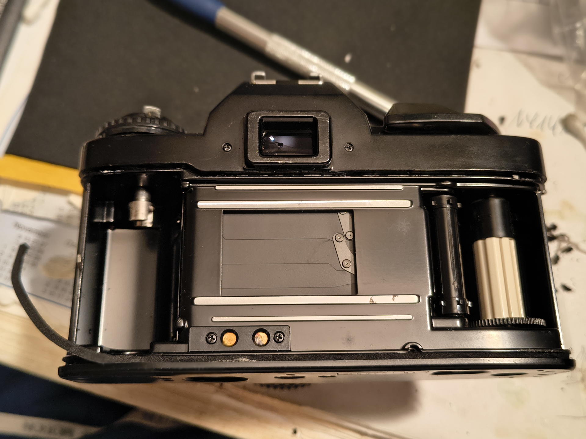 Dieser Austausch hat mir auch die Gelegenheit geboten, mich noch ein bisschen mit dem Innenleben der Kamera auseinanderzusetzen. Der Verschluss hat leider ein paar Kratzer, aber nichts, was in diesem Alter nicht sowieso üblich wäre. Außerdem konnte ich sie noch mal kräftig auspinseln und entstauben. Dementsprechend sind auch recht wenig Flecken auf den Test-Negativen die ich danach gemacht habe. Da habe ich schon ganz andere Kandidaten gesehen. In ihrem vorherigen Leben wurde diese Kamera offensichtlich gut behandelt. Oder zumindest nicht allzu schlecht!