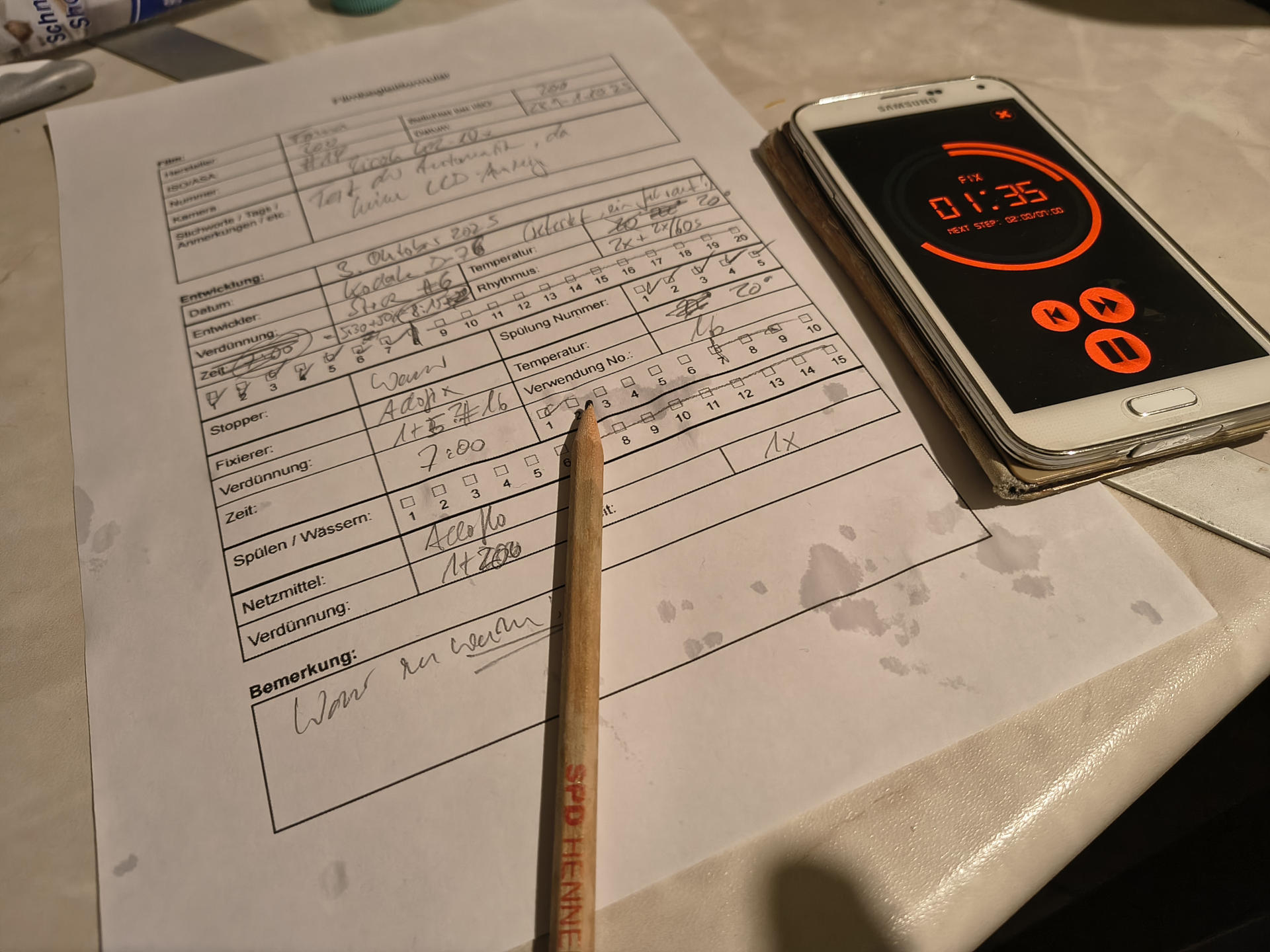 Jedenfalls, bevor ich den Film mit dem Entwickler bekannt gemacht habe, hatte ich natürlich erst mal ein wenig in einen der Messbecher abgefüllt und darin den Schnippsel vom Leader getestet, der ja eh immer abgeschnitten werden muss, um den Film richtig in die Spule zu kriegen. Der war nach 7 Minuten schon gut durch geschwärzt, was eigentlich ein Hinweis hätte sein sollen, dass ich doch nicht so sehr (auf 8 Min.) hätte verlängern sollen. Aber da war das Zeugs ja auch noch in der Abkühlphase nach meiner leichten Überhitzung! ;-)