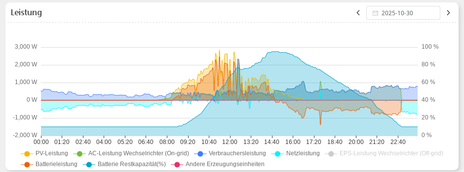 Im Vergleich dazu mal ein guter Tag, zB der 30.10., an dem praktisch den ganze Tag die Sonne geschienen hat und nur zwischendurch mal das ein oder andere Wölkchen vor den Solarmodulen herum schwebte: