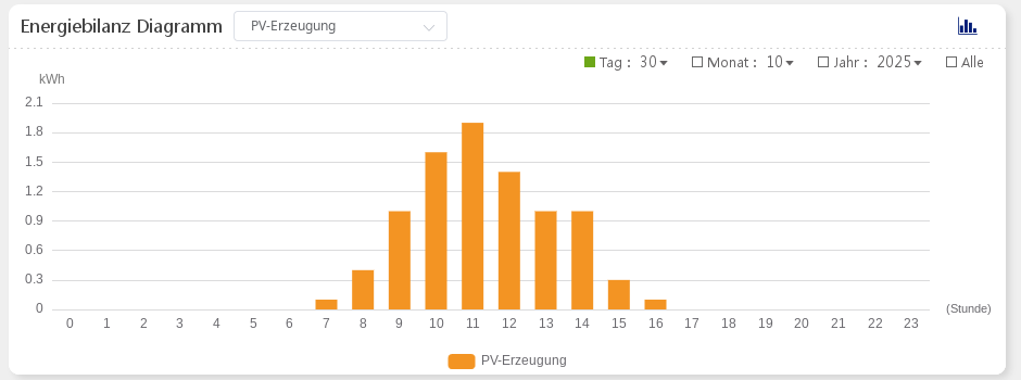 Zum Schluss noch beispielhaft, wie die Produktion aussieht an einem Tag wie heute: Leicht trübe und die Sonne steht selbst mittags niedrig über dem Horizont.