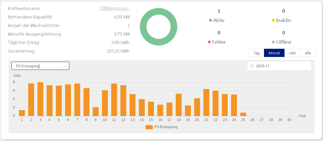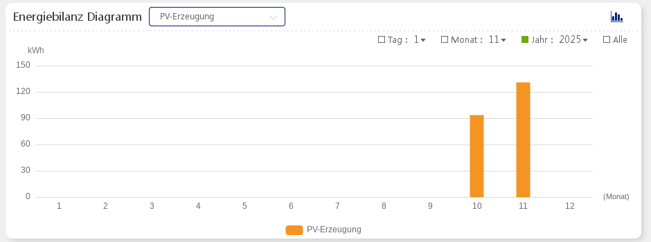 Man sieht: Die Sonne steht jeden Tag weiter unten am Himmel, die Tage werden kürzer. Dieser herbstliche Trend lässt sich sehr gut in den Daten erkennen. Am Anfang des Monats haben wir an einem guten Tag noch 8 kWh bekommen, jetzt gegen Ende sind es mehr so 5 bis 6 kWh am Tag. Das sieht man auch in der Monatsübersicht: Obwohl wir im Oktober praktisch nur eine Woche Betriebszeit hatten - allerdings eine recht sonnige -, haben wir trotzdem 2/3 des Stroms ernten können, den der ganze November bis heute (25.11.) bereitstellen konnte.