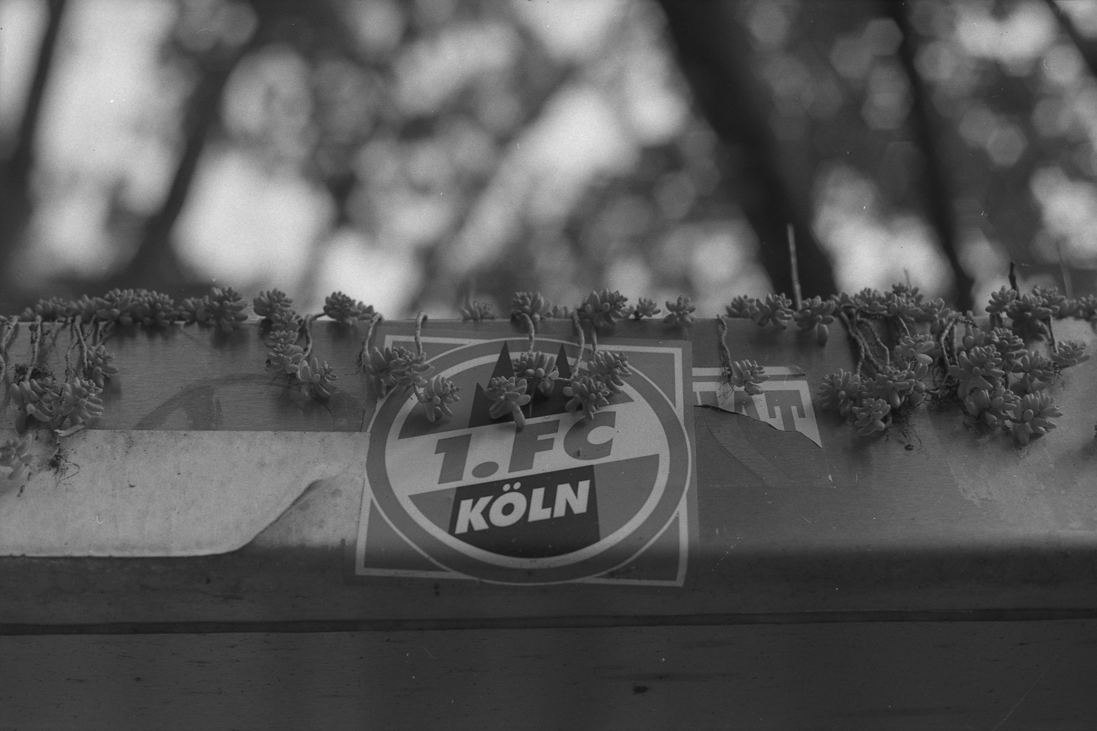 Hier, in den näheren Ausläufern des nicht-mehr-ganz-aber-eigentlich-doch-Rheinlandes findet man verdammt oft Sticker des 1. FC. So auch am Bücherschrank. (1/250s, f/4.) Ich scheine auch endlich mal das mit dem korrekten Fokussieren hin bekommen zu haben, das ich in den ersten beiden Artikeln ja so bemängelt habe. Scheint also doch eher an meiner Brillenstärke als an der Kamera zu liegen. Hier jedenfalls perfekt gesetzt. Und ich finde, das Bild ist richtig spannend geworden mit der Unschärfe im Hintergrund, den großen Sechsecken, den sehr scharfen Ranken, die übers Dach ragen, und schließlich dem Aufkleber in der Mitte, der den ganzen Lokalstolz in eine Aussage zusammenfasst: Ein Dom, ein Verein!