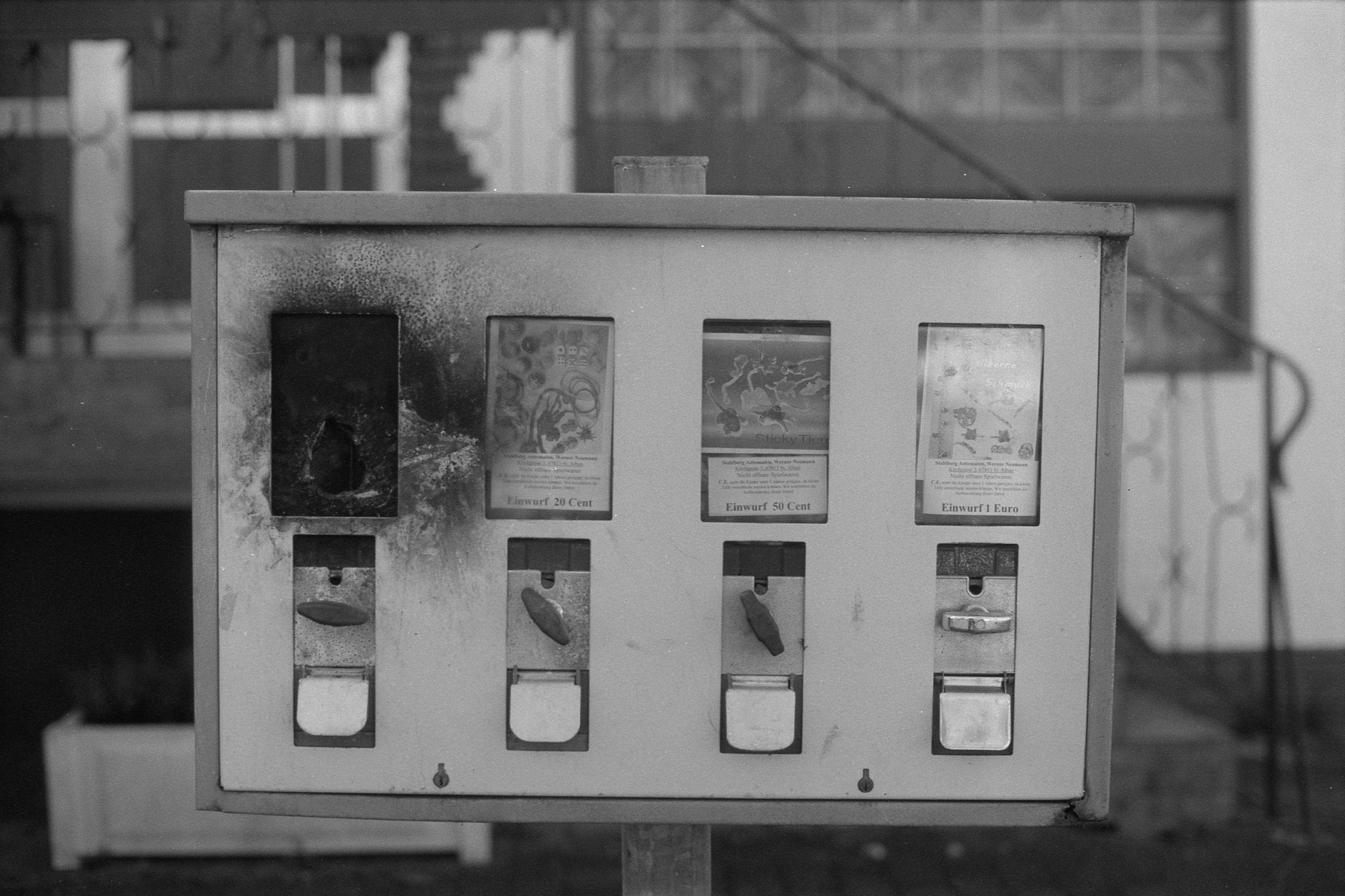 Auf dem Weg durch Geisbach habe ich dann noch mal wieder den Kaugummiautomaten vor dem kleinen Eisverkäuferladen mitgenommen, denn der hat mittlerweile einen Einbruchsversuch hinter sich. (1/1000s, f/2,8.) Hier im Schatten konnte ich die Blende direkt mal etwas weiter öffnen und im Hintergrund ein bisschen mehr Bokeh erzeugen. Und ich habe Vandalismus dokumentiert, der in s/w schon fast ästhetisch aussieht. Bleibt die Frage, wer für den Firlefanz da drin in kauf nimmt, wenn er erwischt wird, dafür verknackt zu werden, Jugendstrafe, Park putzen, Bänke wienern! Blagen, weißte! Ich mein, so'n Automat ist sicher nicht billig, der Schaden ist wahrscheinlich größer als der Wert des Temu-Inhalts! Wenn es wenigstens Kaugummis wären... Aber ich schweife ab...