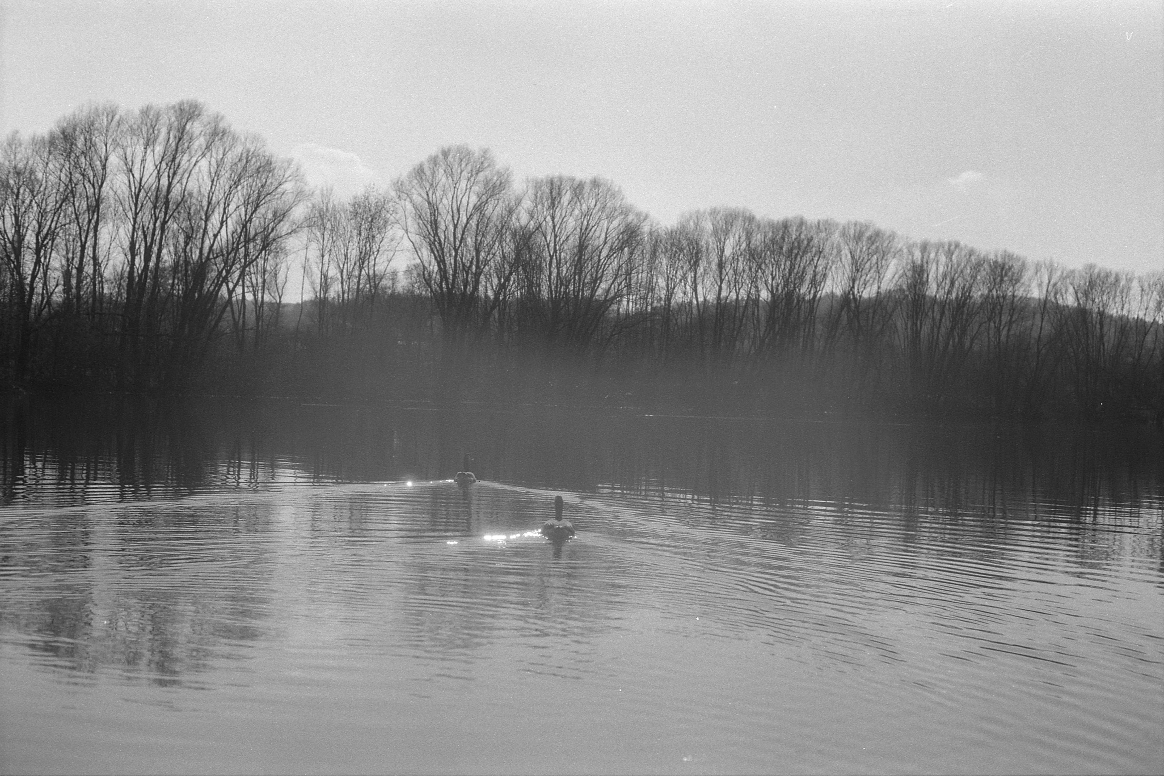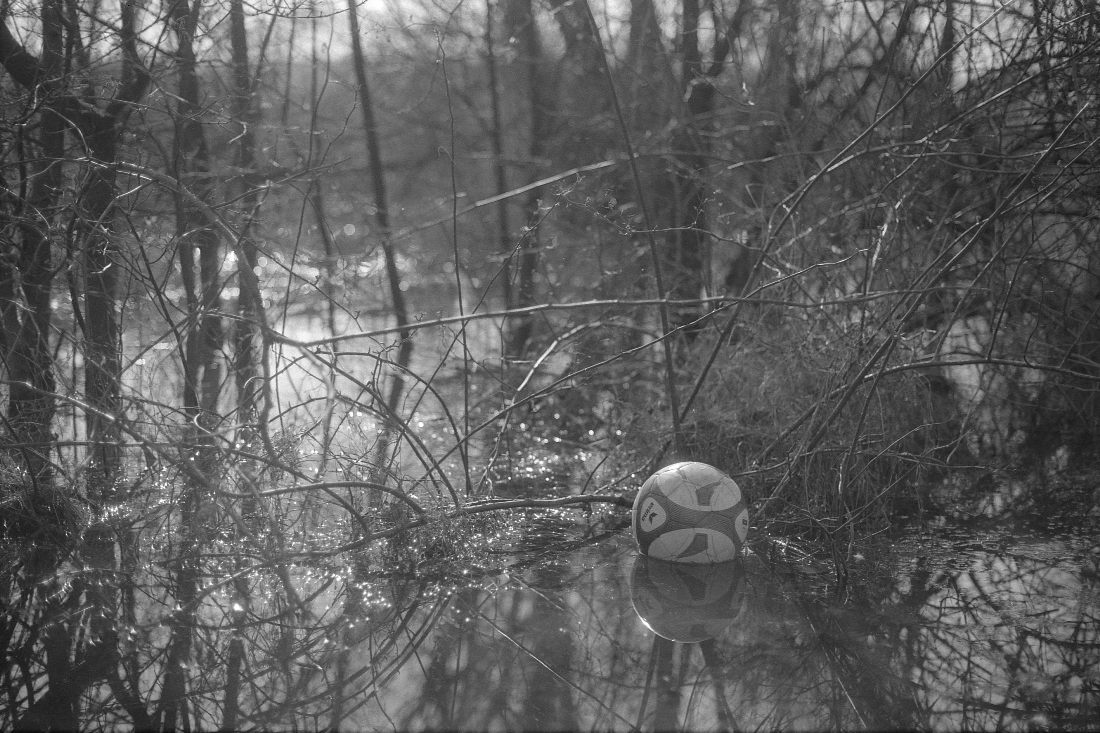 Am Ufer des Sees trieb dann noch dieser Fußball im Wasser, ich dachte erst, es wäre ein Straußenei. (1/1000s, f/2.) Hui, das bisher am weitesten offene Bild, hier zwischen den Ästen und Zweigen im Halbschatten. (Ich belichte ja eh immer lieber etwas reichlich und und entwickle dafür kürzer, zumindest bei diesem Sommerwetter und mit manuellen Kameras. Das hab ich noch so vom Foma drin, der das Licht ja liebt.) Spannendes Foto, das mit Reflexion und Unschärfe spielt.