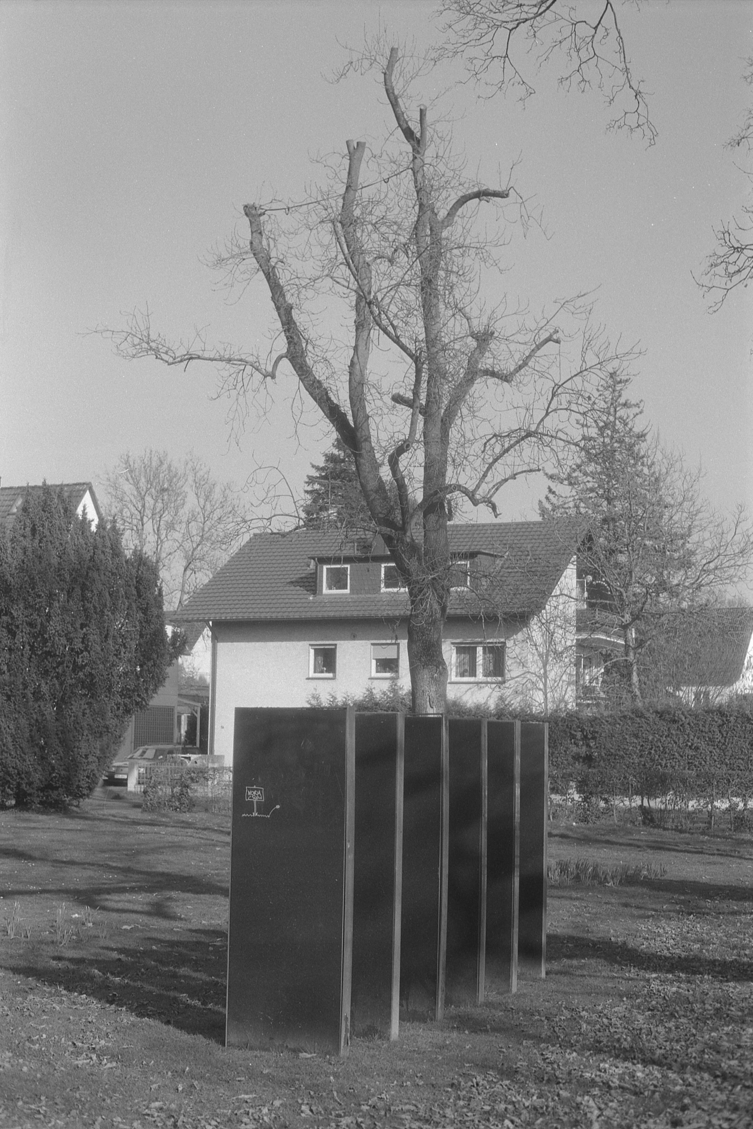 Dann in der Stadt Stahlplatten fotografiert, die da in dem kleinen Park stehen, Kunst halt. (1/1000s, f/4.) Insbesondere zu beachten, das mit weißem Edding gemalte Schild mit Blume. Sowas ist meine Art von Humor. Das blöde weiße Haus im Hintergrund stört mich, vor alle der Volvo (schon wieder) in der Einfahrt. Aber OK, man kann sich nicht alles aussuchen, das ist hier Fotografie, keine Malerei. Ob die KI mir das weg rechnen kann?