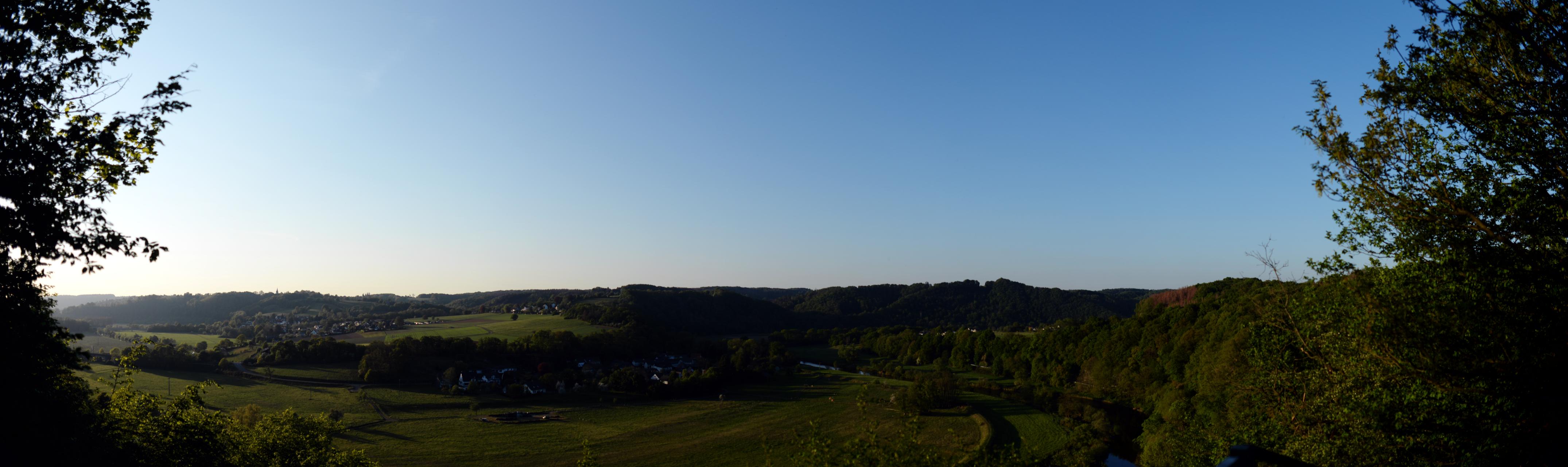 Nachdem wir unten an der Sieg fertig waren, haben wir uns einen anderen Weg wieder hoch gekämpft, aber nicht, ohne zwischendurch noch ein paar Fotos vom Aussichtspunkt zu machen, die ich dann nachher mit hugin zusammen gestitcht habe. Das ganze Siegtal habe ich drauf gekriegt, also zumindest vom Teil, den man vom "Drachenblick" aus sehen kann. Drachen gab's aber keine zu sehen. Schade, eigentlich.