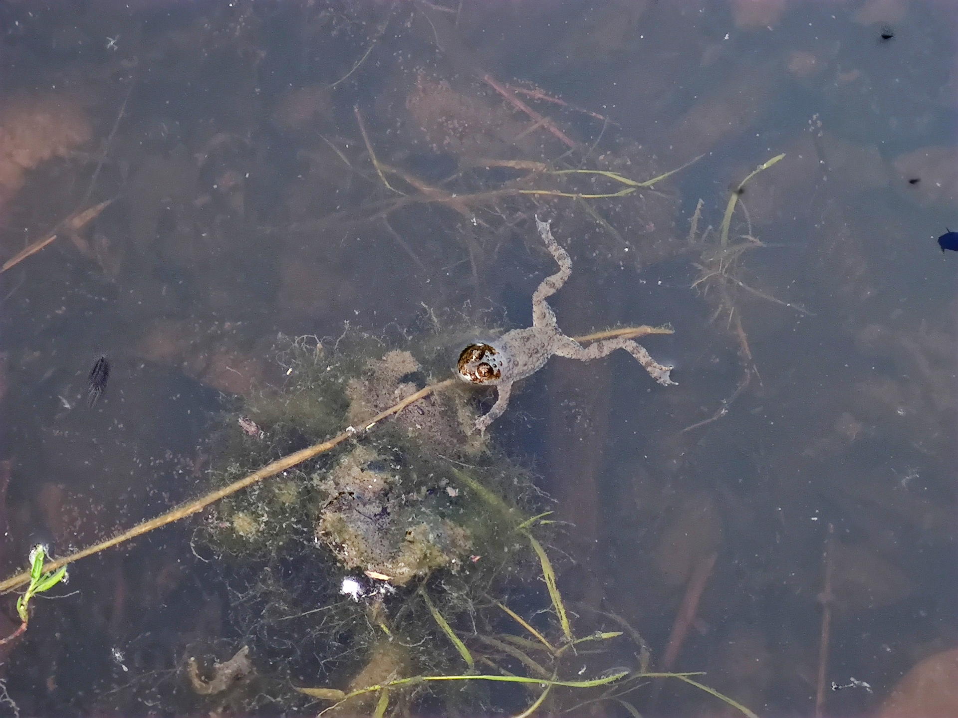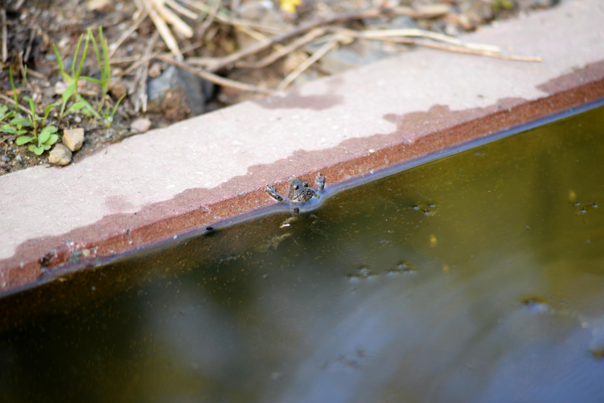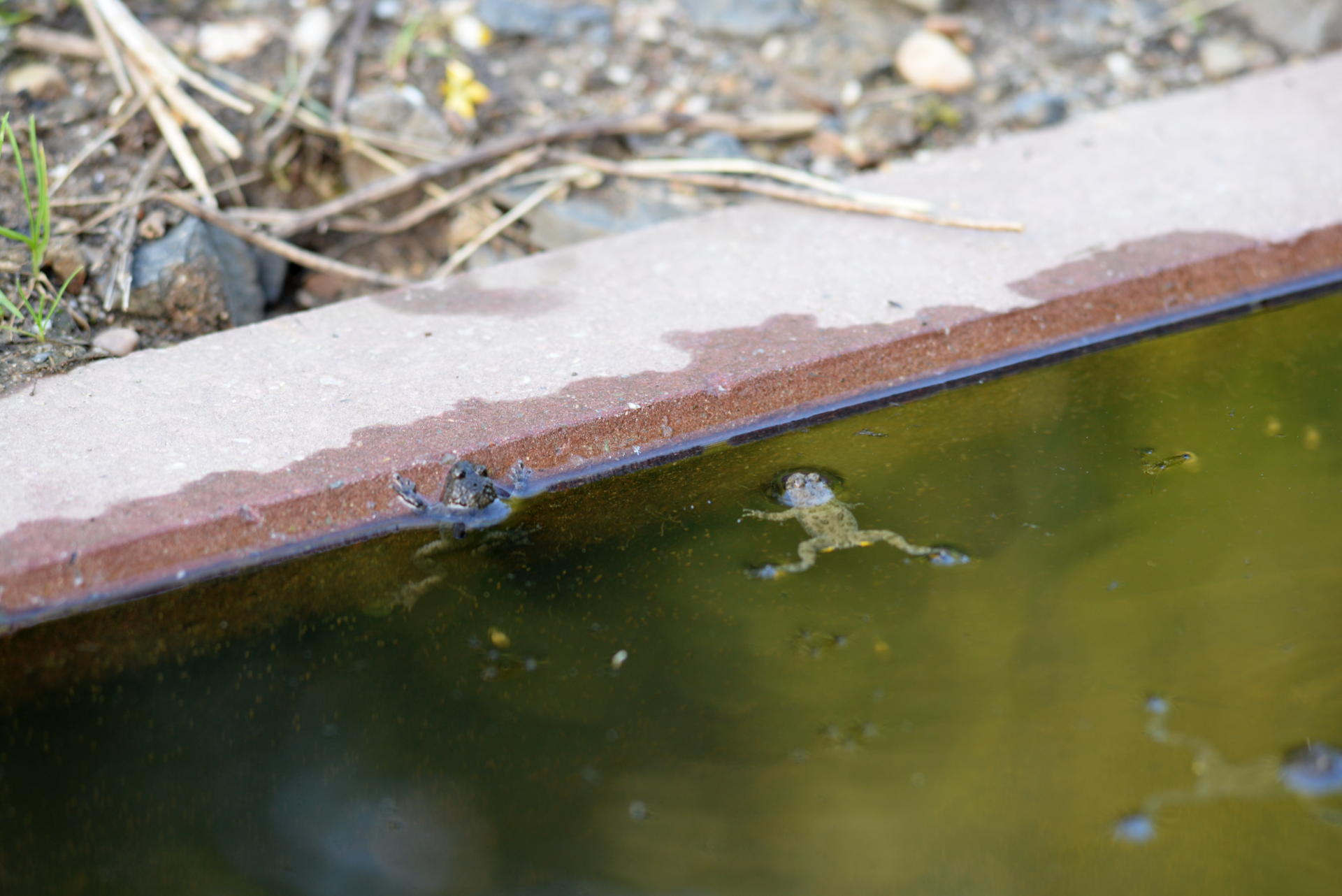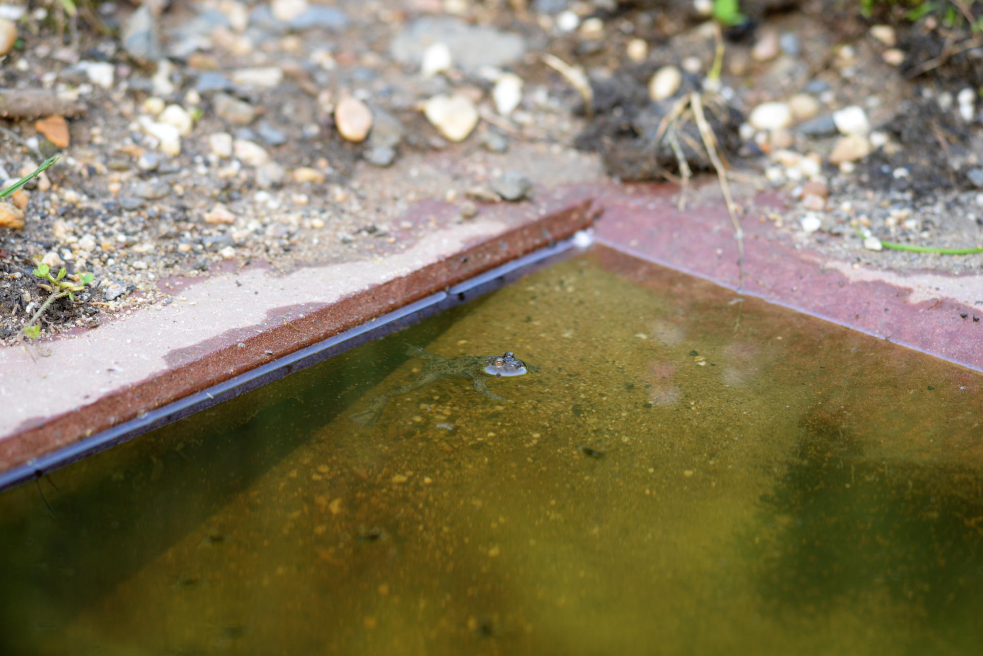 Unten am Eingang zum Steinbruch ist ein kleines Becken für Amphibien in den Boden eingelassen. Da tummelten sich mehrere Kröten im Wasser und bewachten ihre Brut. Machen die das? Keine Ahnung, da waren jedenfalls diverse Kaulquappen mit im Wasser. Da ich allerdings den Polfilter nicht dabei hatte, konnte ich die nicht fotografieren, die Oberfläche hat zu sehr gespiegelt. Wie man vielleicht auch an den Krötenfotos sehen kann.