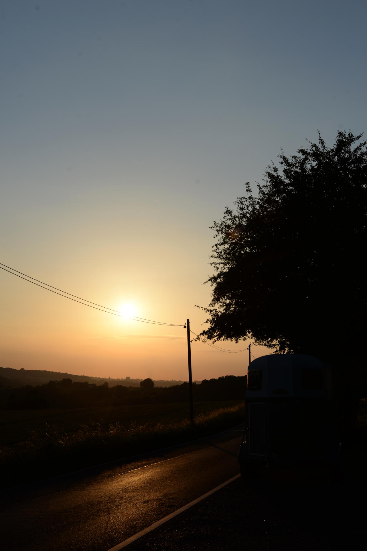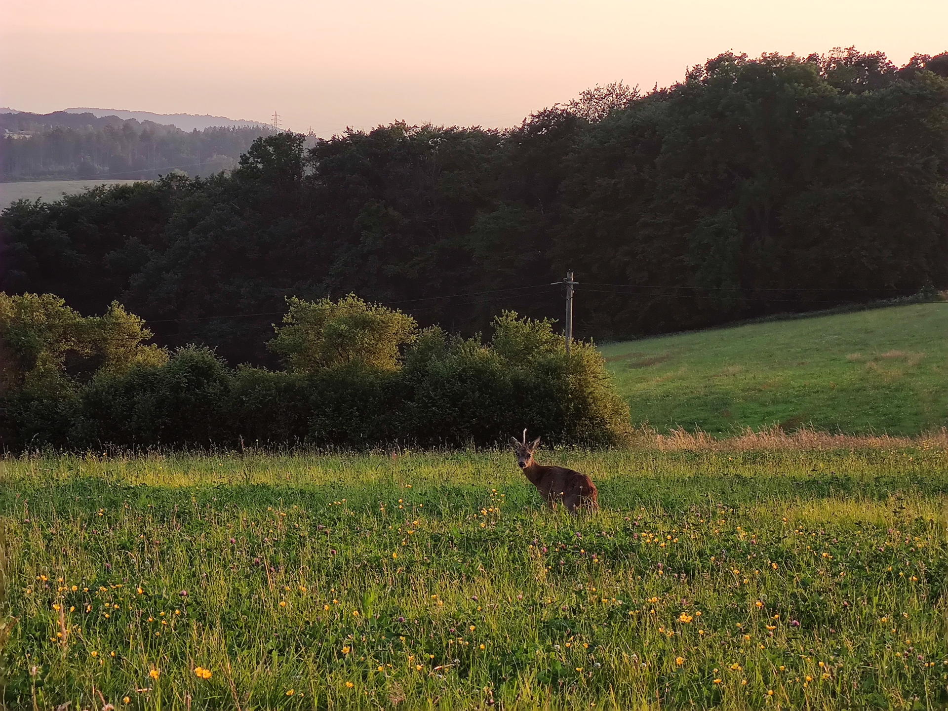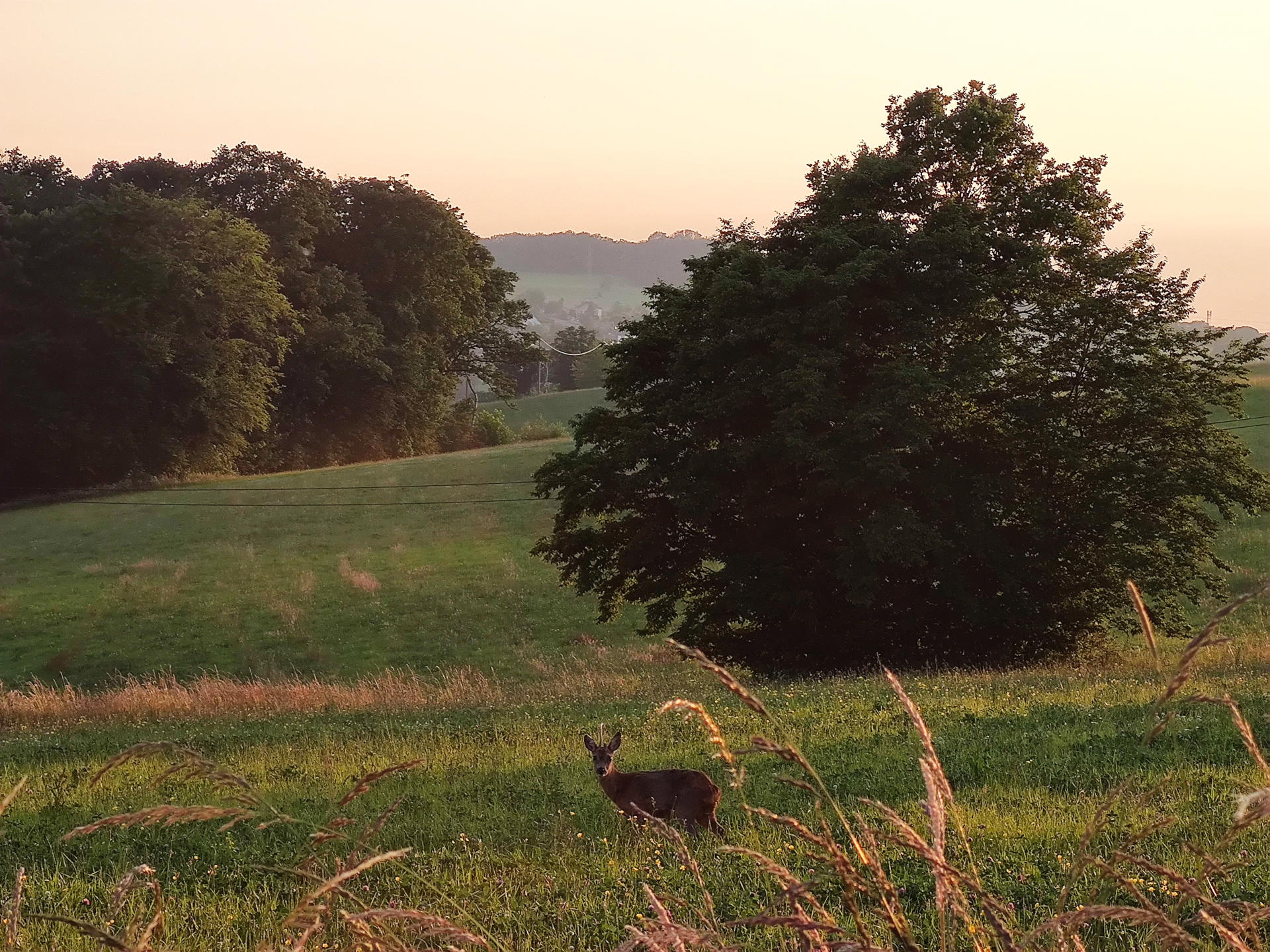 Und mit diesem hübschen Sonnenuntergang verabschiede ich mich für heute. Ach nee, moment, ich wollte doch noch ein Bild vom Handy hier einfügen: Das Rehböckchen hat nämlich auf dem Heimweg noch einmal plötzlich mitten auf der Straße gestanden und ging dann nicht weiter, sodass ich es fast problemlos fotografieren konnte.
