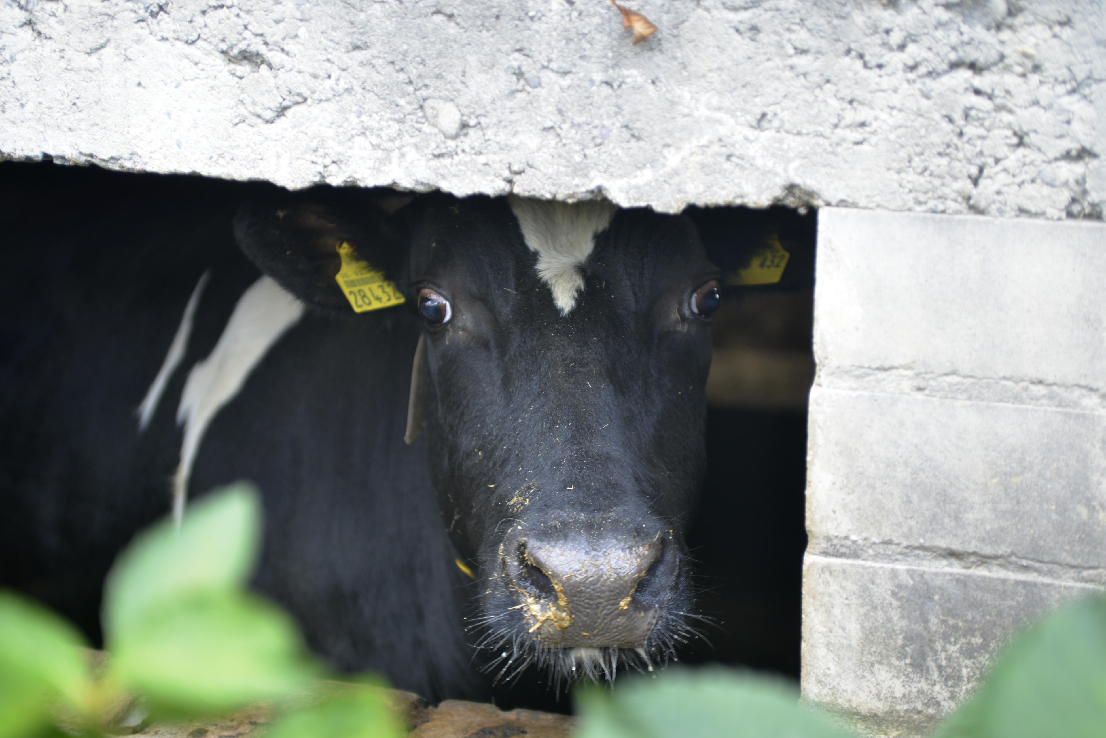 Und hier kommen wir dann zu den Kühen im Stall. Die eine war extrem neugierig und hat die ganze Zeit ihren Kopf aus dem Loch in der Mauer gestreckt, während ich versucht habe, die Dolde am Hortensienbusch zu fotografieren. Die dachte wohl, es gibt was. Gab aber nix. Außer Fotos.
