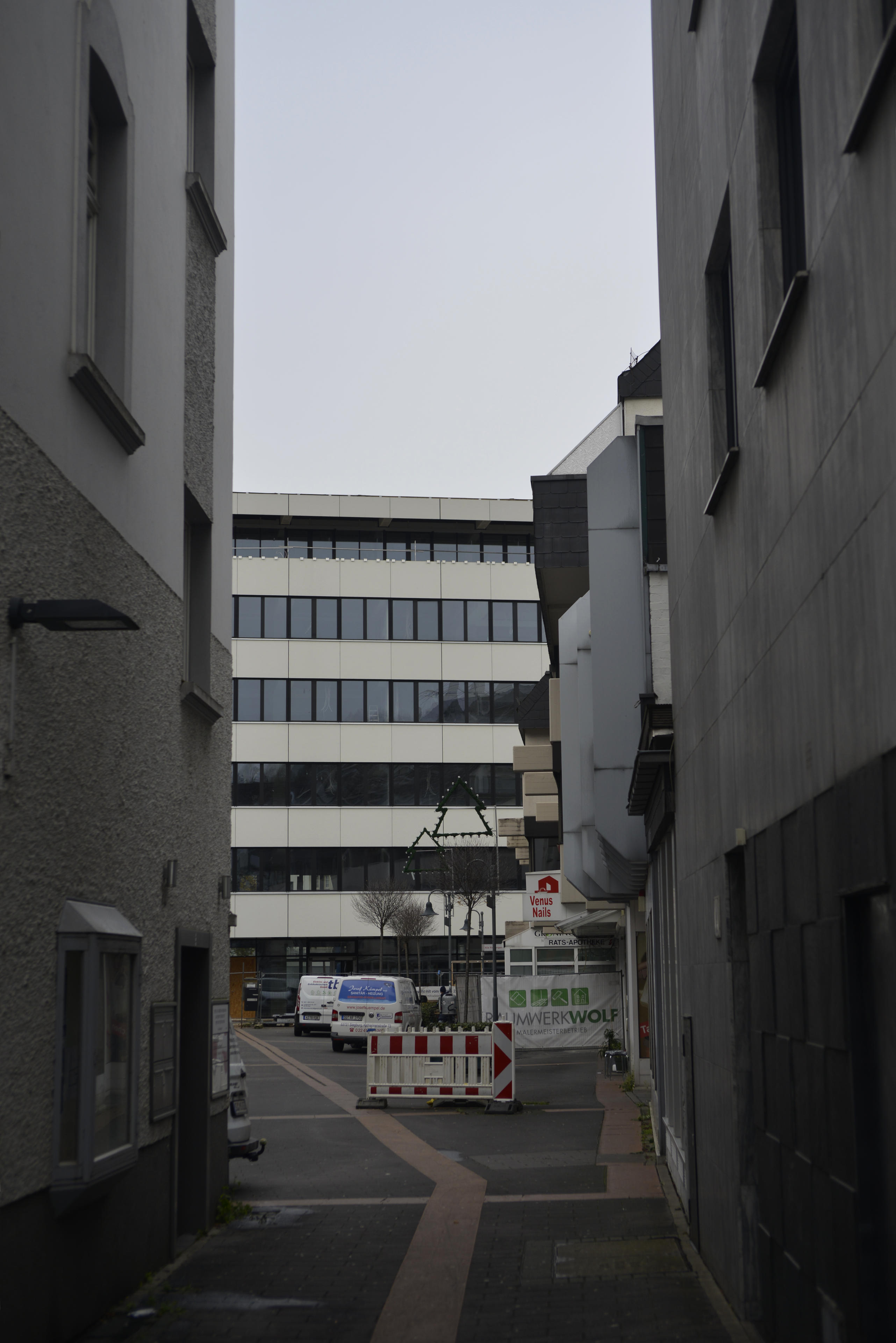 Siegburg ist zwar jetzt nicht Frankfurt, aber trotzdem ein geeignetes Pflaster, um zu testen, was das Nikkor 35-80 f/2,8 mit geraden Linien macht, wenn man damit Gebäude und sowas fotografiert. Deswegen habe ich statt der Canon die Nikon genommen, als ich am Donnerstag eh nach Siegburg musste. Nebenbei wurde hier auch noch gerade der Weihnachts-/Mittelaltermarkt aufgebaut und ich durfte helfen, eines der Zelte aufzustellen. Aber das ist eine andere Geschichte!