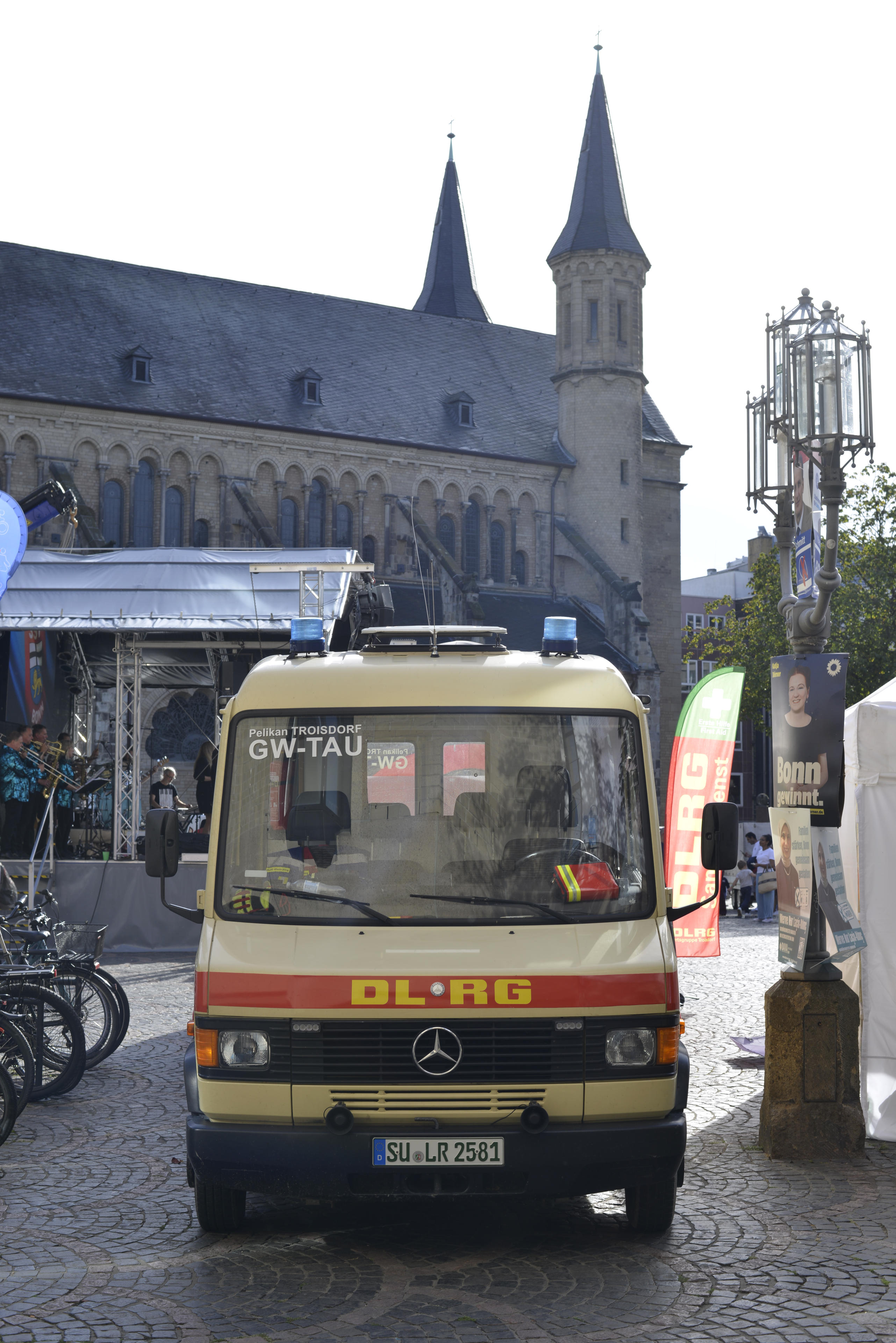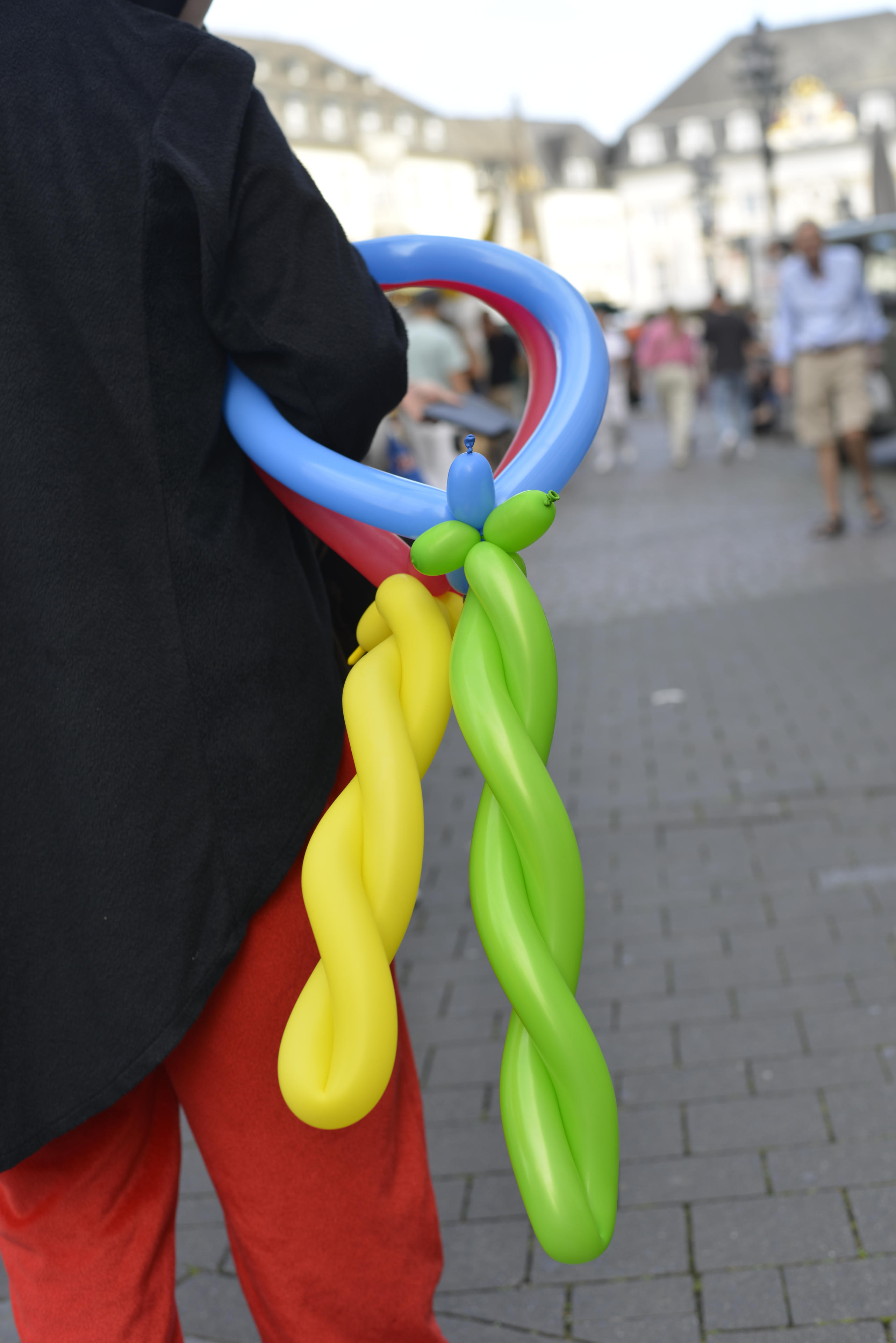 Trotz der doch recht voluminösen Größe der D800, mit dem Griff zusätzlich unten drunter vor allem, ist sie mit so einem kleinen 50er doch recht unauffällig, stelle ich immer wieder fest. Weshalb auch der Mickey-Maus-Ballonist nicht gemerkt haben sollte, dass ich seinen Popo fotografiert habe. Also, eigentlich habe ich dieses schnullerartige Gebammsel an seinem Arm ins Visier genommen. Das War auf dem Rathausplatz, auf dem wir aber nicht allzu viel Zeit verbracht haben, weil da die Wahlveranstaltung der CDU abging, die ich jetzt nur mäßig interessant fand. Stattdessen weiter zum Münster, wo die DLRG und andere Vereine so eine Art Sommerfest hatten. An die anderen kann ich mich nicht richtig erinnern, denn die waren praktisch in dem Moment fertig, als wir da aufgetaucht sind. Das Ordnungsamt ist wohl sehr streng, wenn die ihre Zeiten überschreiten. Da stand auch das Kinderfahrrad rum, das mich miondestens so magisch angezogen hat wie die Vespas oben!