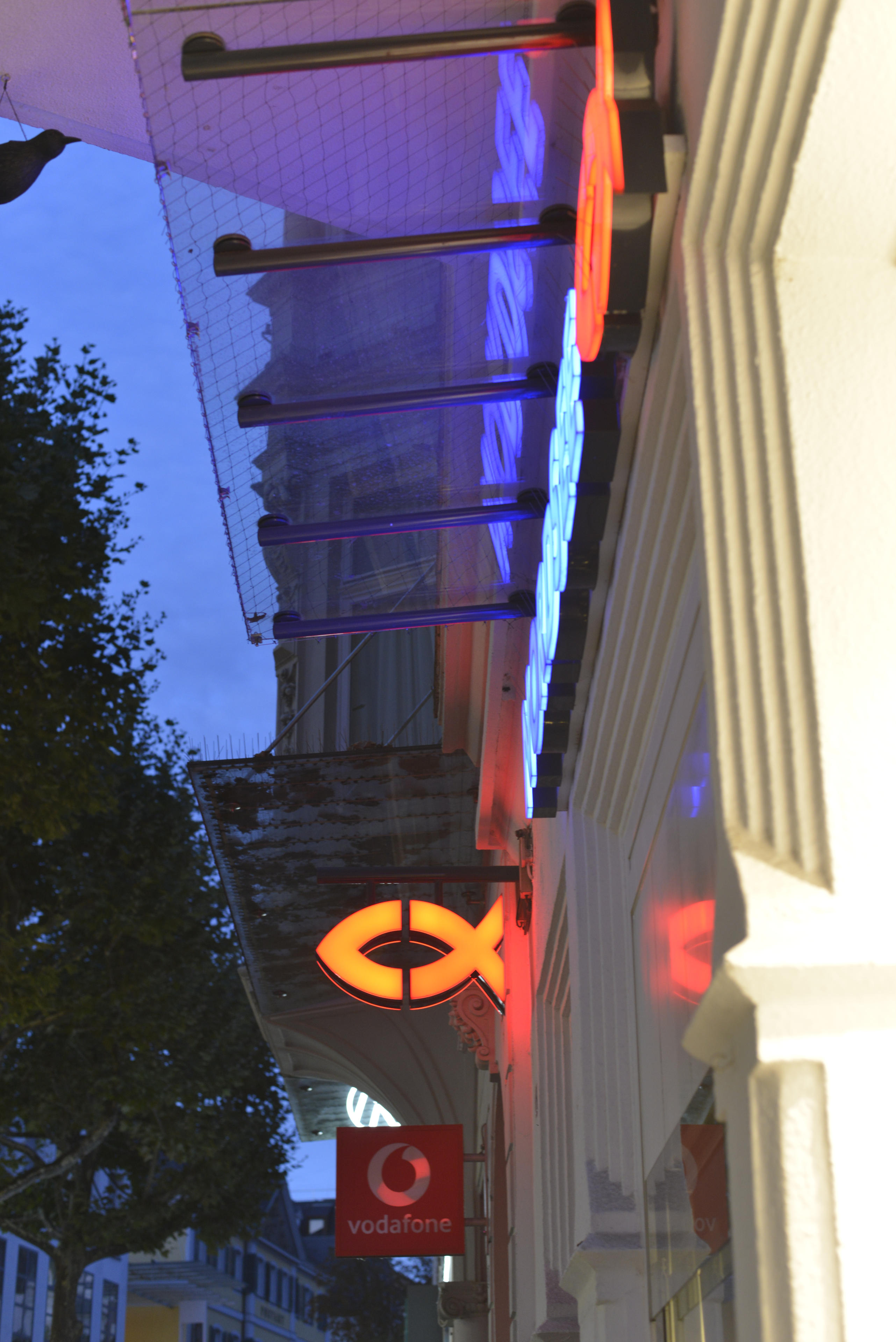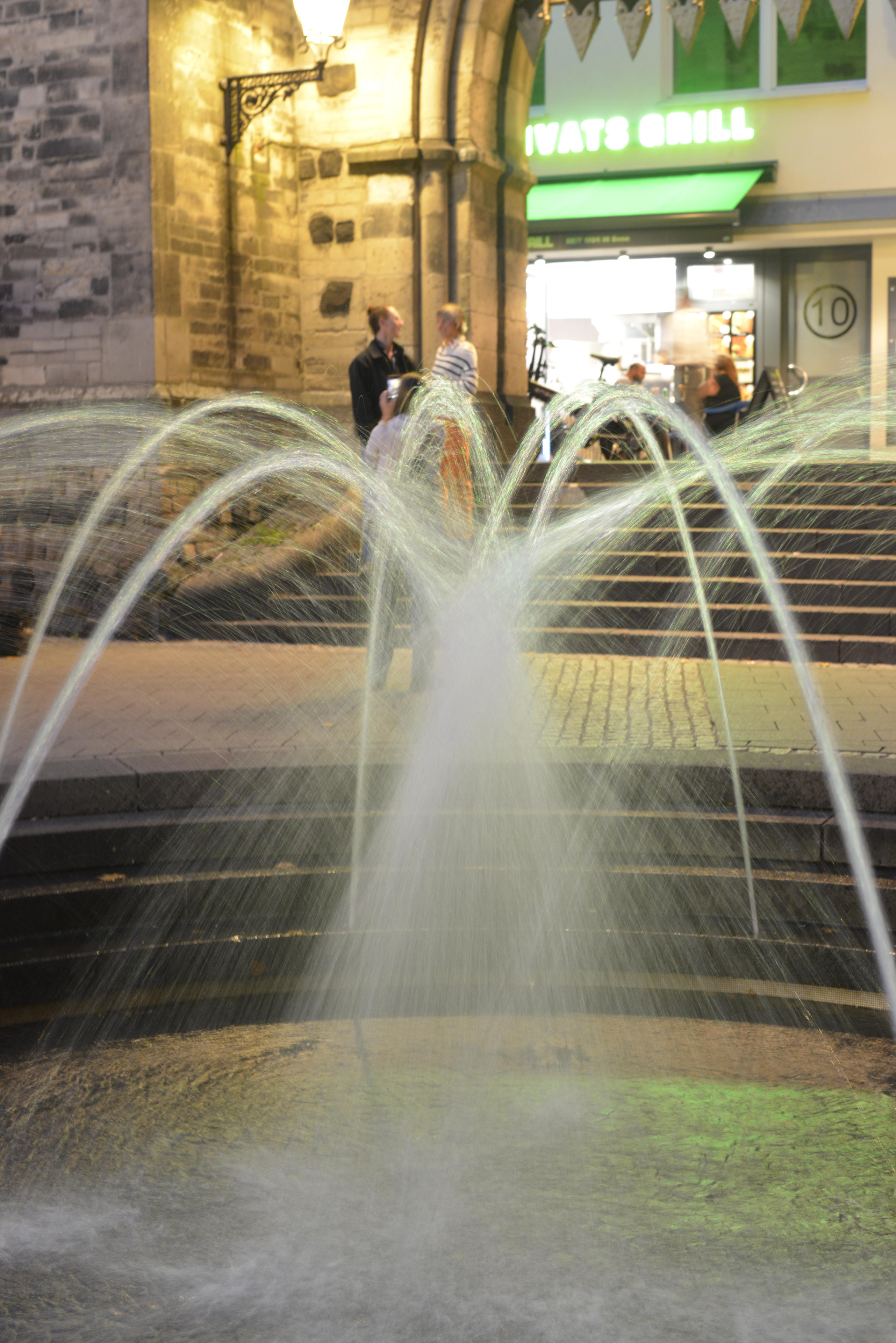 Dann, nach dem TD, wieder quer durch die Stadt zurück nach Beuel, wo wir geparkt hatten. Ich einfach auf Manuell gestellt und drauf gehalten. Das geht erstaunlich gut, wenn man das einmal richtig eingemessen hat. Die Programm- und Automatik-Modi lassen sich ja gerne von den grellen Lichtern verwirren. Oder einfach mal ganz lang belichten und den Brunnen ins Visier nehmen! Die Stadt leuchtet jedenfalls nachts in den buntesten Farben. Fehlt noch ein bisschen Feuchtigkeit auf den Straßen, wie die das in den Filmen machen, damit die reflektieren und man dadurch auch noch bunt auf den Böden bekommt. Aber ich kann ja jetzt schlecht die Hydranten öffnen!