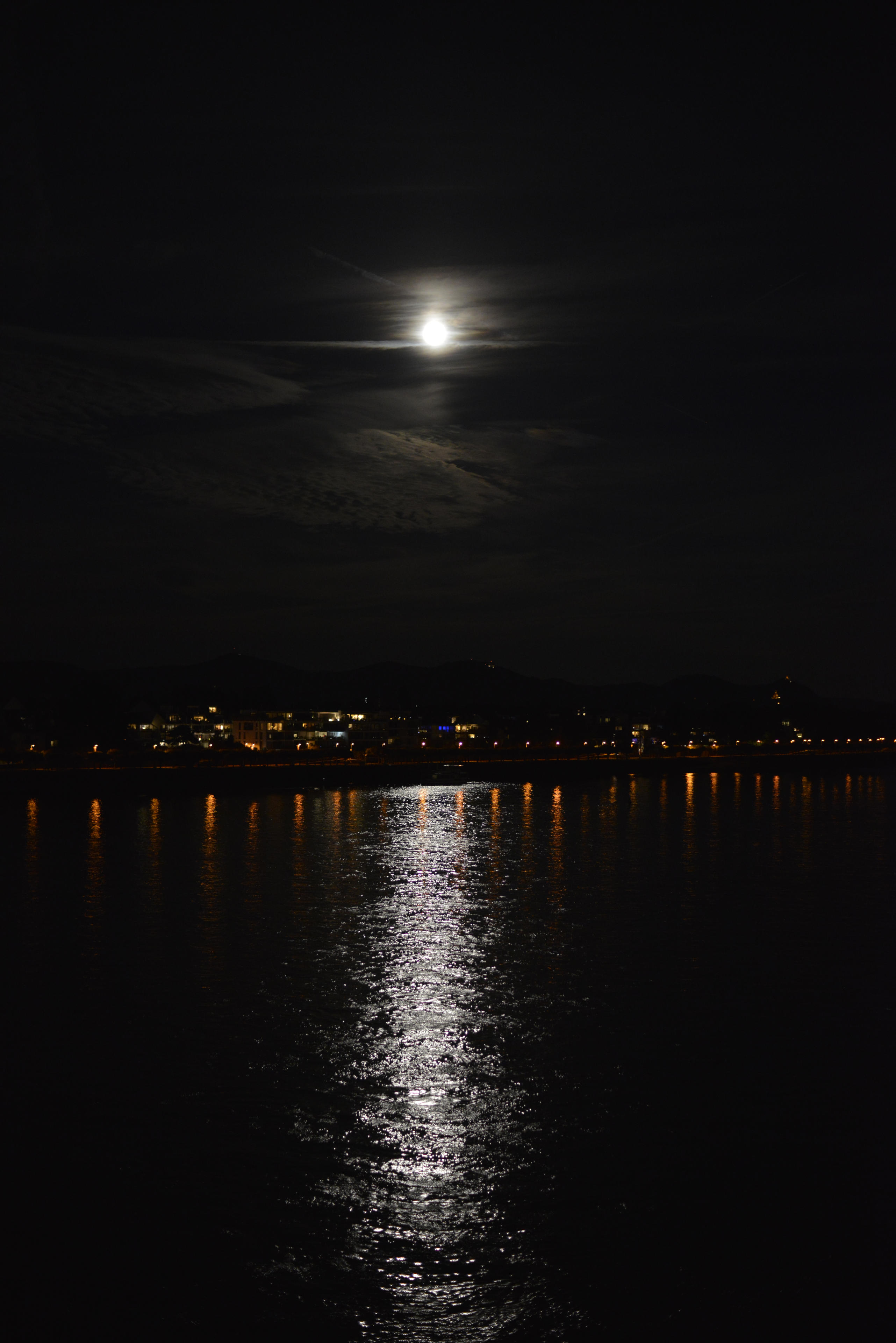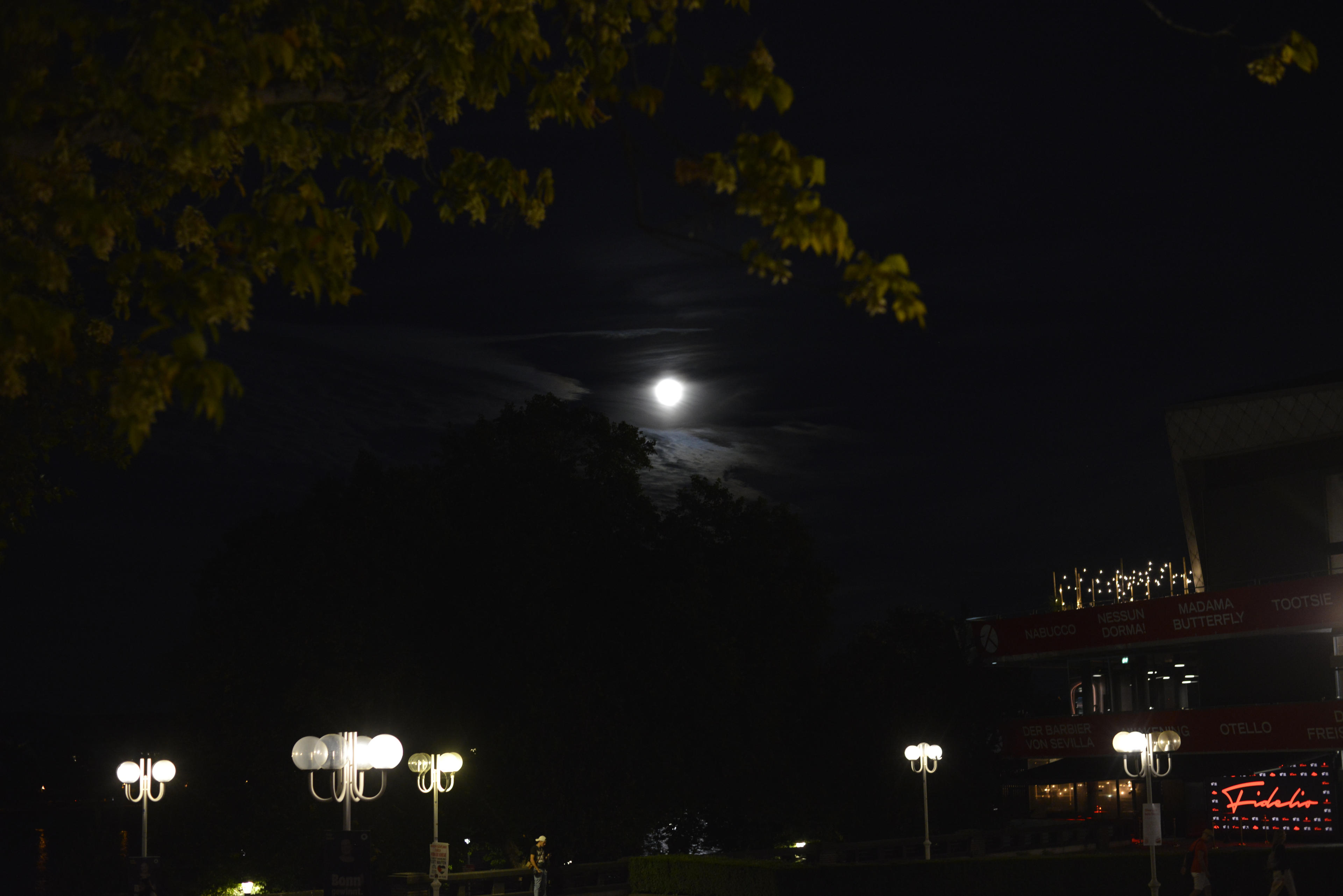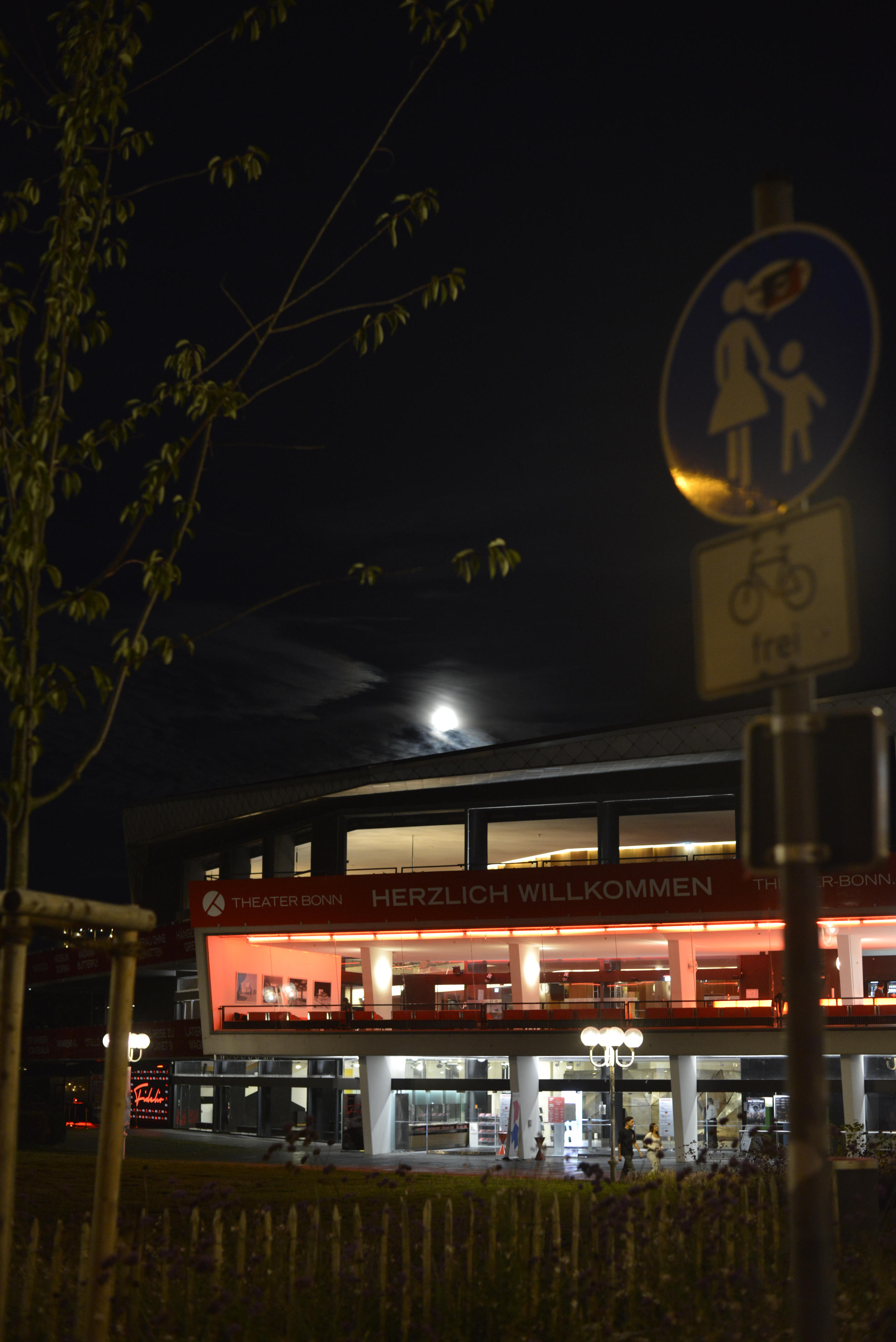 Überm Rhein dann ein fast voller Mond. Das war den Tag vor der Mondfinsternis. Sind ein paar nette Bilder geworden. Der Mond ist immer erschreckend hell, stelle ich fest. Schwer im Kontext mit der dann doch eher dunklen Stadt zu fotografieren. An der Oper ist mir das ganz gut gelungen, glaube ich.