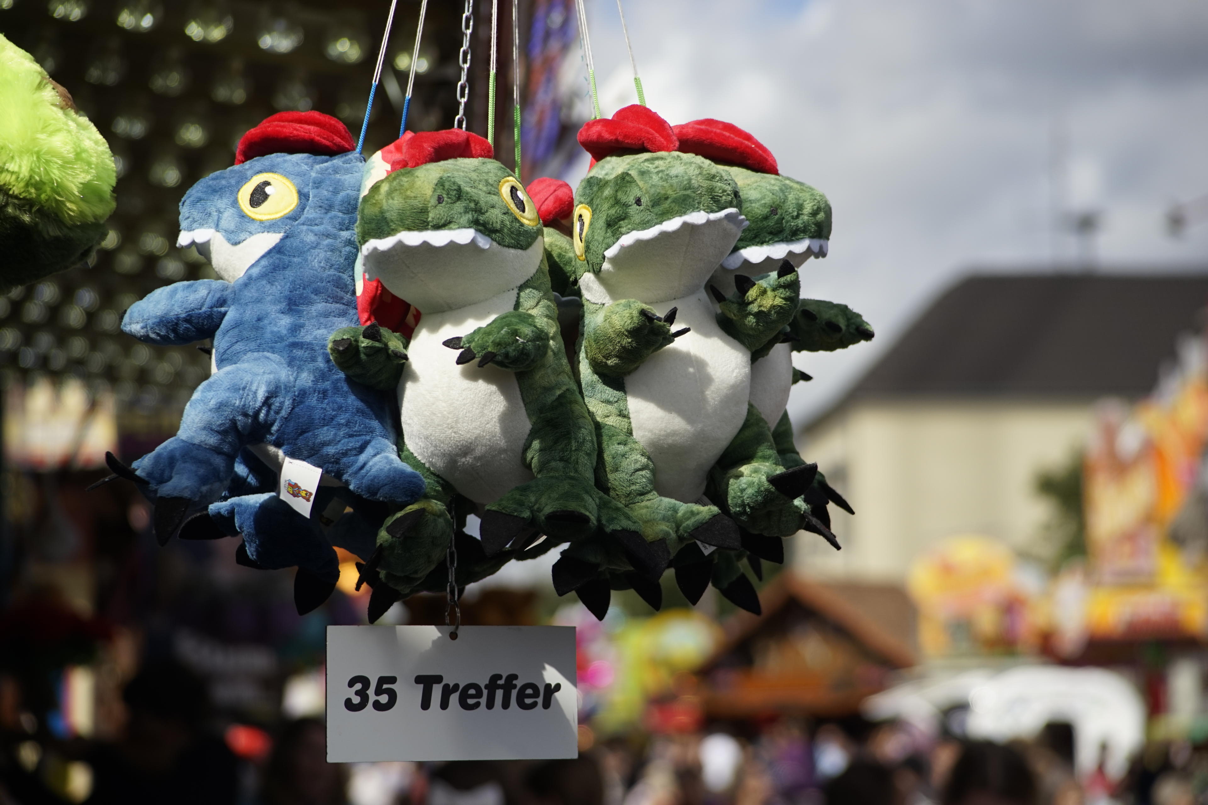 Und sollen das Dinos sein, die man da für 35 Treffer bekommen kann? Für mich sehen die aus wie die beiden Drachen aus Bubble Bobble. Aber ich glaube, ich bin der letzte Gen-X-Nerd, der sich noch an die beiden erinnert, deswegen bezweifle ich, dass es die in diesen rauen Mengen auf der Kirmes zu gewinnen gibt. Stattdessen ist sicher wieder irgendein Trend an mir vorbei gegangen... Bin jedenfalls ganz erstaunt, was das Objektiv doch für ein brauchbares Bokeh produziert, wenn man nur weit genug rein zoomt! Irgendwo im Internet hatte sich ja wer beschwert, dass das so altmodisch wäre. Pfff, mir doch egal! Finde noch immer, dass das eines der besseren Anschaffungen war.