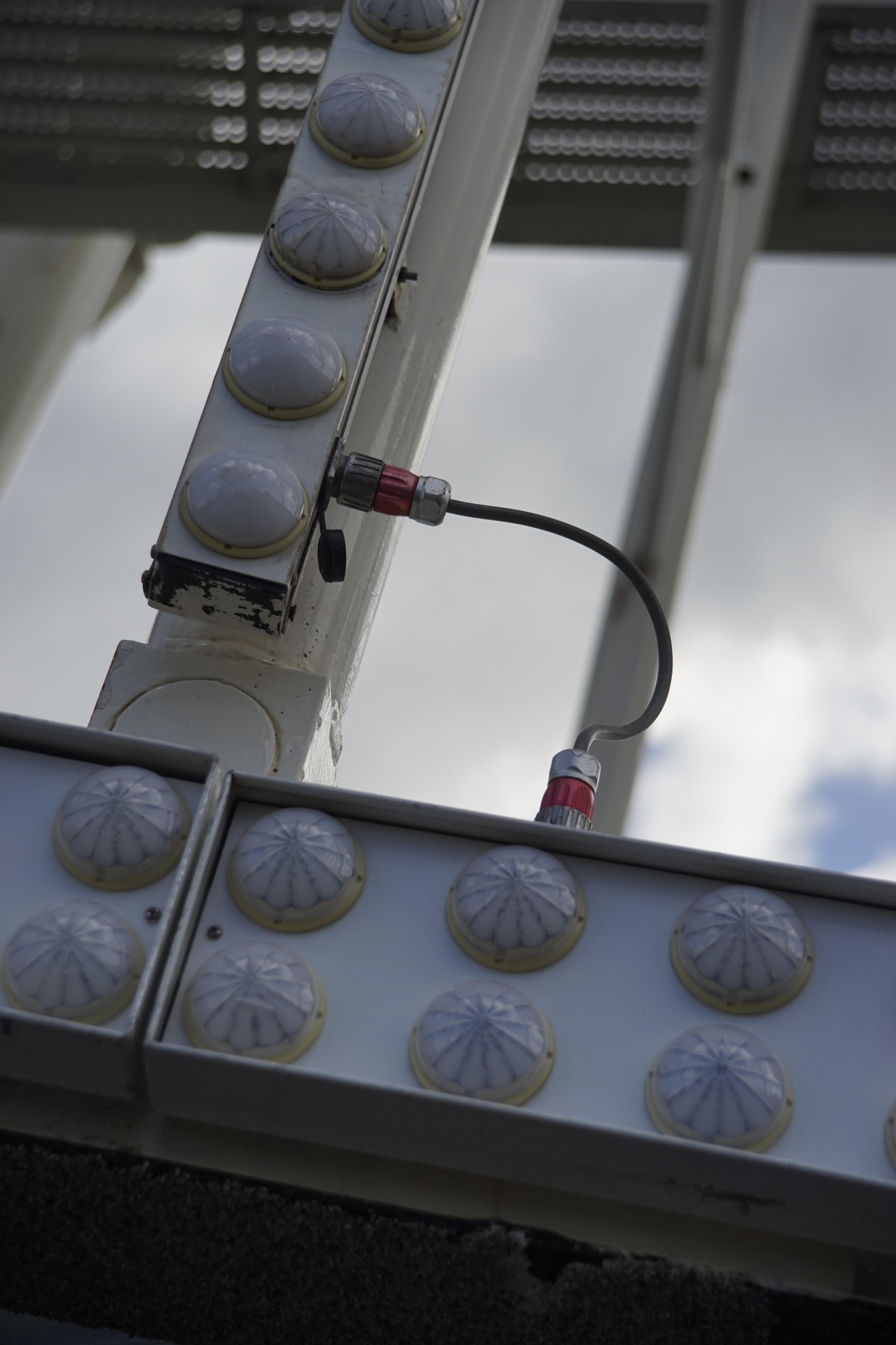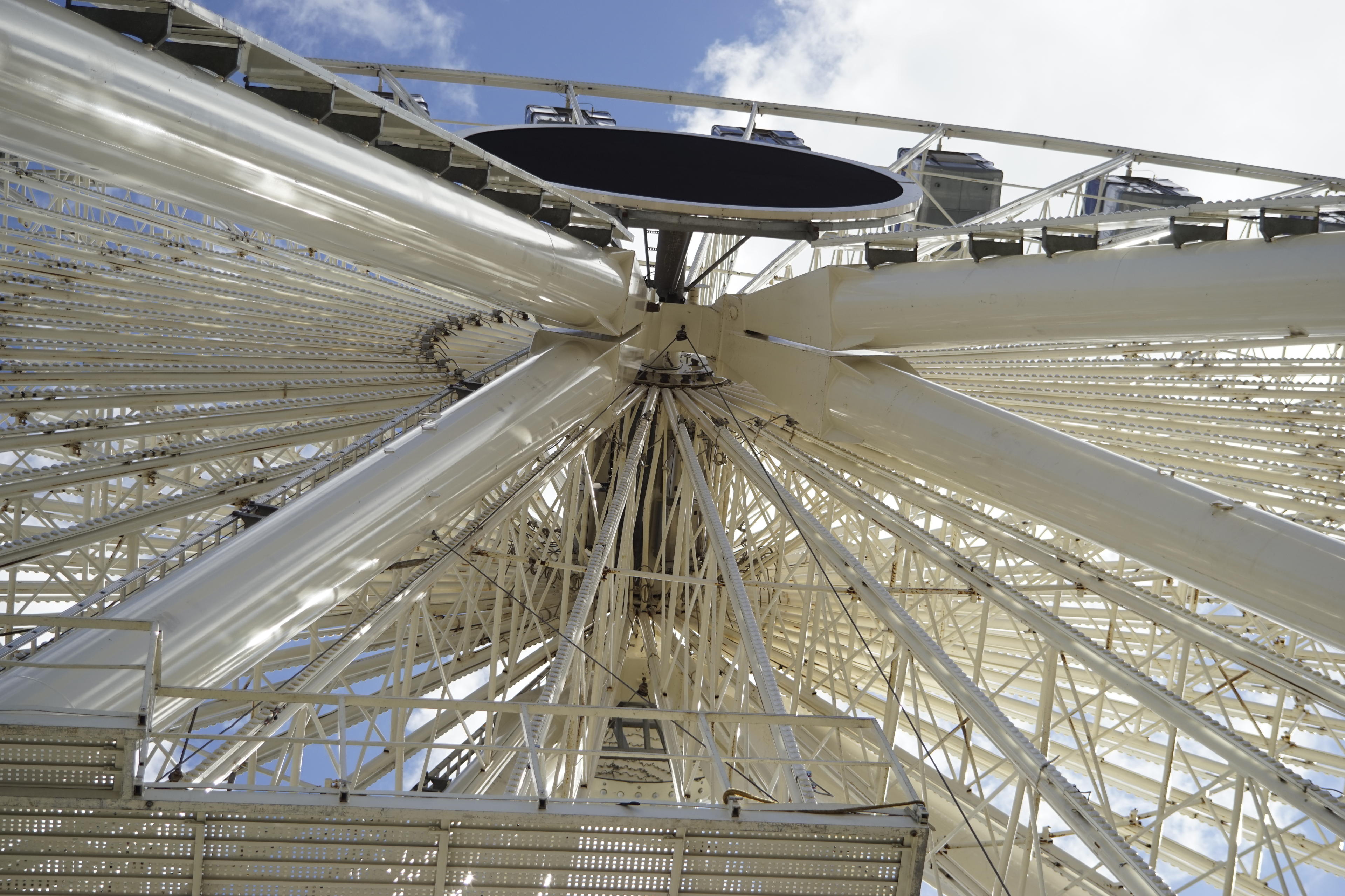 Keine Kosten, Mühen und Schlangen scheuend haben wir uns also in eine der Gondeln gequetscht. Der Ausblick von hier oben ist ja schon den Eintritt wert. Nur die blöden Plexiglasscheiben verzerren die Fotos so und nehmen auch einiges an Kontrast weg. Habe deswegen versucht, möglichst zwischen den Metallrohren der Türen hindurch zu fotografieren, aber das war nicht immer möglich. Vor allem, wenn ich die Kamera gleichzeitig im den Hals hängen haben wollte. Keinen Bock, die fallen zu lassen. Dafür macht die doch noch zu gute Fotos und war zu teuer! (Die war eh die beste Anschaffung dieses Jahr, glaube ich. Kaum ein Teil so viel benutzt wie die Sony Alpha 7. Die Nikon ist schon ganz eifersüchtig!