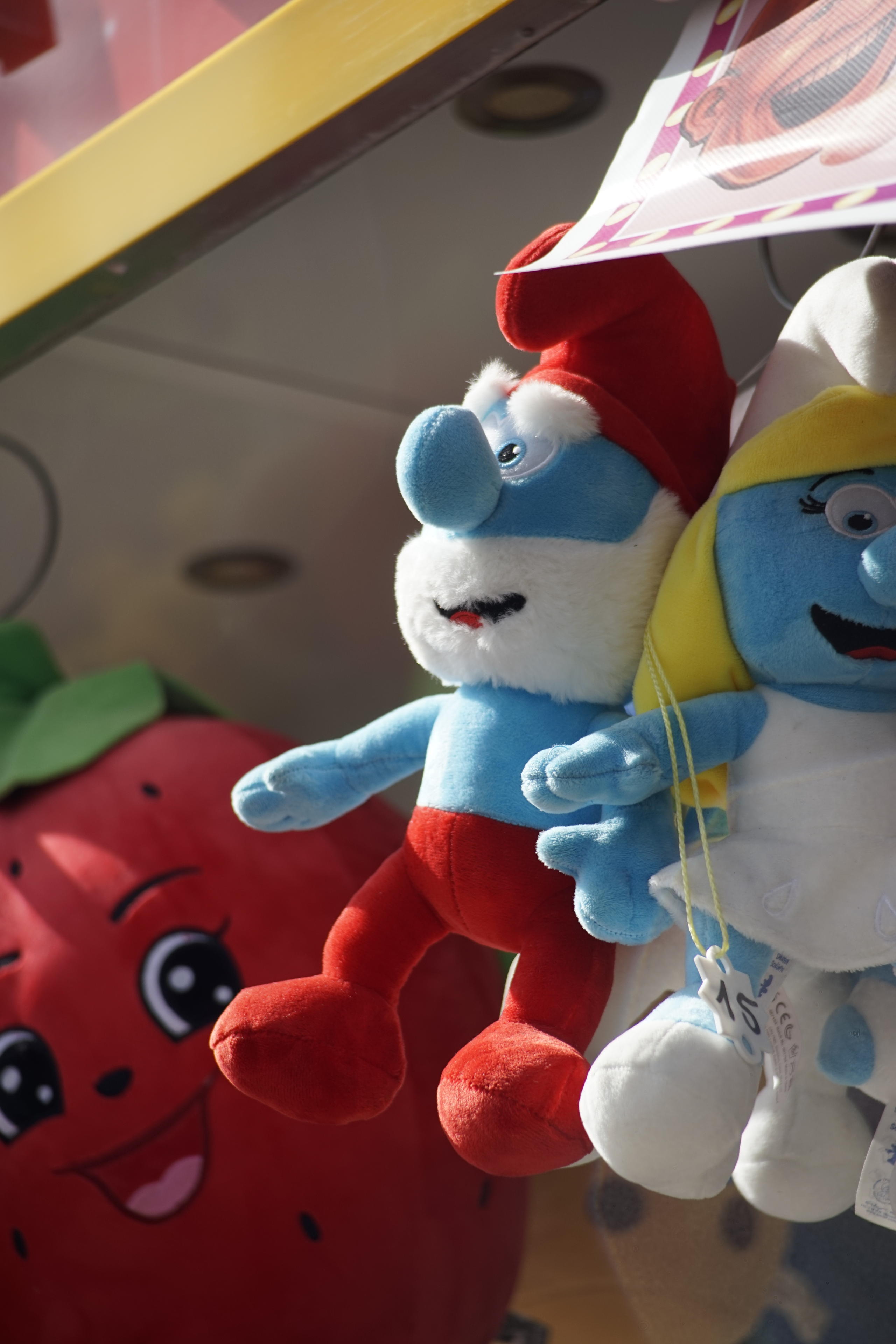 Wieder unten angekommen, habe ich mich direkt wieder in das Getümmel gestürzt und die Auslagen fotografiert, wie die Schlümpfe. (J ist ja schließlich noch immer der Papa Schlumpf des Trekdinners.) Und die bekiffte Blume. Und den gestoneten Tiger. Und die Lafufus. Ich bin ja noch immer der Meinung, dass die aussehen, als wollten sie mein Haus anzünden und mein Auto klauen. Irgendwie auf Krawall gebürstet. Und dann hingen da auch noch überall diese kleinen braunen Scheißewürstchen rum. Ist das dieses... Ding... aus Minecraft, das einen verklöppen kommt? Ich kenn' mich doch nicht aus! Ich bin doch hoffnungslos veraltet! Auf'm Rummel merk ich das immer ganz besonders! Ich kann ja gerade mal einen alten 911er Targa erkennen und weiß, wer Fury ist! Das ist so meine Generation!